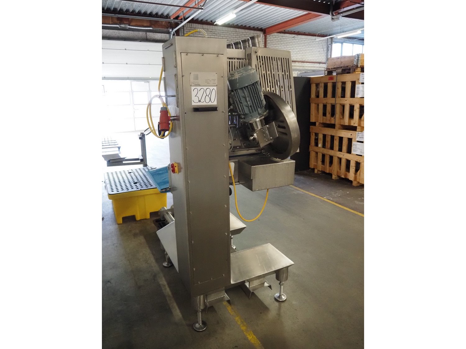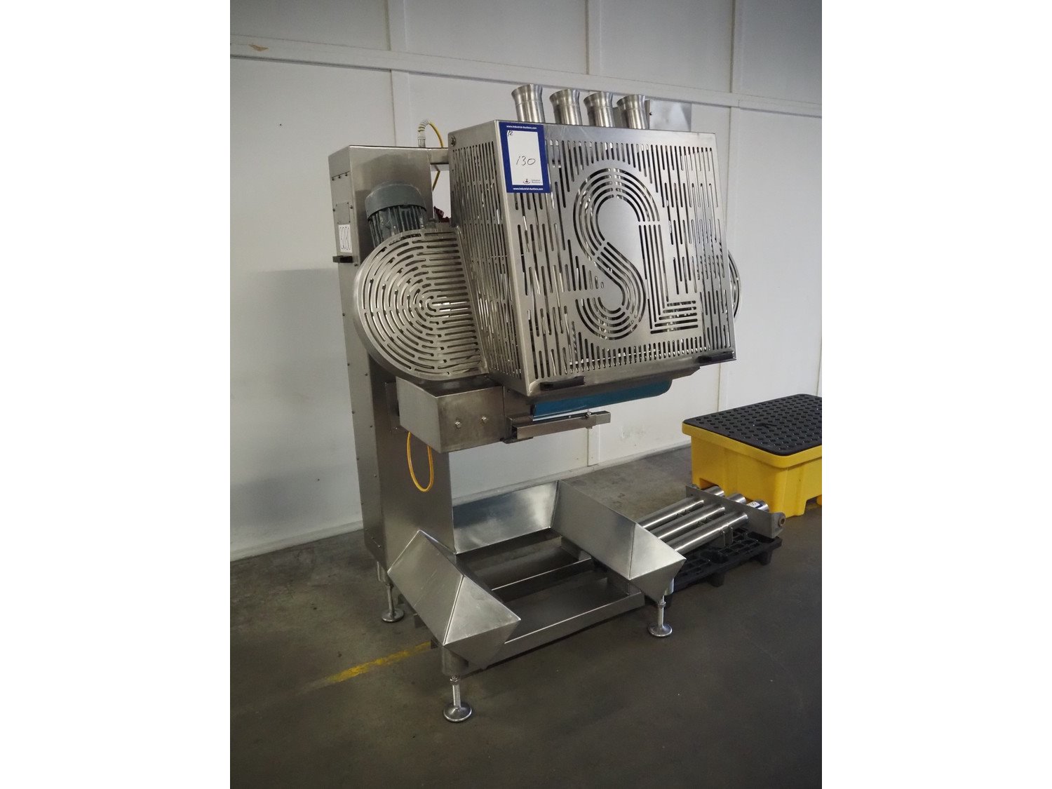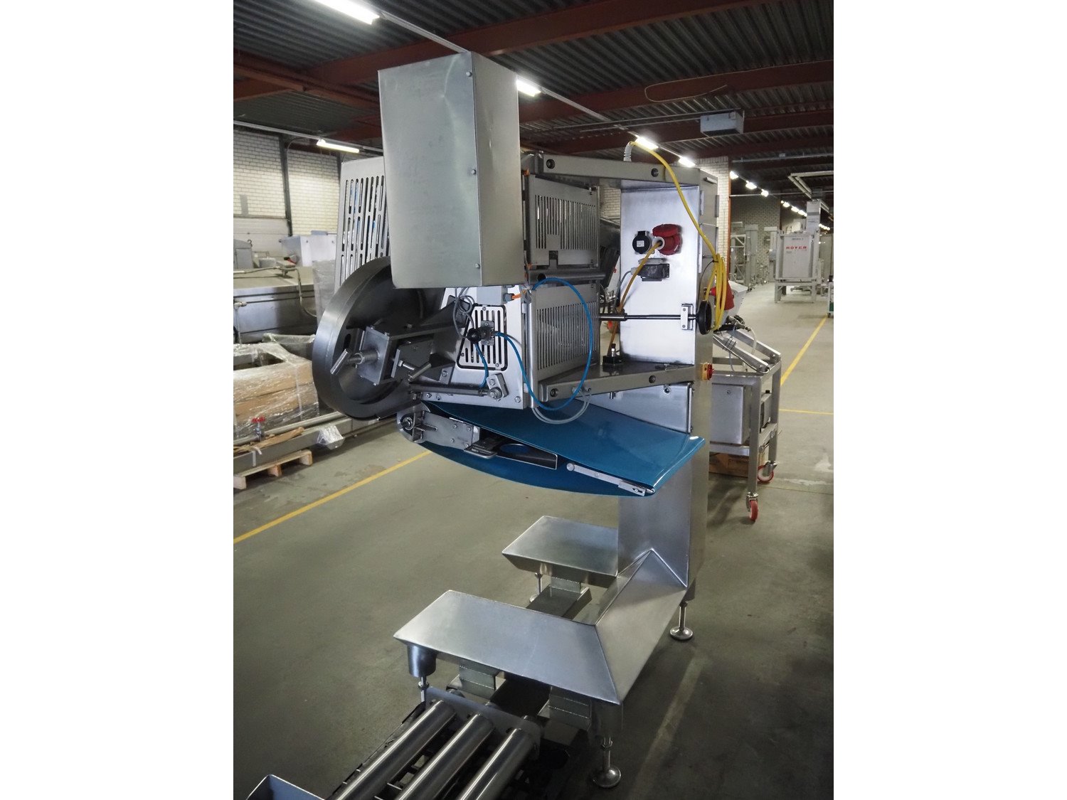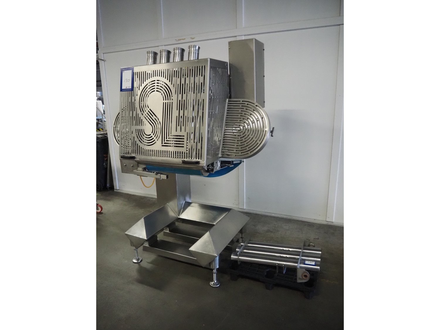 Selo slicer/applicator, machine type: SL Slicer, number: 017, year of construction: 2004, 400 V, 50 Hz, 4 kW, dye: (4x) Ø 80 mm, capacity: max 200 strokes/min, cutting thickness: maximum 20 mm, belt width: 565 mm, weight: 750 kg, total dimensions: 1700 mm x 1200 mm x 2150 mm, including pallet with extra forms, dye: (3x) 95 mm x 45 mm.