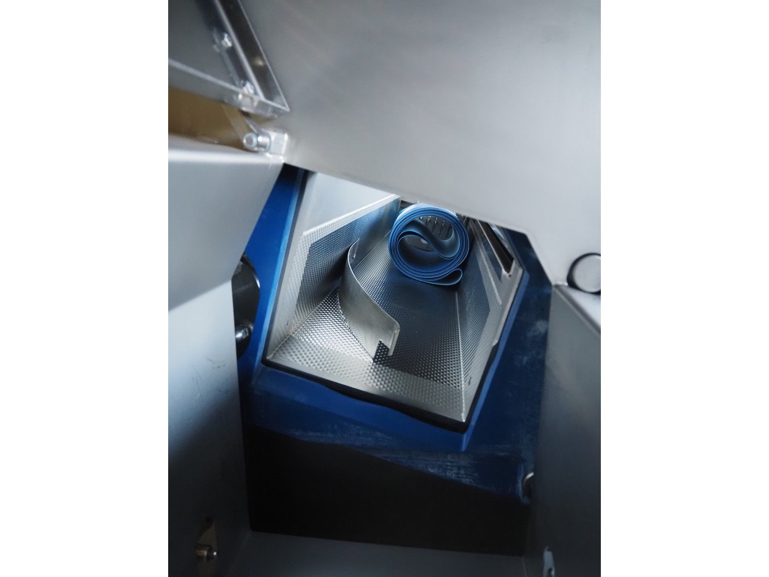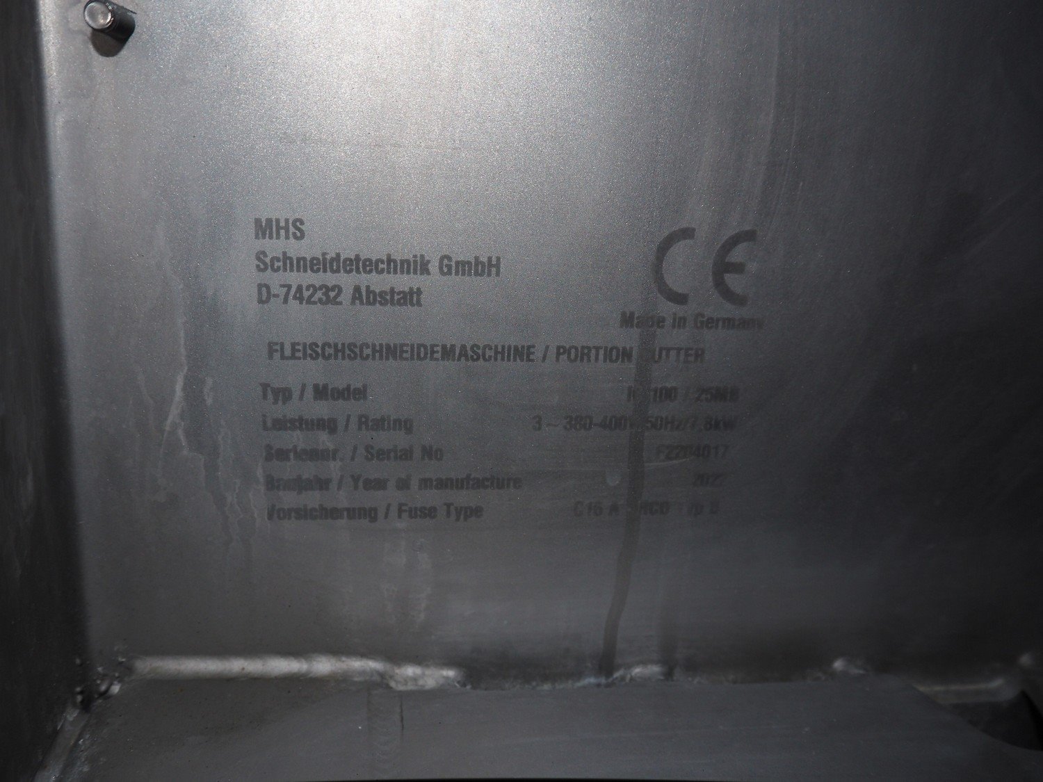 MHS Schneidetechnik GmbH slicer, type: IC 100/25MB, serial number: F2204017, year of construction: 2022, 380-400 V, 3 Ph, 50 Hz, 7.8 kW, clearance: 250 mm x 235 mm, chamber length: 1100 mm, belt width: 290 mm, slice thickness: 0.5-500 mm, total dimensions: 3600 mm x 900 mm x 1350 mm.