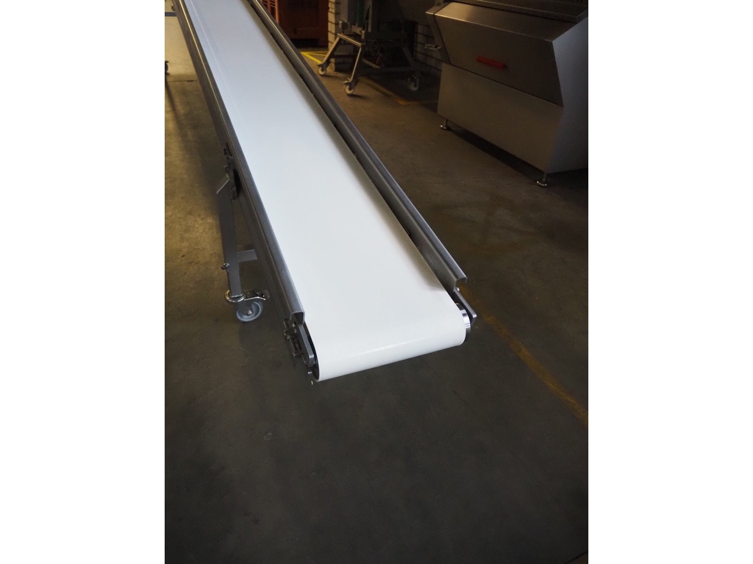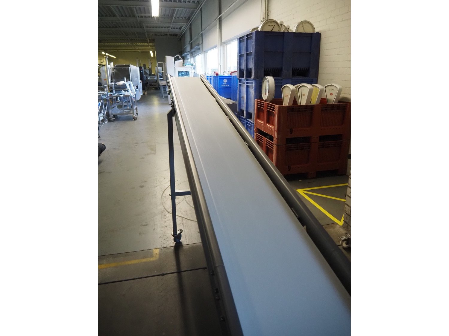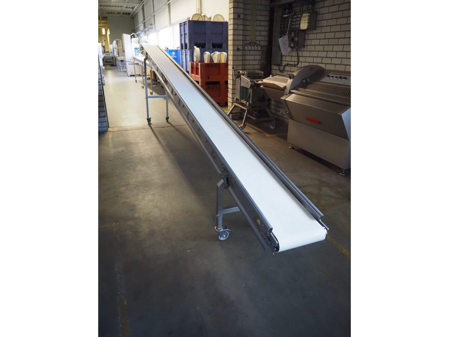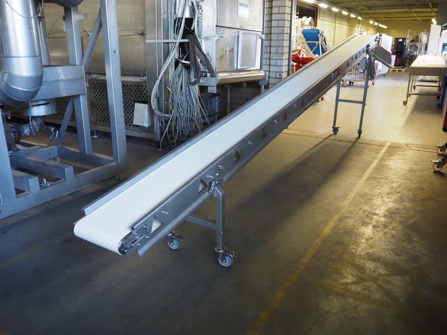Ellegaard mobile elevating belt, s/s frame, plastic belt, belt width: 290 mm, elevating height: from 500 mm till 1530 mm, total dimensions: 5900 mm x 600 mm x 1530 mm.