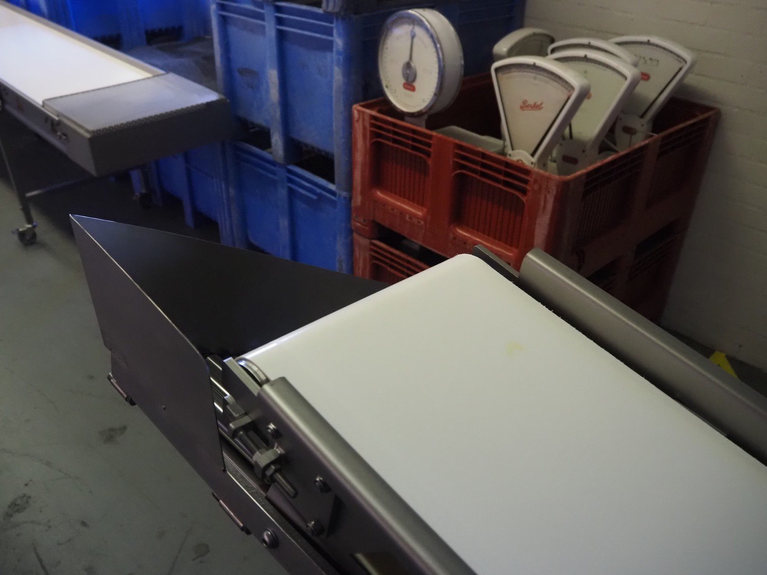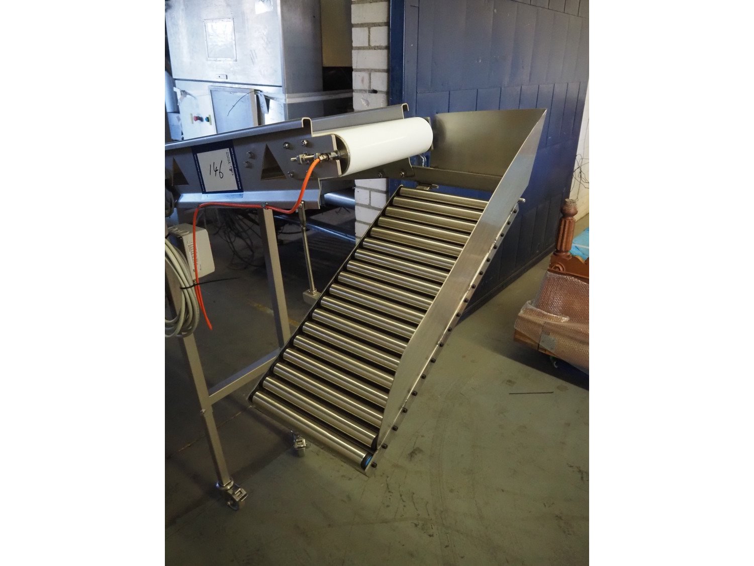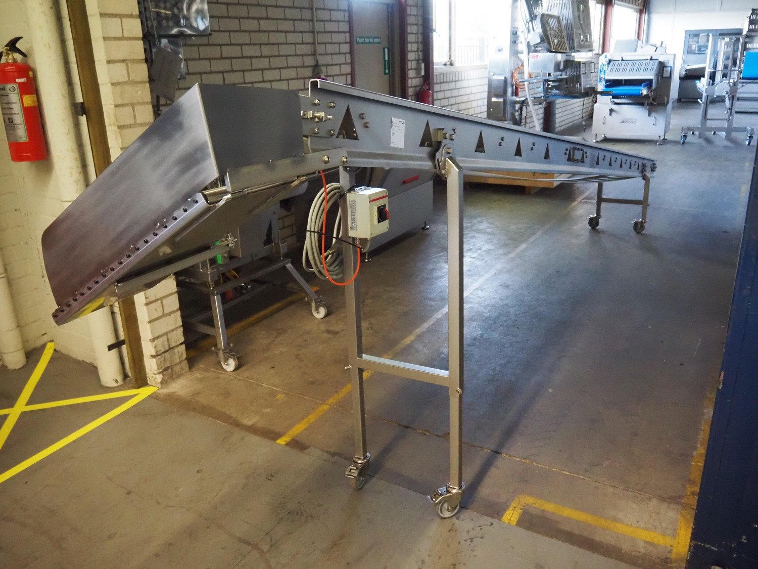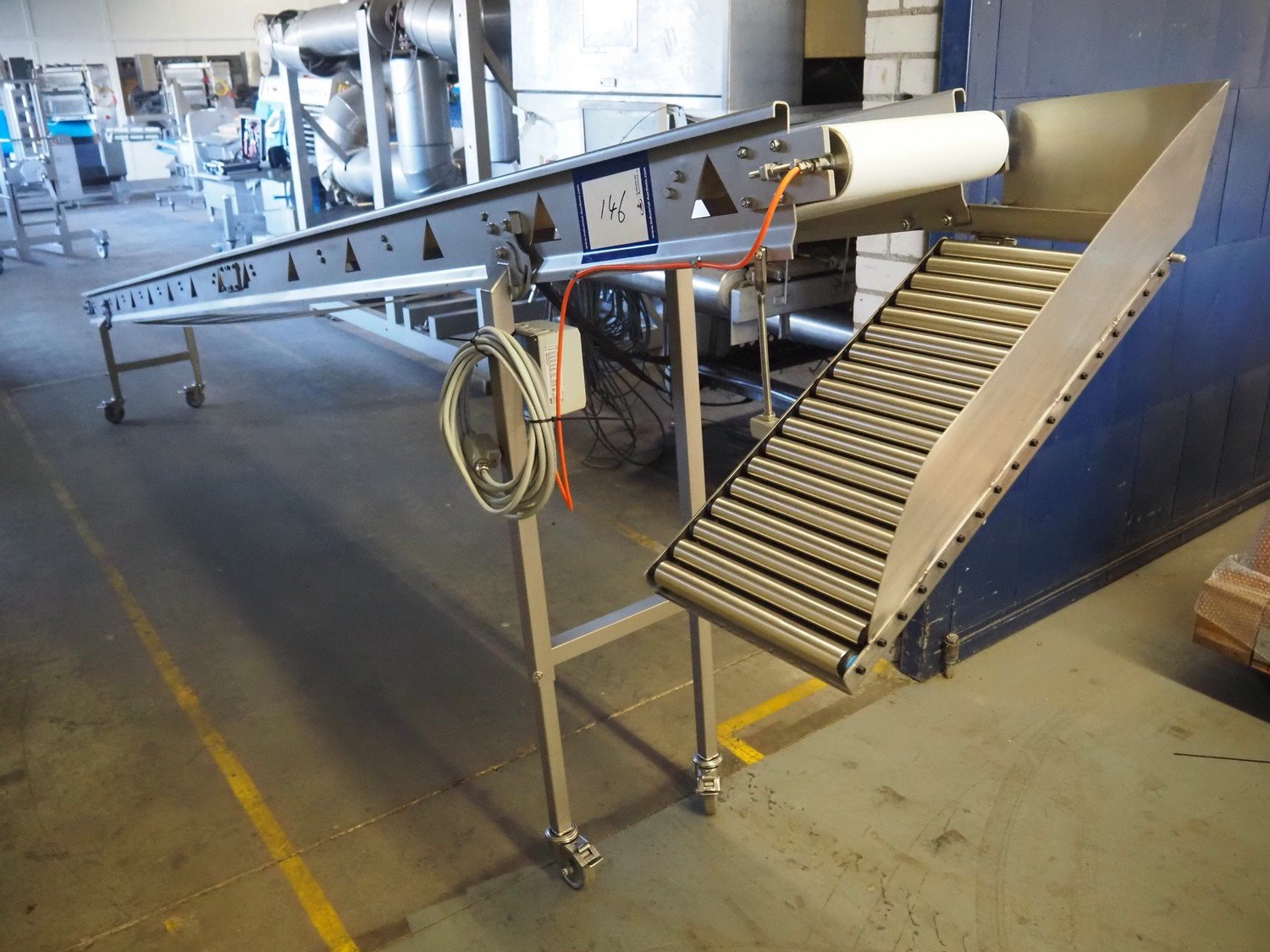 Ellegaard mobile elevating belt, s/s frame, plastic belt, belt width: 290 mm, elevating height: from 500 mm till 1530 mm, total dimensions: 5900 mm x 600 mm x 1530 mm.