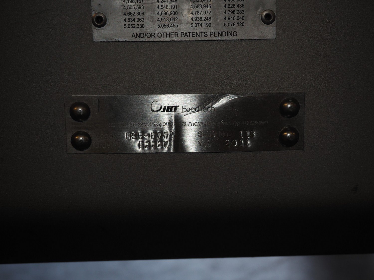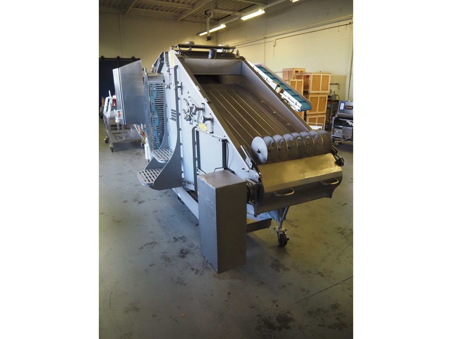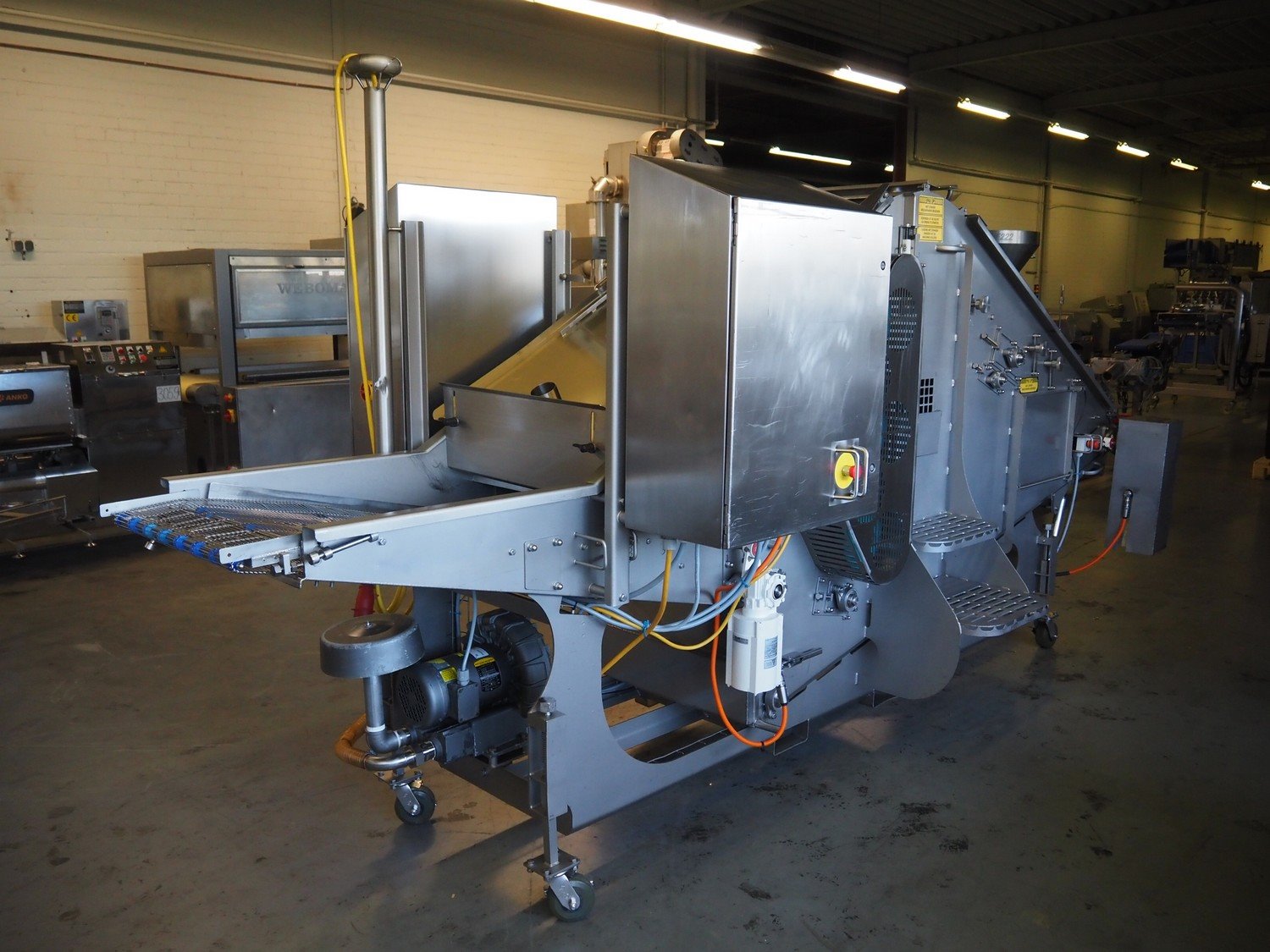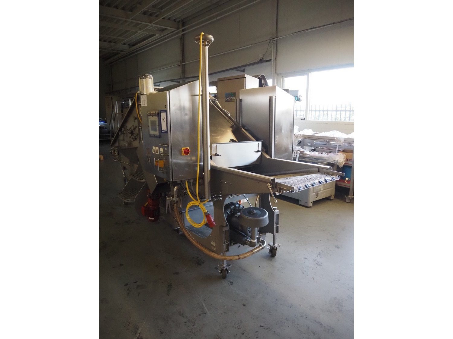 JBT FoodTech mobile homestyle breader, model: HSB-600, serial number: 118, 380 V, 3 Ph, 50 Hz, 24.5 A, s/s belt width: 630 mm, weight: 1600 kg, total dimensions: 4400 mm x 1700 mm x 2250 mm.