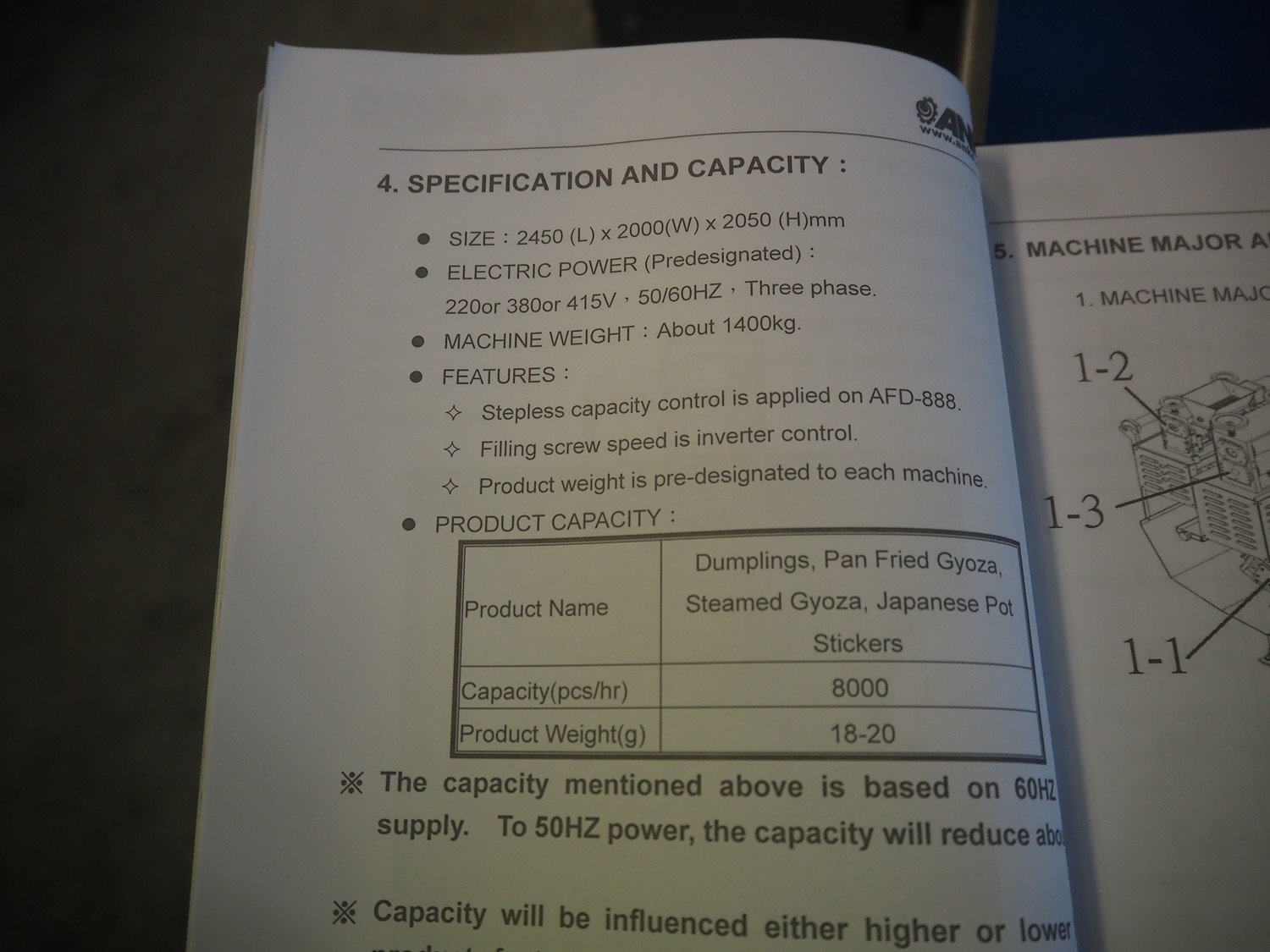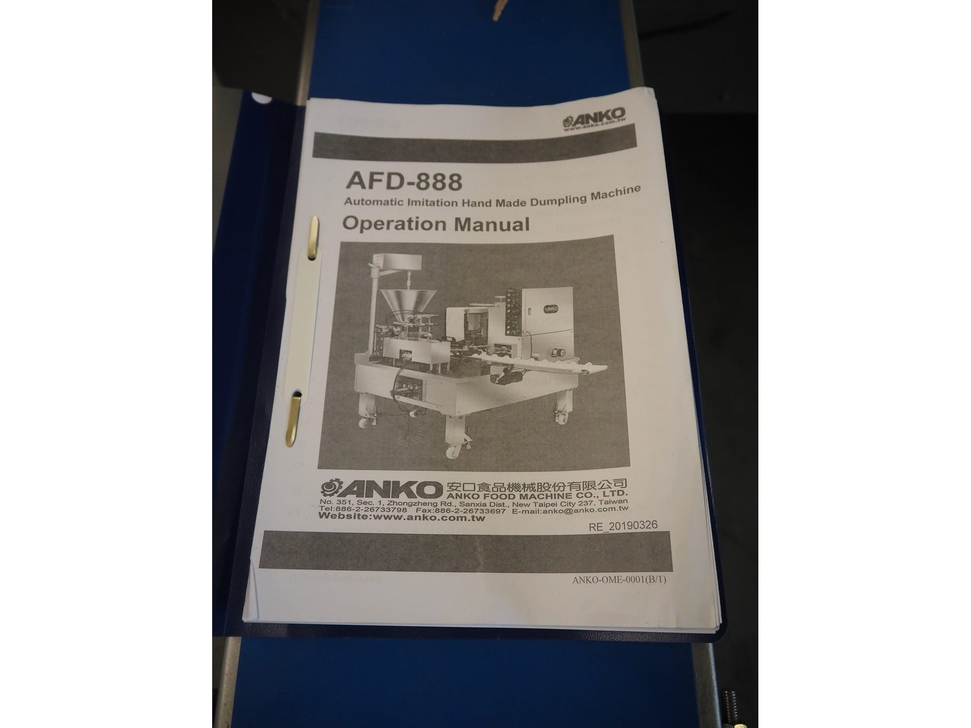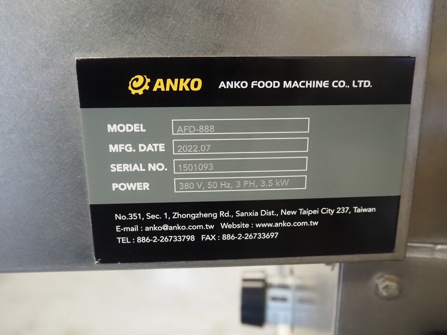 Anko Food Machine Co., LTD. gyoza dumpling machine, model: AFD-188, serial number: 1501093, year of construction: 2022, 380 V, 3 Ph, 50 Hz, 3.5 kW, capacity: 6000 pieces per hour, hopper volume: 46 liters, weight: 1400 kg, total dimensions: 2450 mm x 2000 mm x 2050 mm.