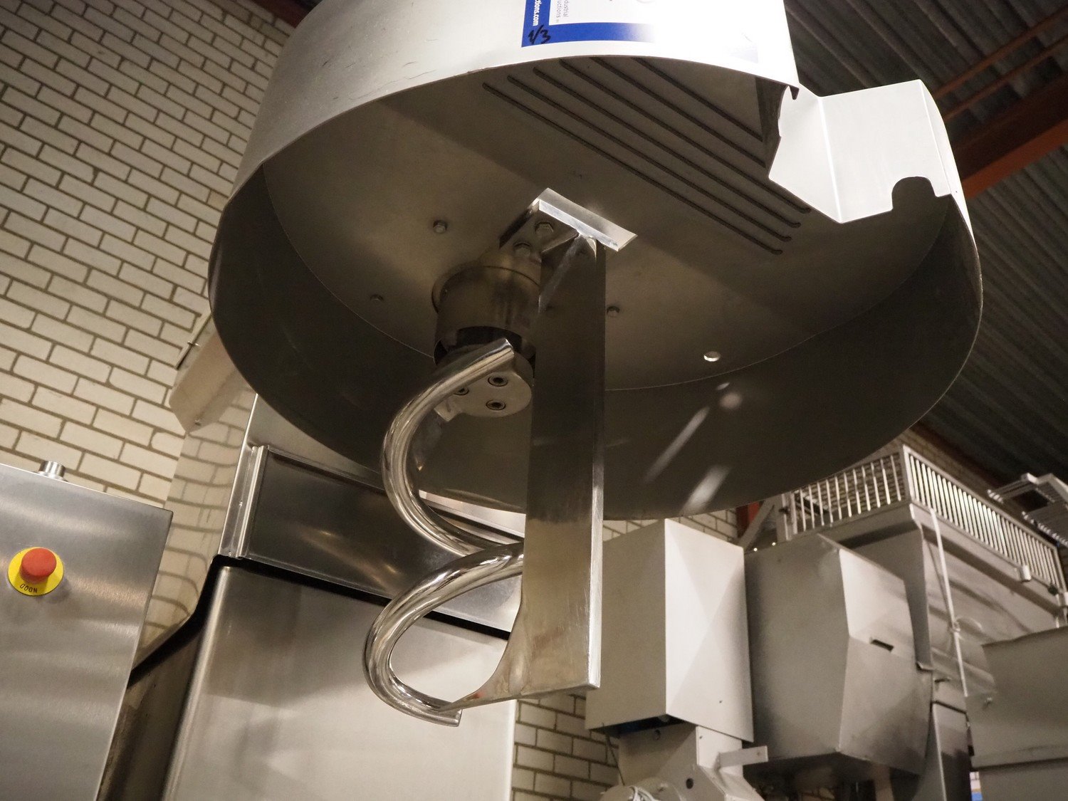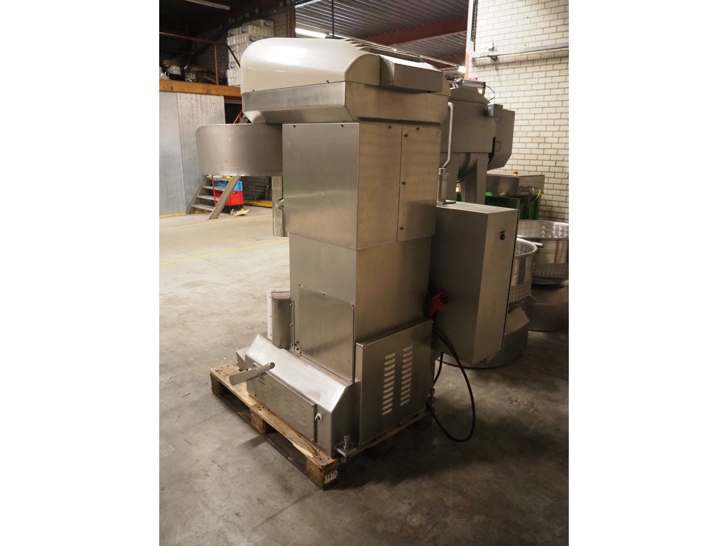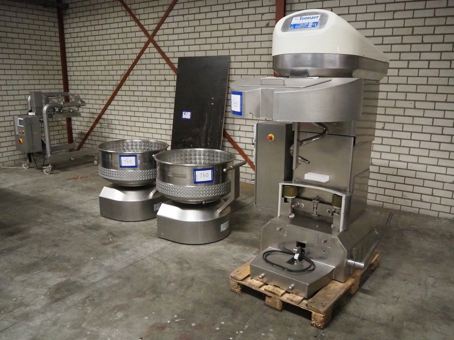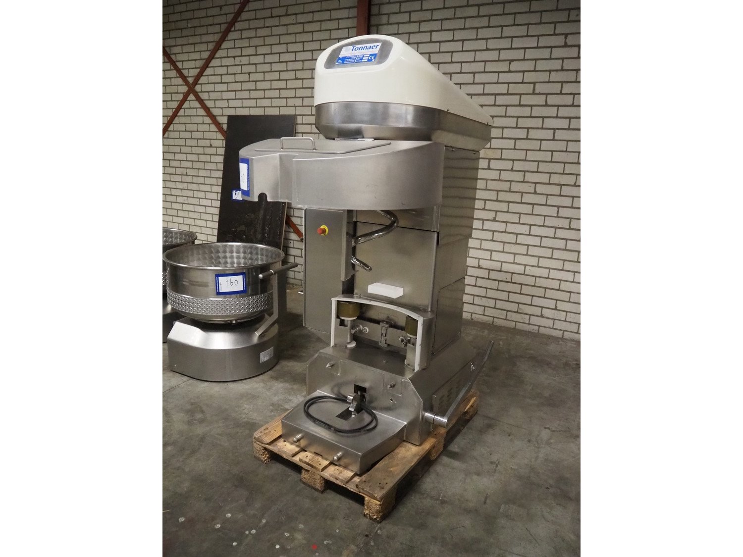 Tonnaer spiral mixer for dough, dimensions: 1700 mm x 1100 mm x 1900 mm. Including 2 s/s mobile bowls, inside dimensions: (2x) ø 800 mm x 400 mm, total dimensions: 950 mm x 850 mm x 850 mm.