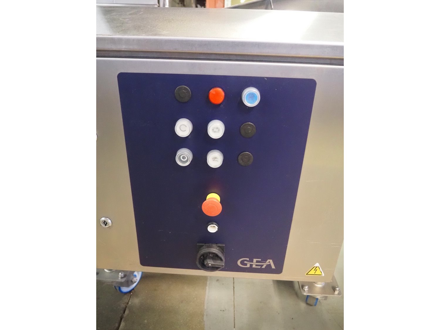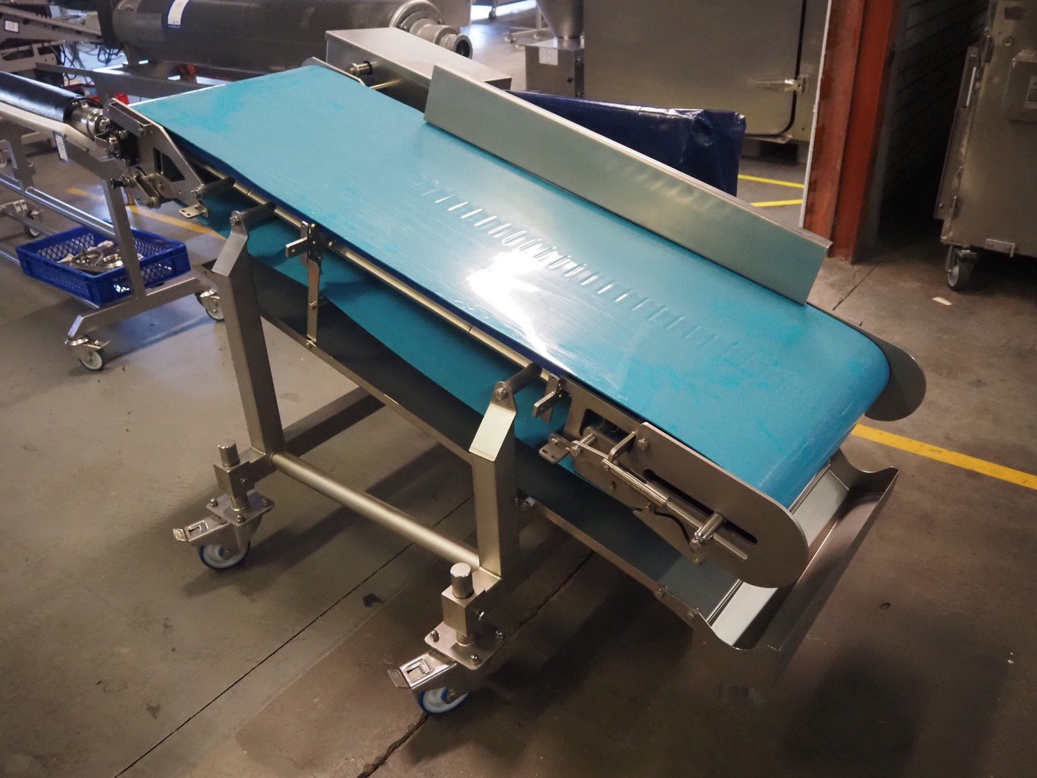 GEA/Hellings Machinebouw B.V. mobile elevating belt, s/s frame, plastic belt, year of construction: 2018, belt width: 600 mm, elevating height: from 600 mm till 1050 mm, total dimensions: 1800 mm x 1100 mm x 1100 mm.