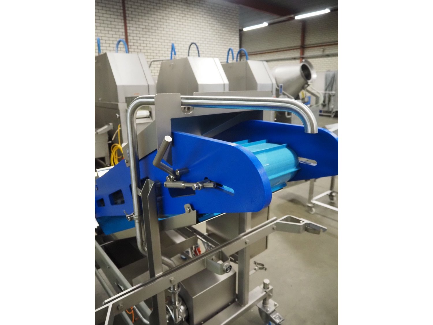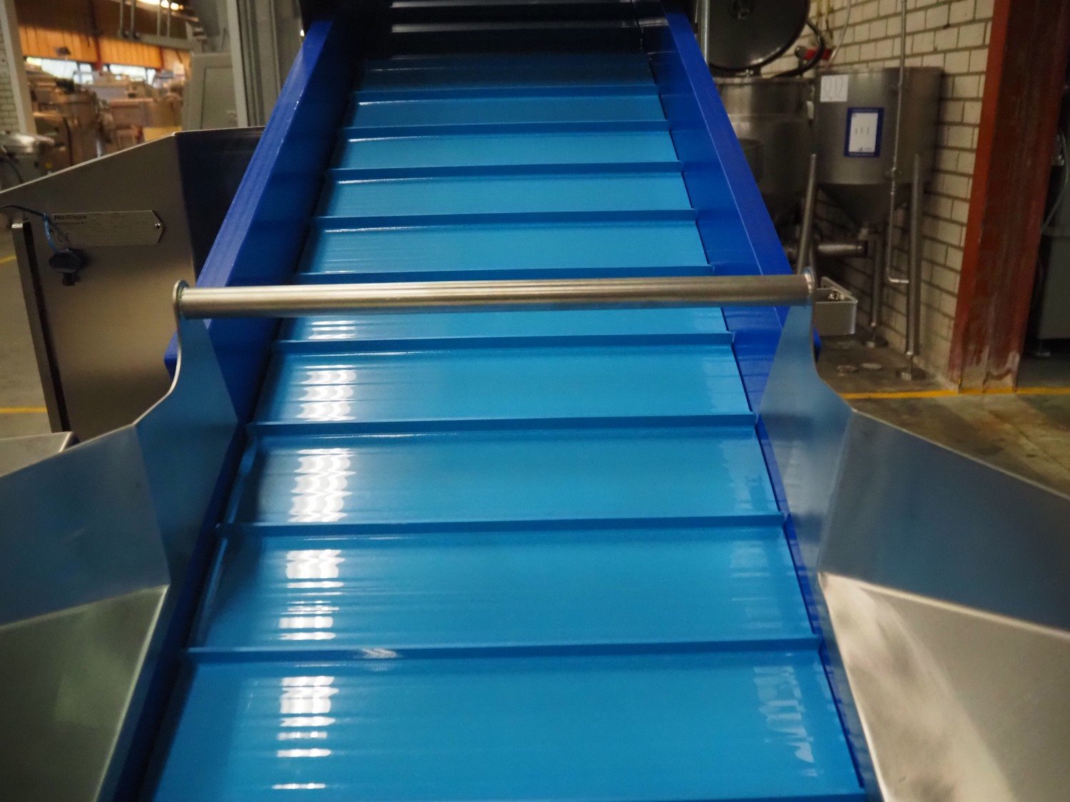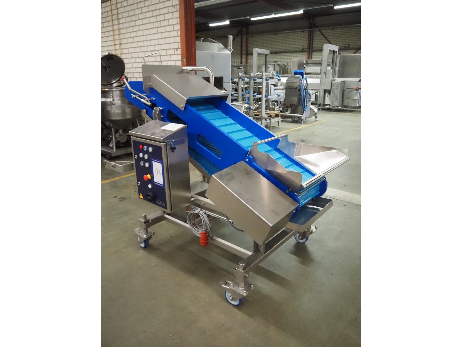 GEA/Hellings Machinebouw B.V. mobile elevating belt, s/s frame, plastic belt with dividers, belt width: 400 mm, distance between dividers: 100 mm, divider height: 15 mm, elevating height: from 135 mm till 750 mm, total dimensions: 1900 mm x 1250 mm x 1550 mm.