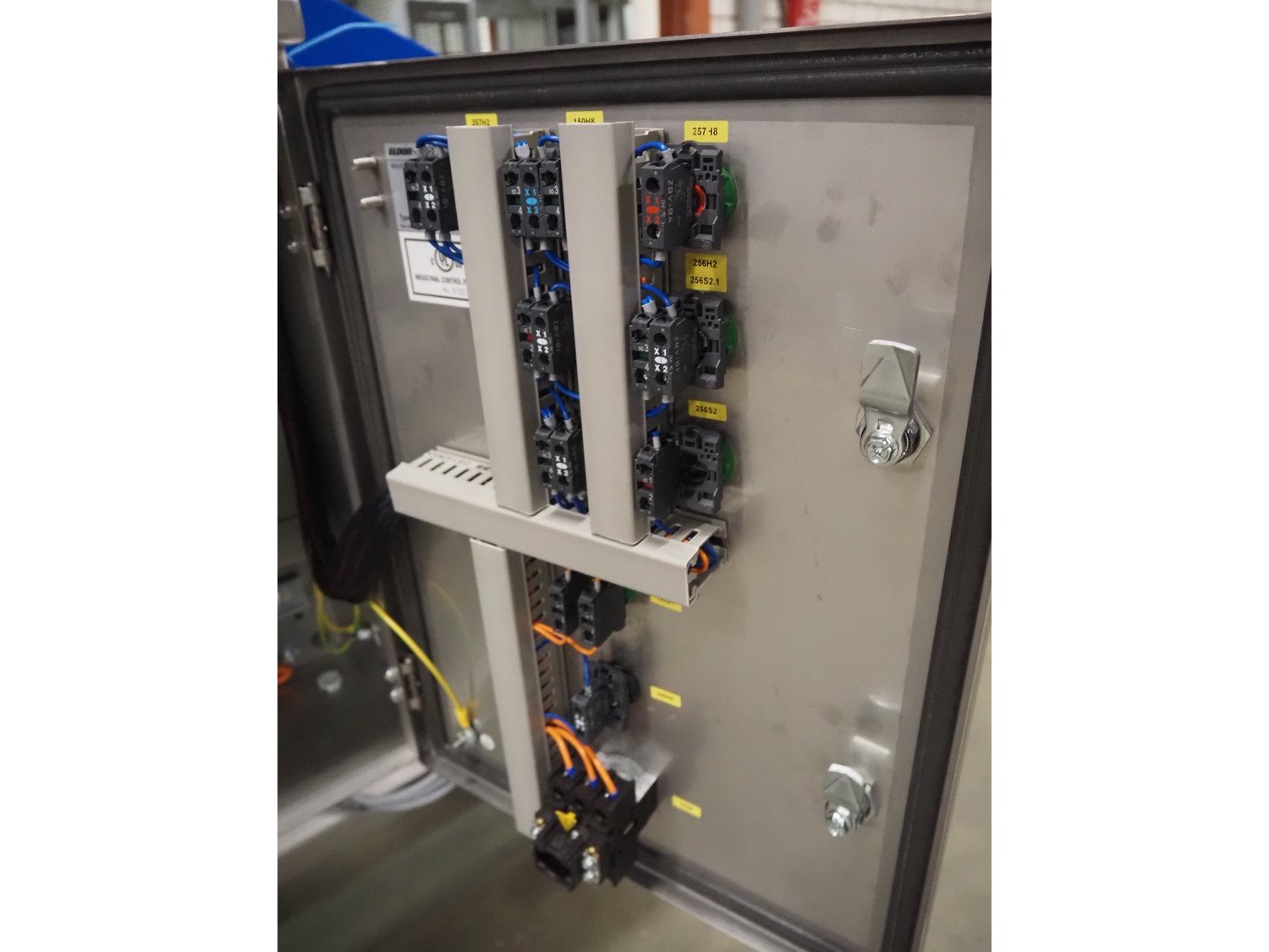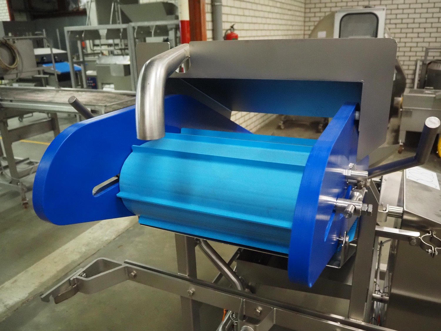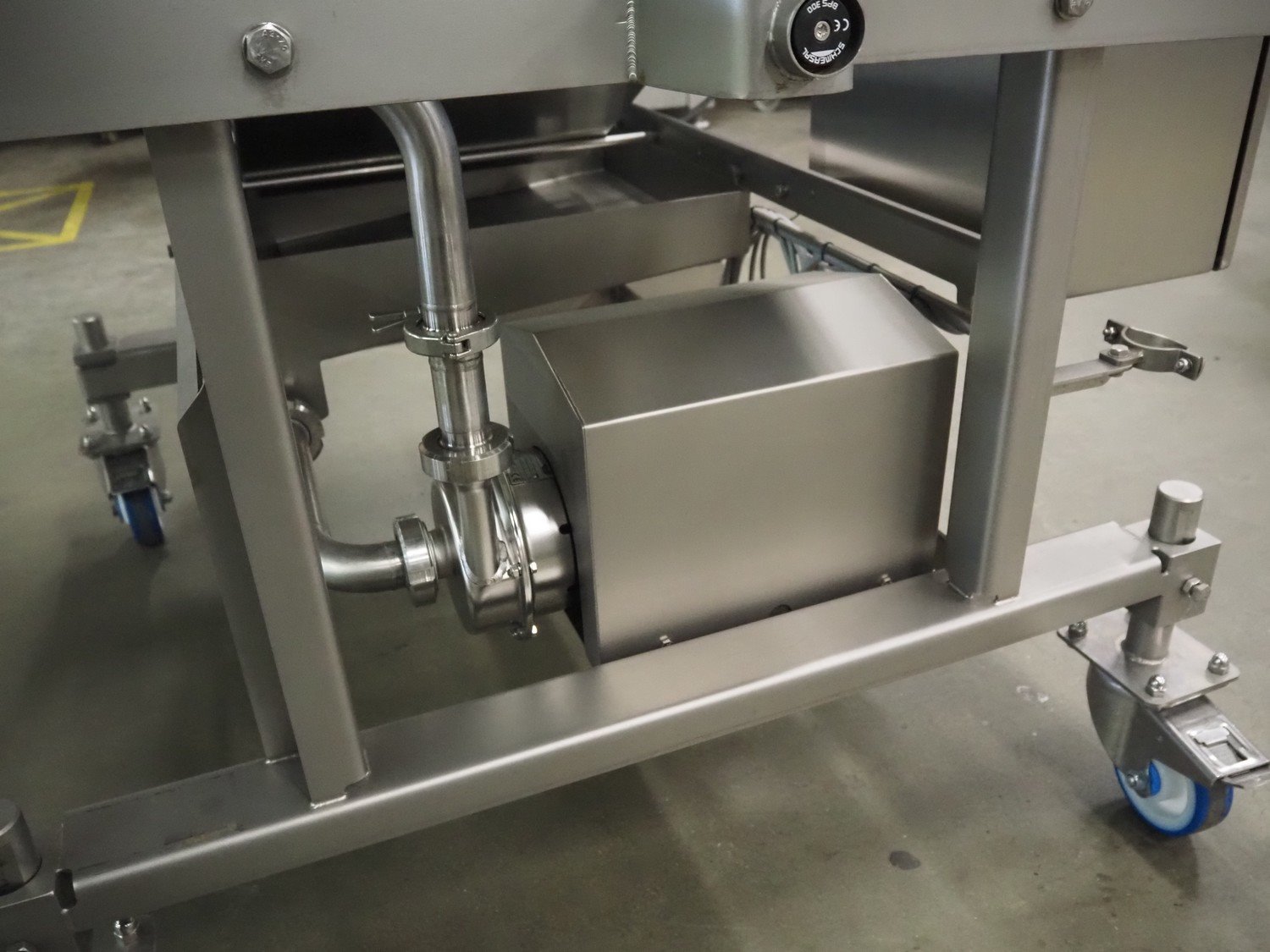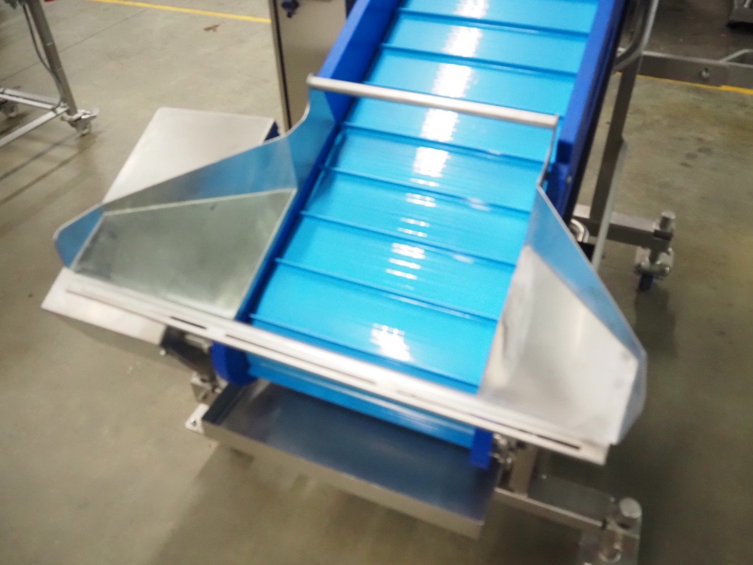GEA/Hellings Machinebouw B.V. mobile elevating belt, s/s frame, plastic belt with dividers, belt width: 400 mm, distance between dividers: 100 mm, divider height: 15 mm, elevating height: from 135 mm till 750 mm, total dimensions: 1900 mm x 1250 mm x 1550 mm.