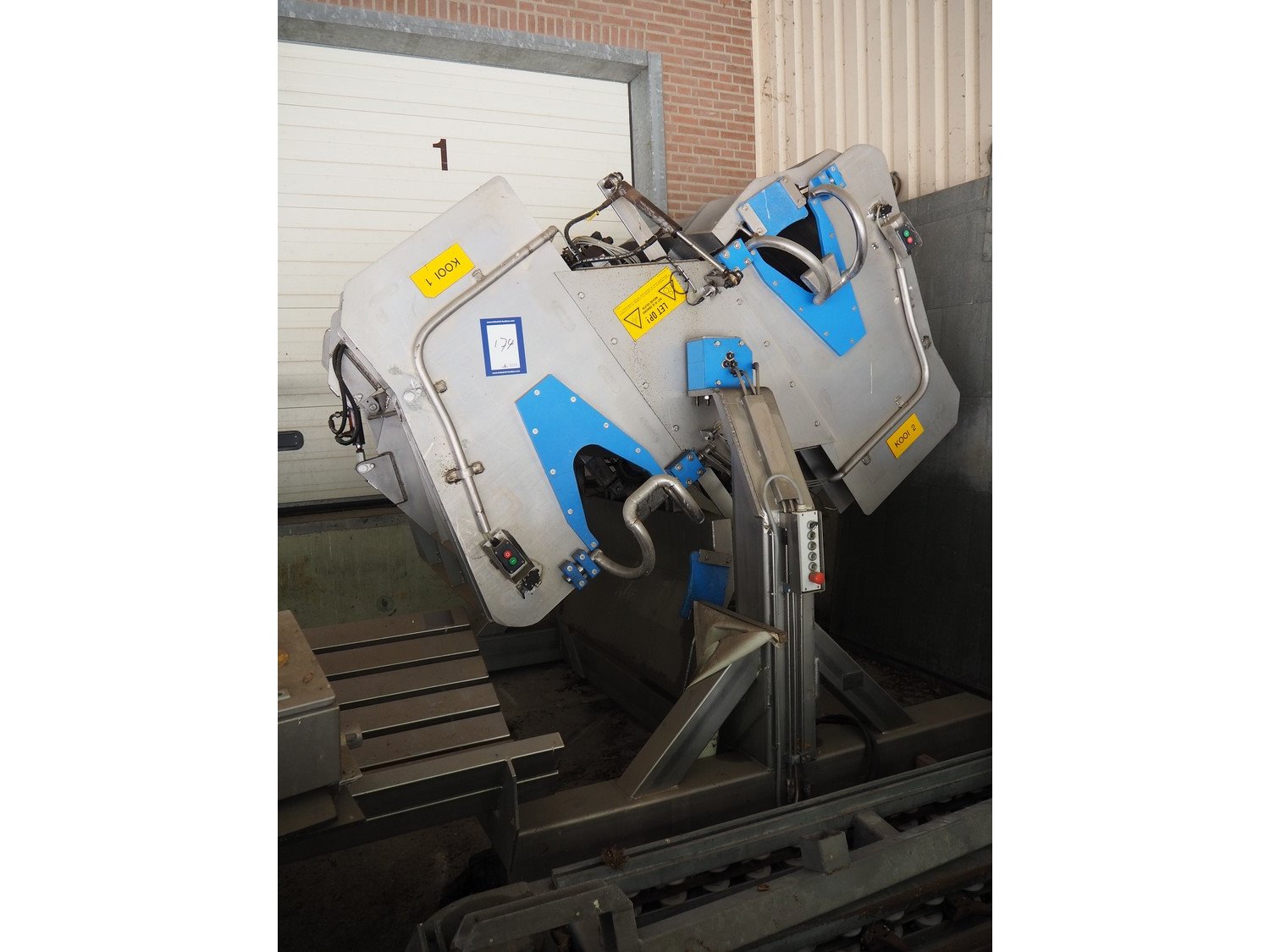 Nawi B.V. double s/s rotating ritual slaughtering box for calves, type: 18000, year of construction: 2007, dimensions slaughtering box: 2600 mm x 3200 mm x 3000 mm, Nawi hydraulic unit, dimensions: 700 mm x 650 mm x 1000 mm, control panel, dimensions: 380 mm x 220 mm x 600 mm, dimensions switch cabinet: 770 mm x 300 mm x 770 mm, including various tube rail elevators and hanging table.