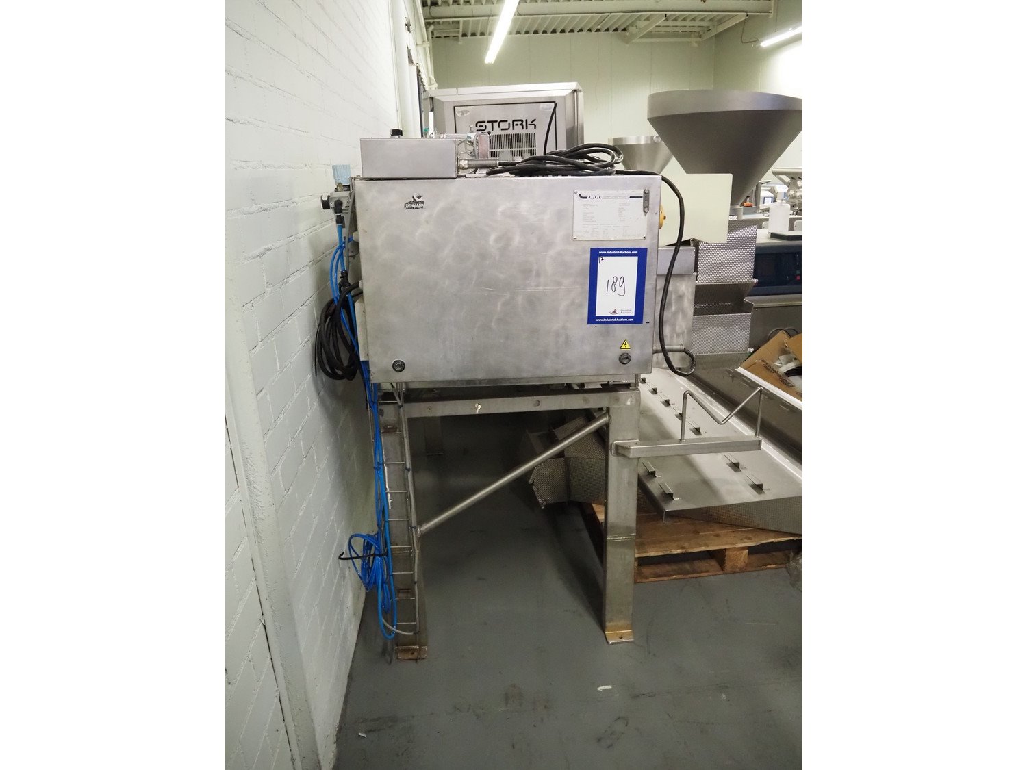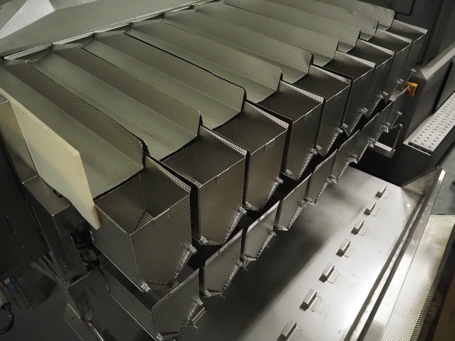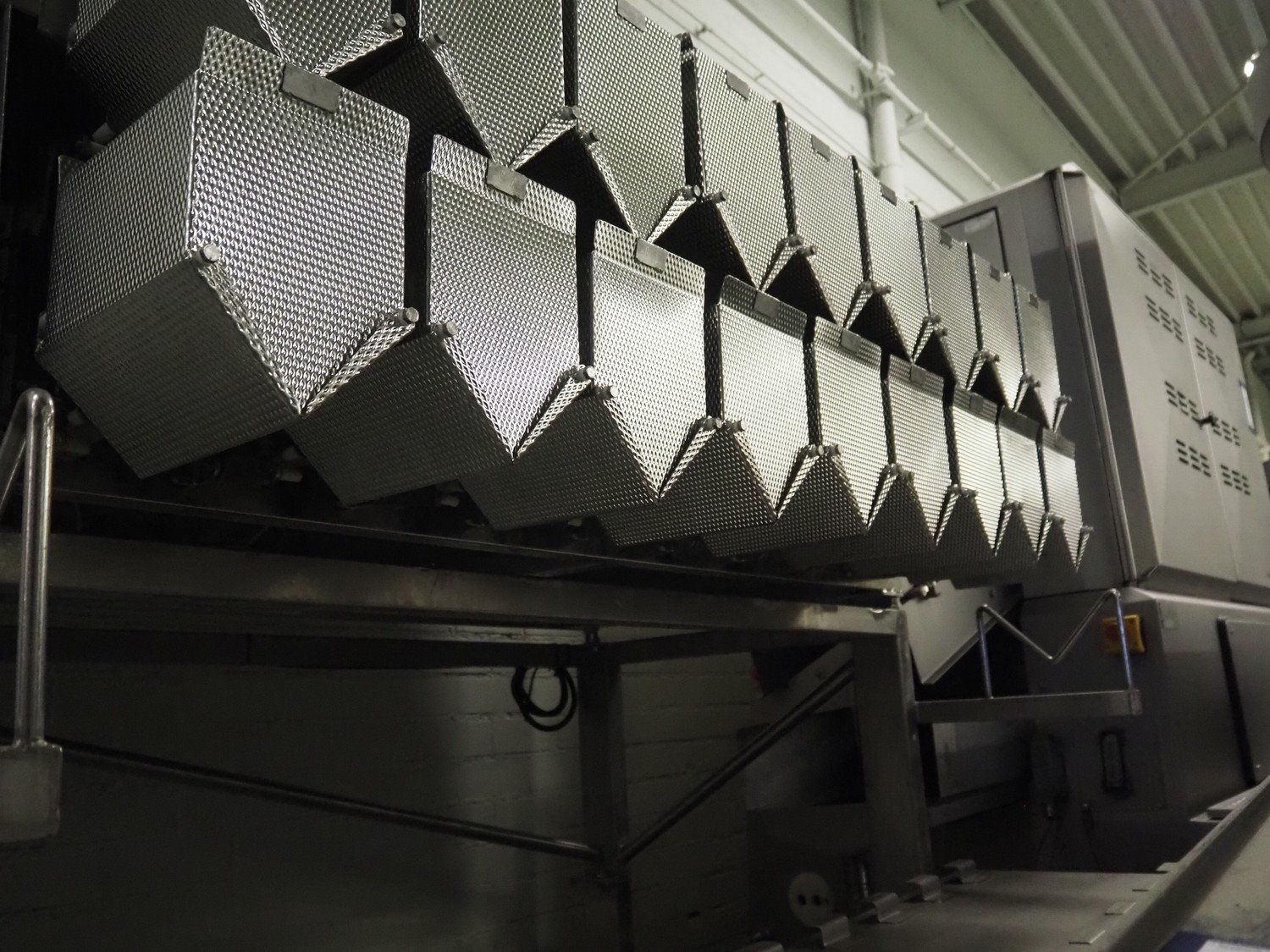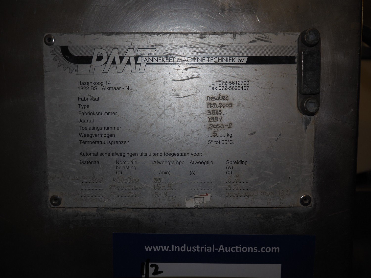 Newtec 9-lanes batch weigher, type: PCB 2009, factory number: 3889, year of construction: 1997, weighing capacity: 5 kg, temperature range: 5° C - 35° C, 9 lanes, lane width: 165 mm, total dimensions: 1920 mm x 1250 mm x 1770 mm. Including outfeed funnel, dimensions: 800 mm x 350 mm x 1500 mm and s/s rack for weighing bins, dimensions rack: 1700 mm x 300 mm x 680 mm.