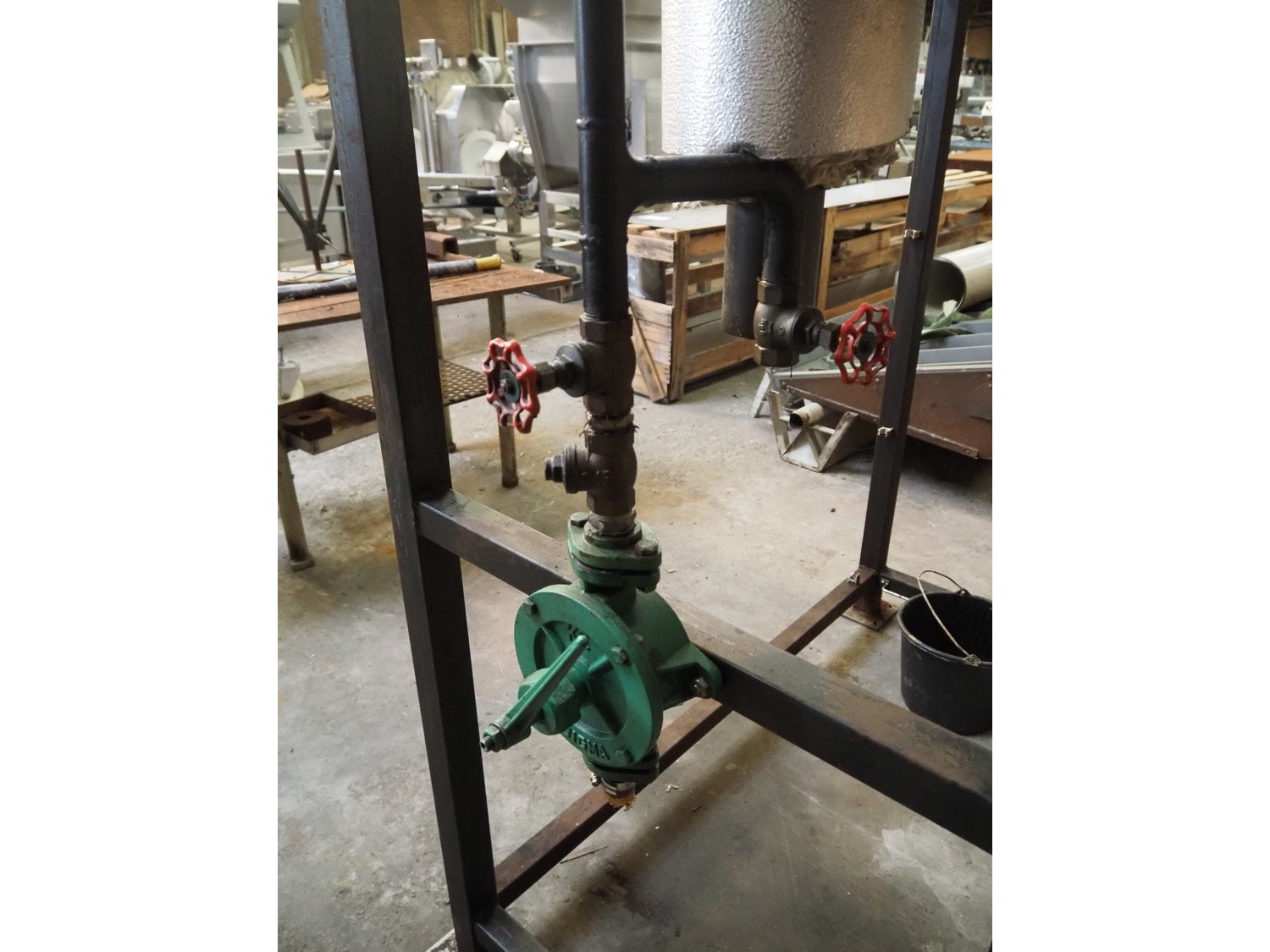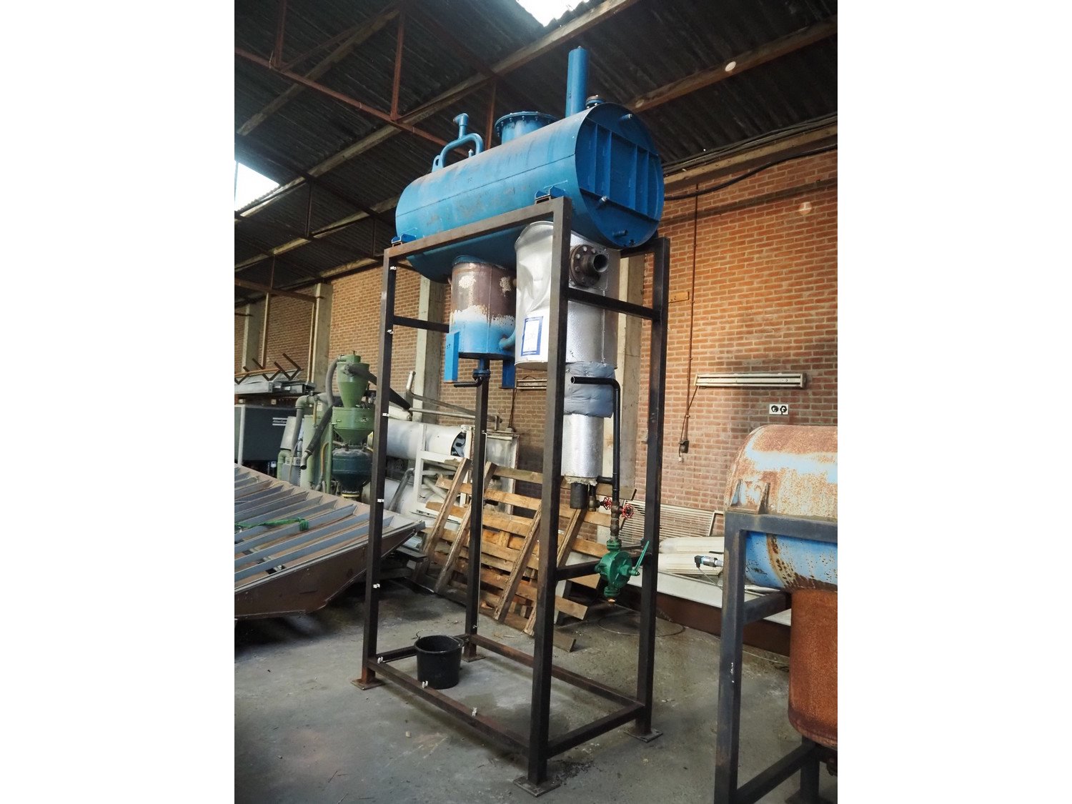 Steel vessel for steam boiler on steel frame, used to storage water to keep pressure on the water level, dimensions vessel: Ø 700 mm x 1400 mm, volume: approximately 530 liter, total dimensions: 1900 mm x 840 mm x 3550 mm.