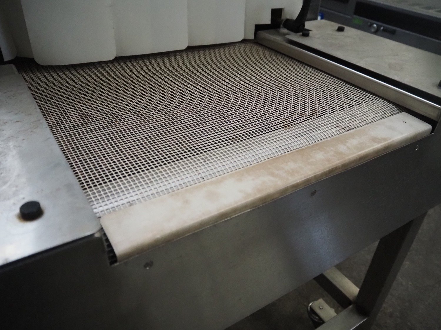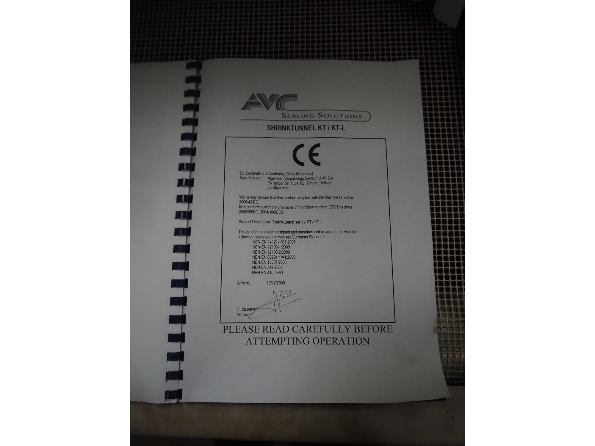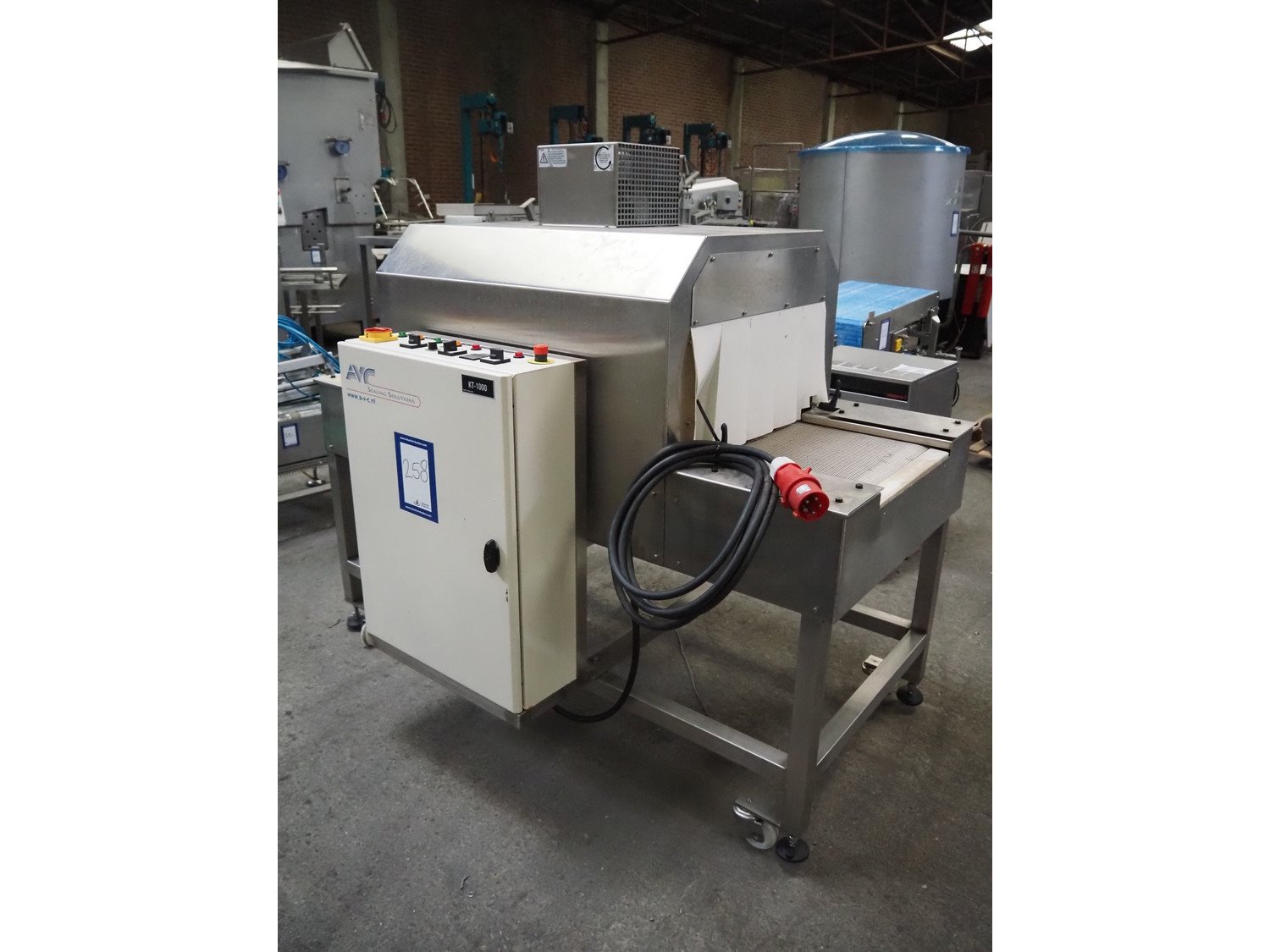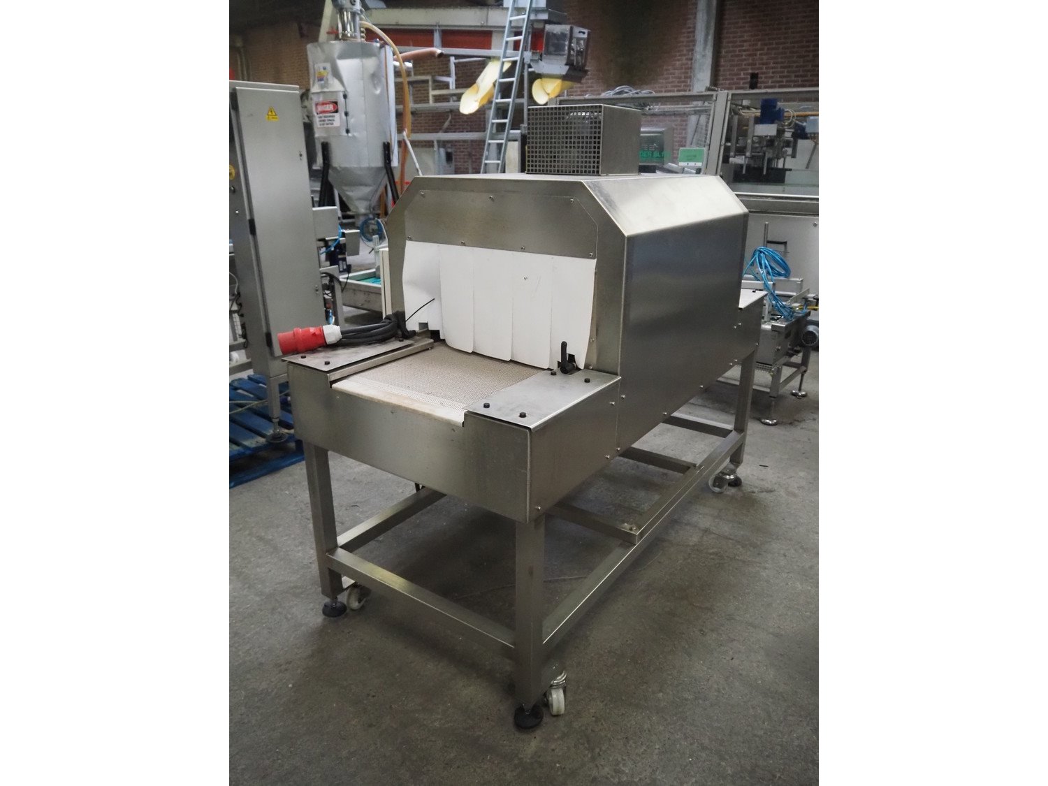 AVC mobile shrinking tunnel, model: KT1000 gaas, serial number: 1903241211, 400 V, 3 Ph, 50 Hz, 25 A, 13 kW, weight: 300 kg, mesh belt, belt width: 470 mm, aluminium rollers, roller width: 520 mm, clearance: 460 mm x 320 mm, total dimensions: 1900 mm x 1150 mm x 1600 mm.
