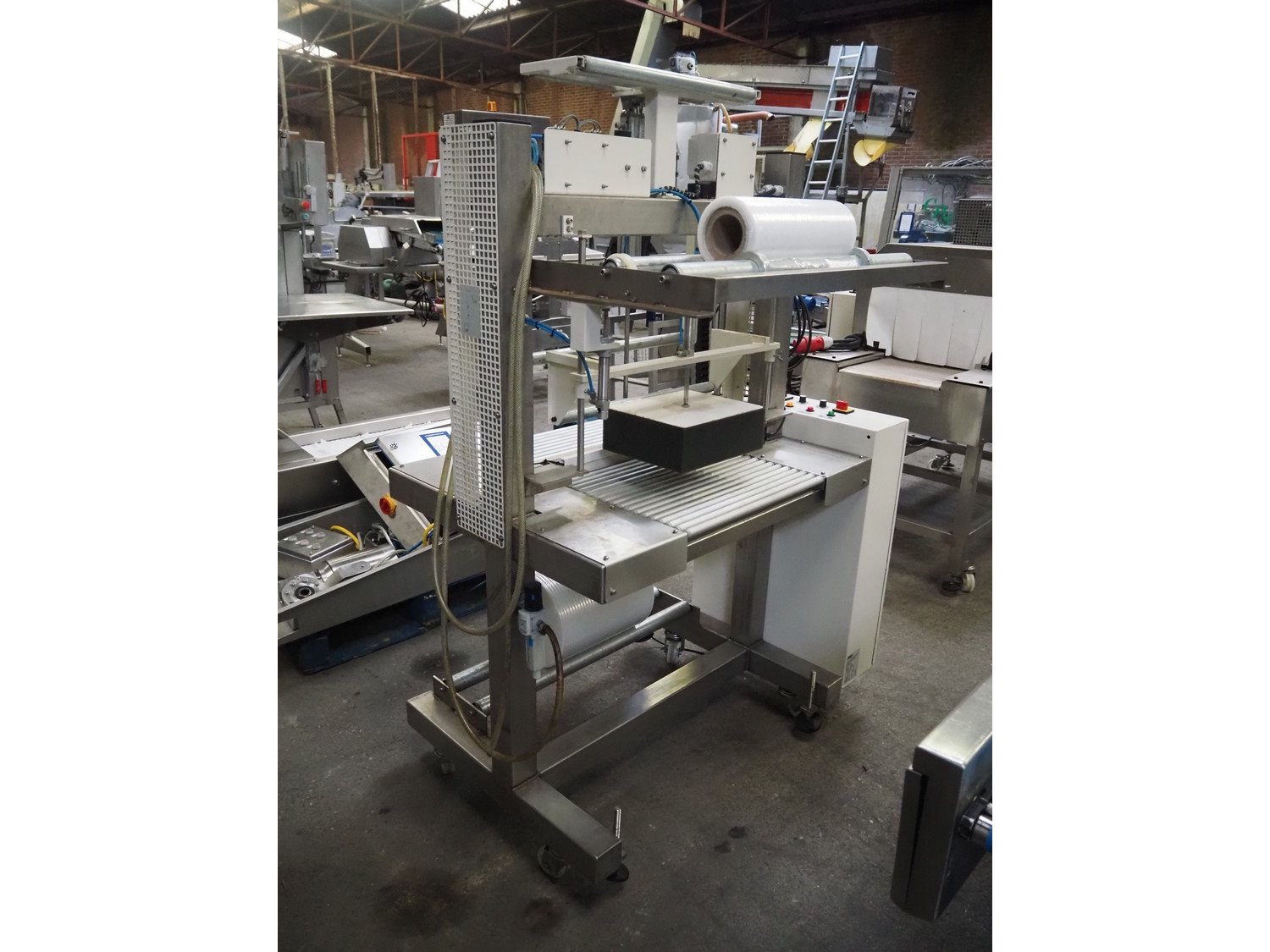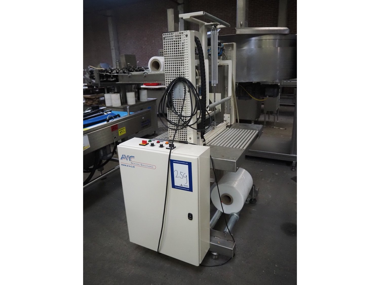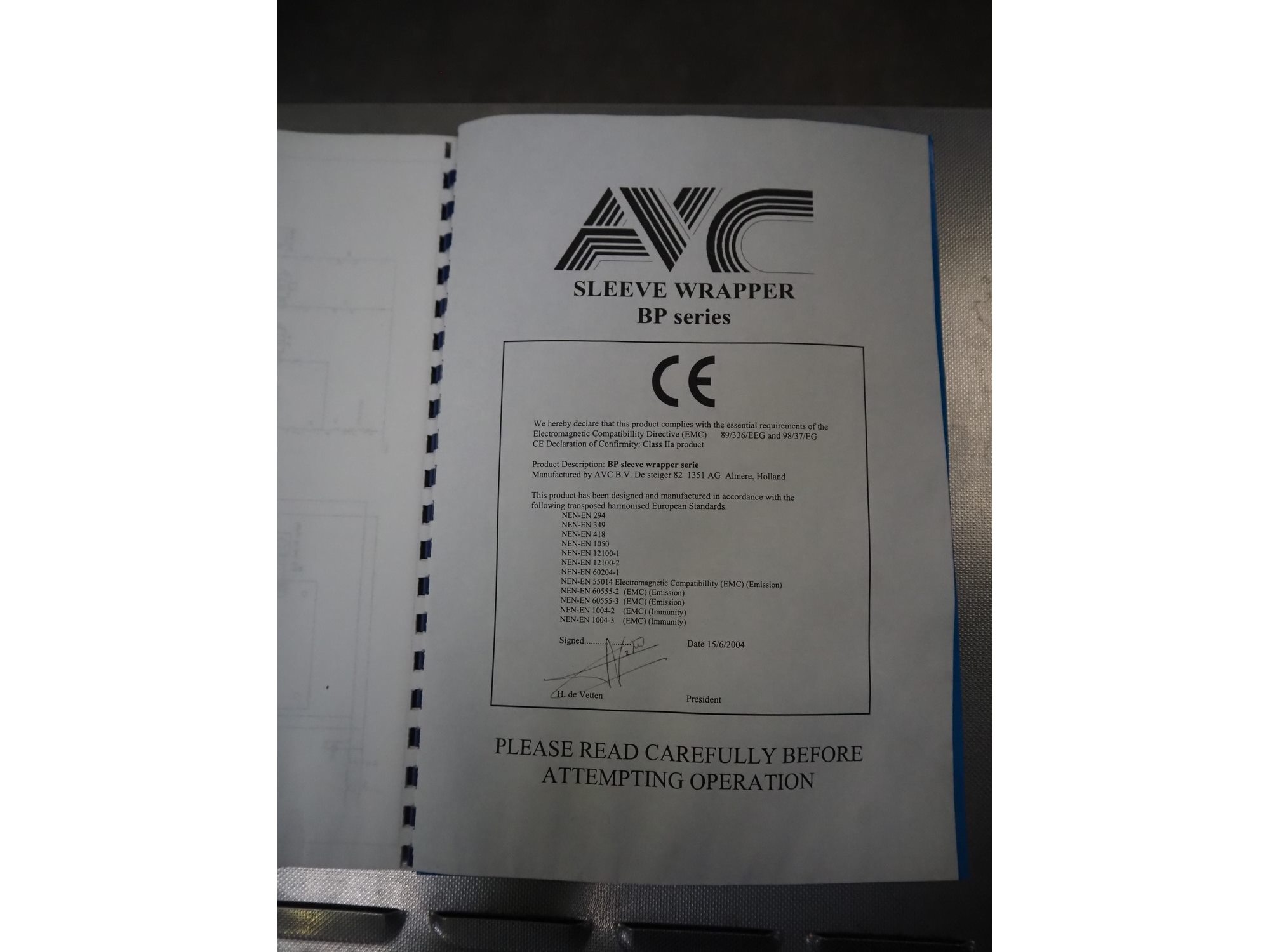 AVC mobile sleeve wrapper, model: BP.500, serial number: 1301711211, 230 V, 1 Ph, 50 Hz, 16 A, 1.5 kW, weight: 200 kg, aluminium rollers, roller width: 520 mm, total dimensions: 1230 mm x 950 mm x 1800 mm.