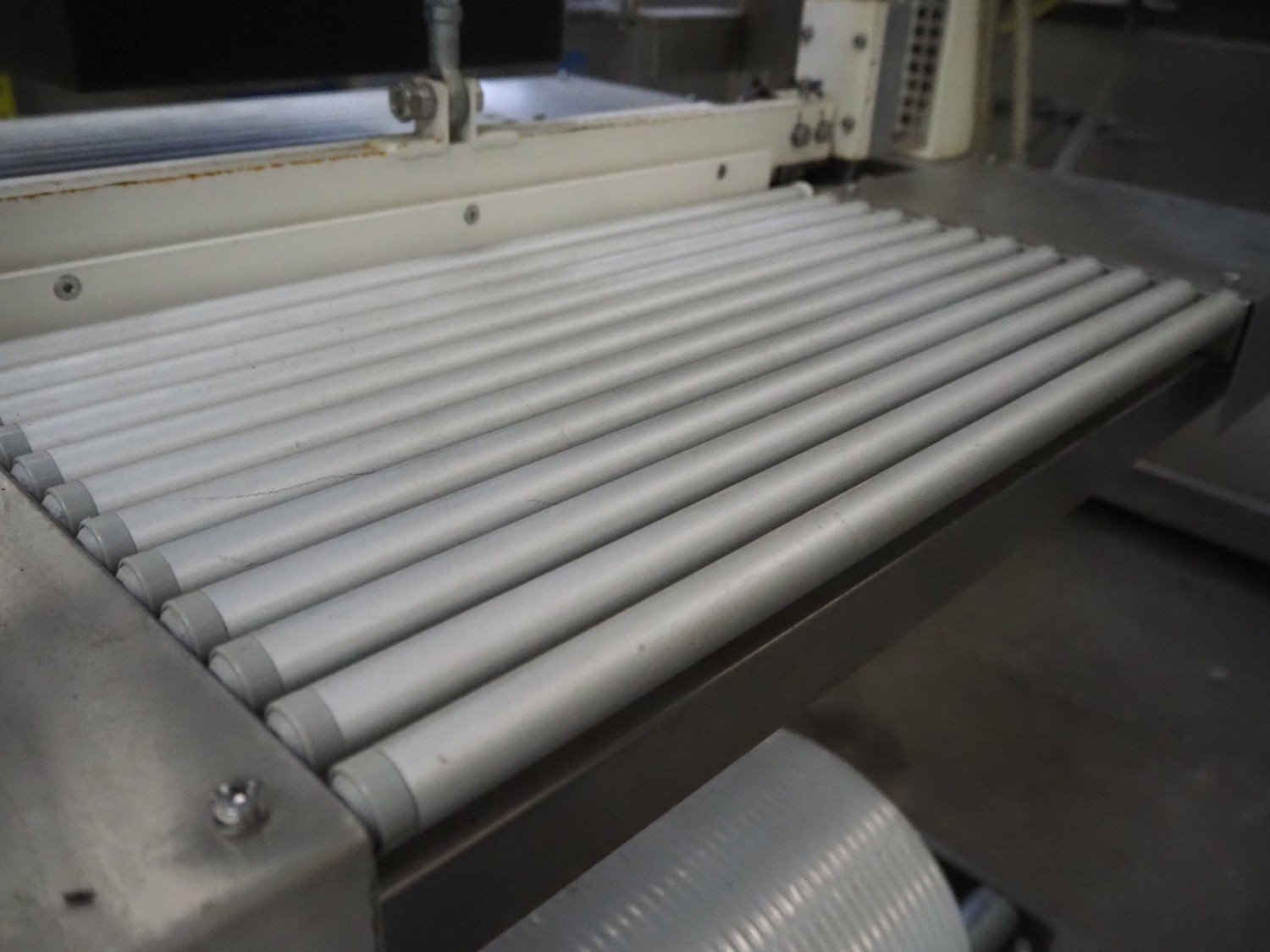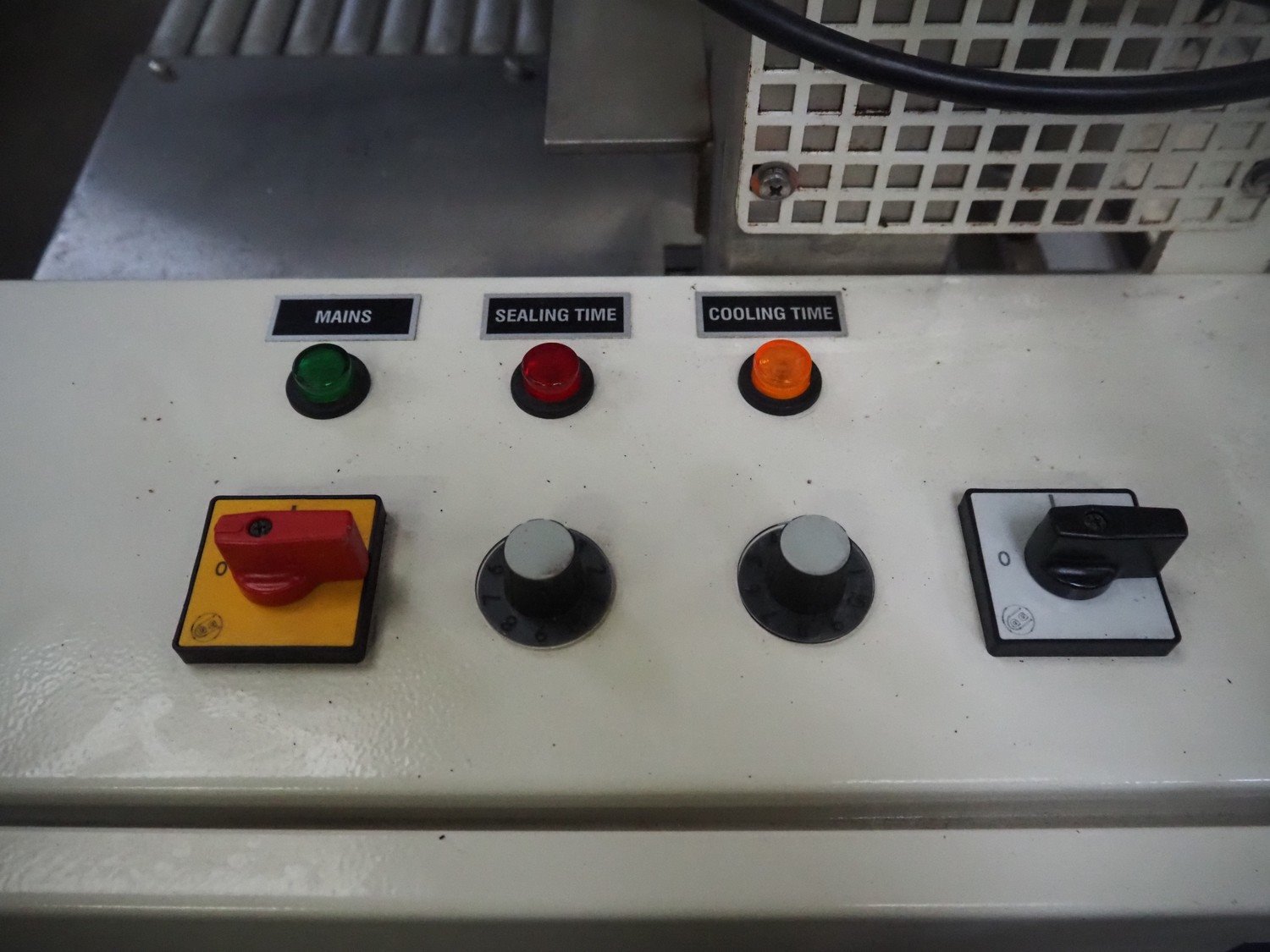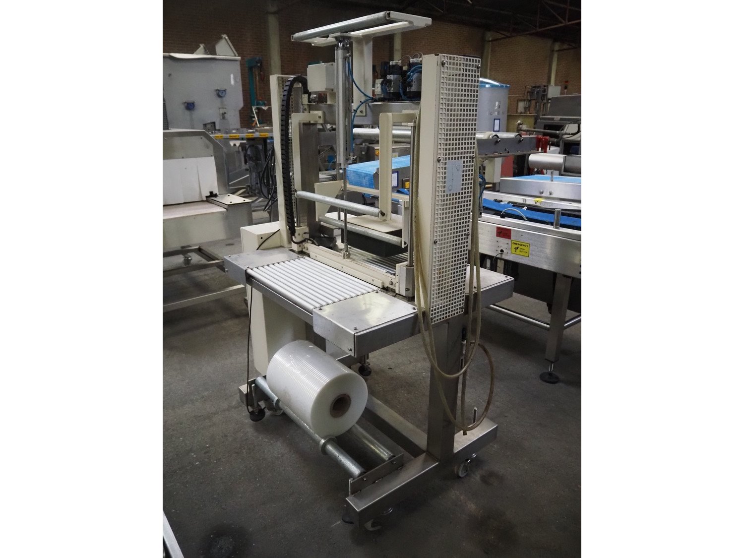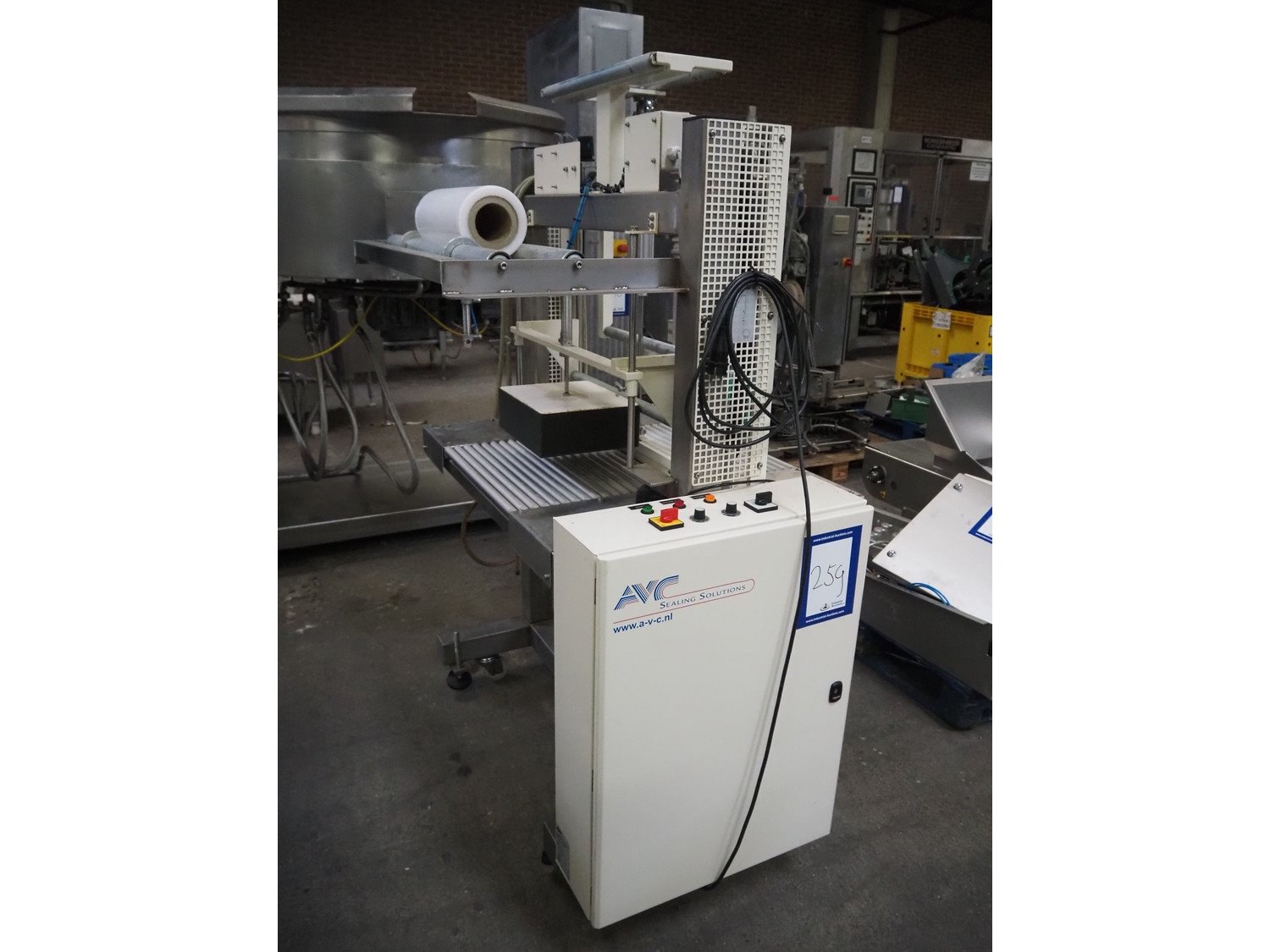 AVC mobile sleeve wrapper, model: BP.500, serial number: 1301711211, 230 V, 1 Ph, 50 Hz, 16 A, 1.5 kW, weight: 200 kg, aluminium rollers, roller width: 520 mm, total dimensions: 1230 mm x 950 mm x 1800 mm.