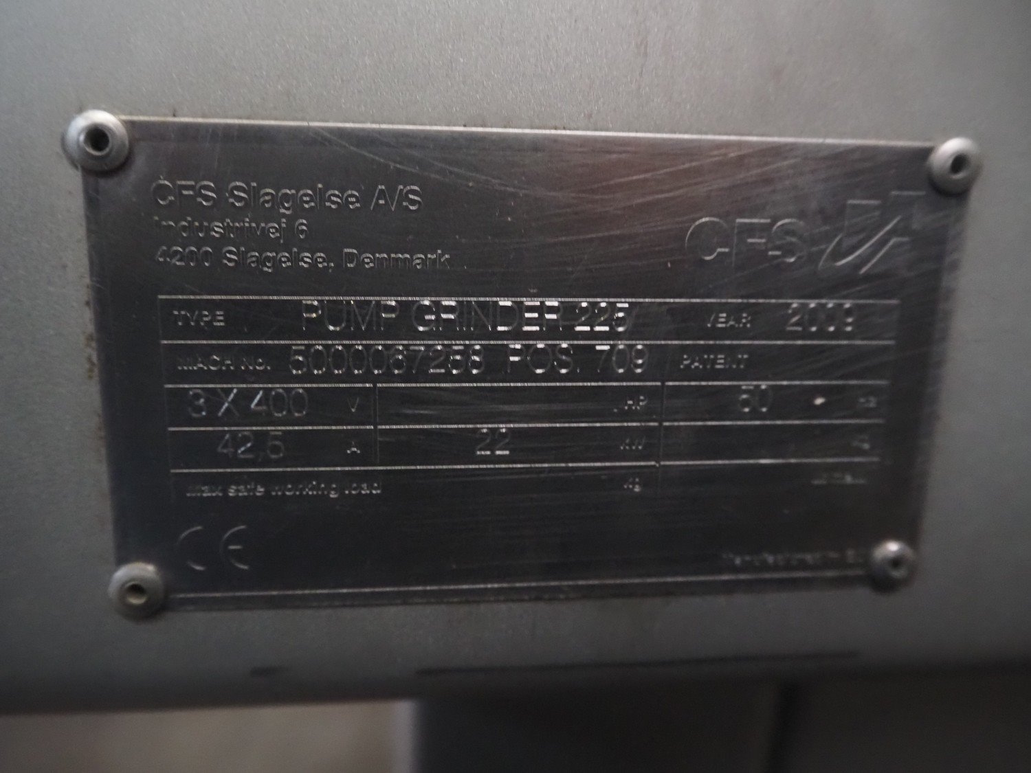 CFS Slagelse A/S pump grinder, type: PUMP GRINDER 225, machine number: 5000067258 POS. 709, year of construction: 2009, 3 x 400 V, 50 Hz, 42.5 A, 22 kW, plate diameter: 225 mm, total dimensions: 1000 mm x 1700 mm x 1850 mm.