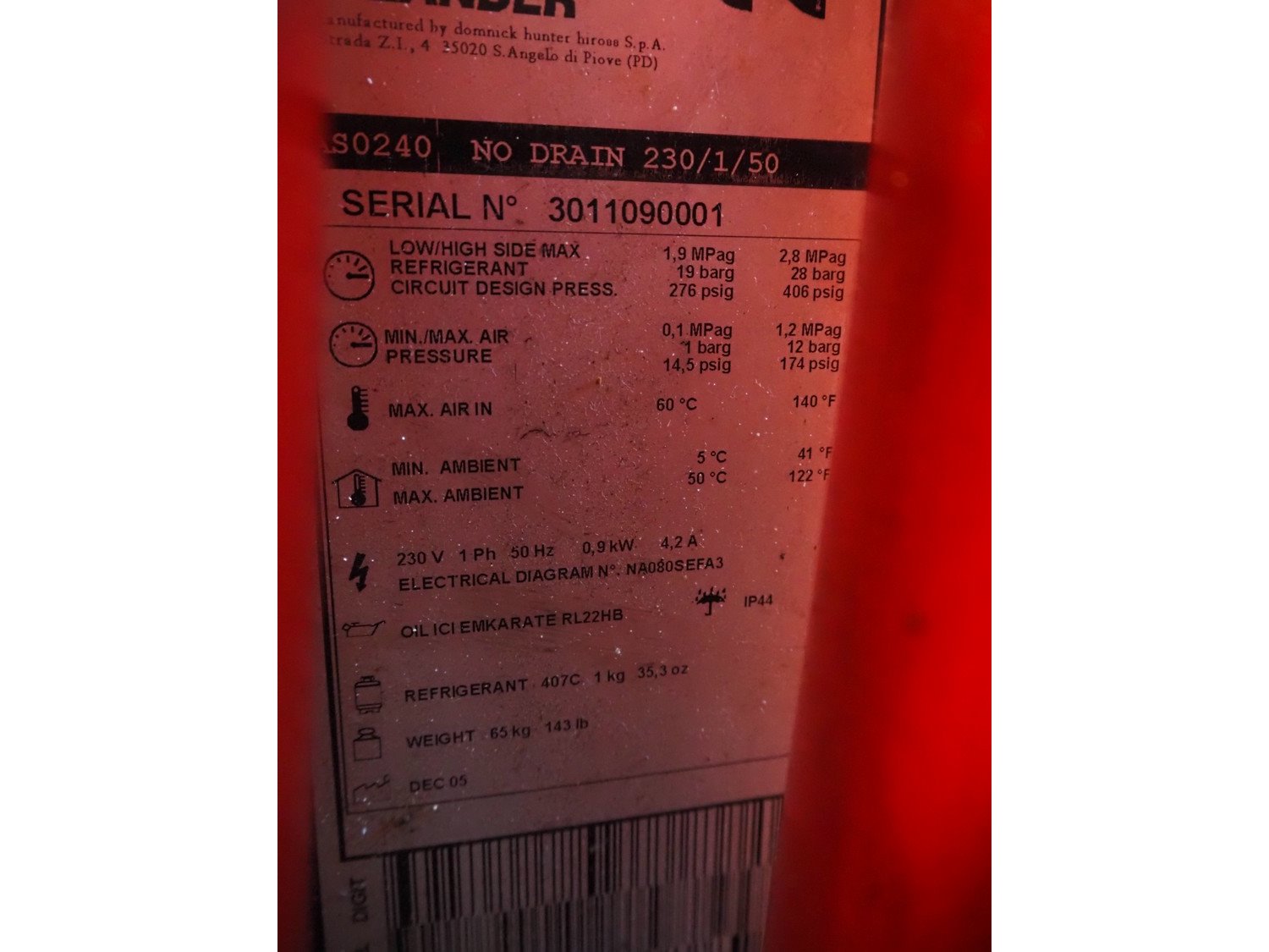 Zander air dryer, model: AS0240, serial number: 3011090001, 230 V, 1 Ph, 50 Hz, 4.2 A, 0.9 kW, dimensions: 620 mm x 570 mm x 810 mm. Technical condition unknown.