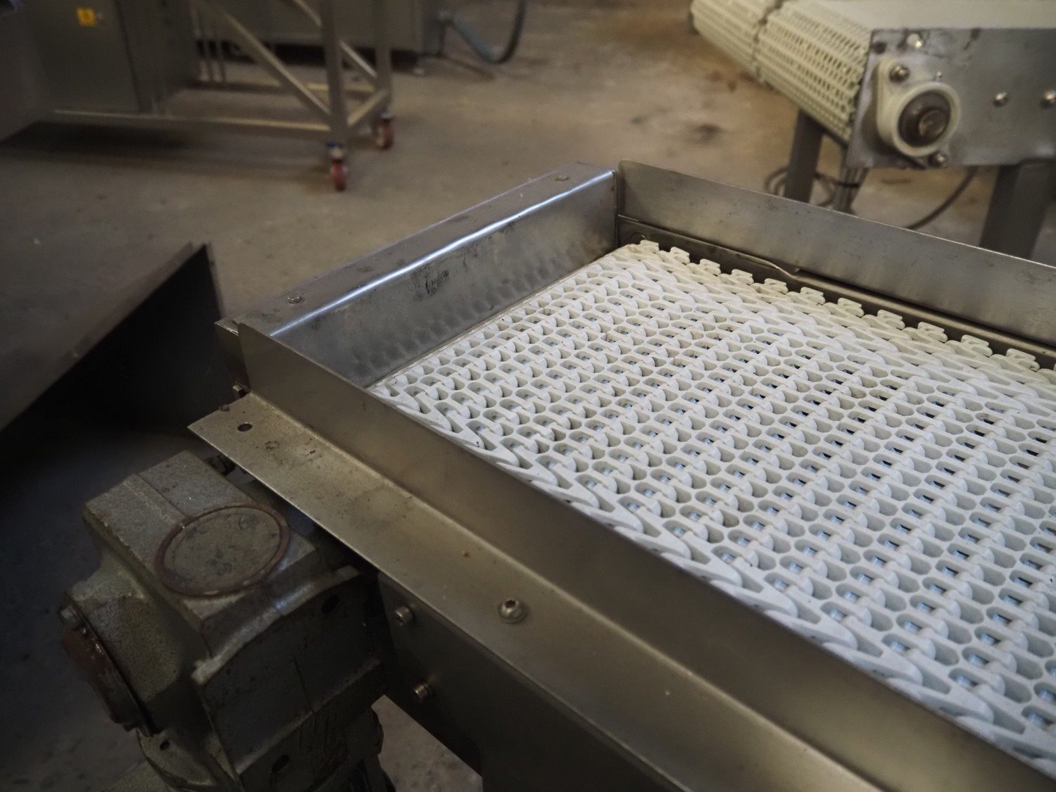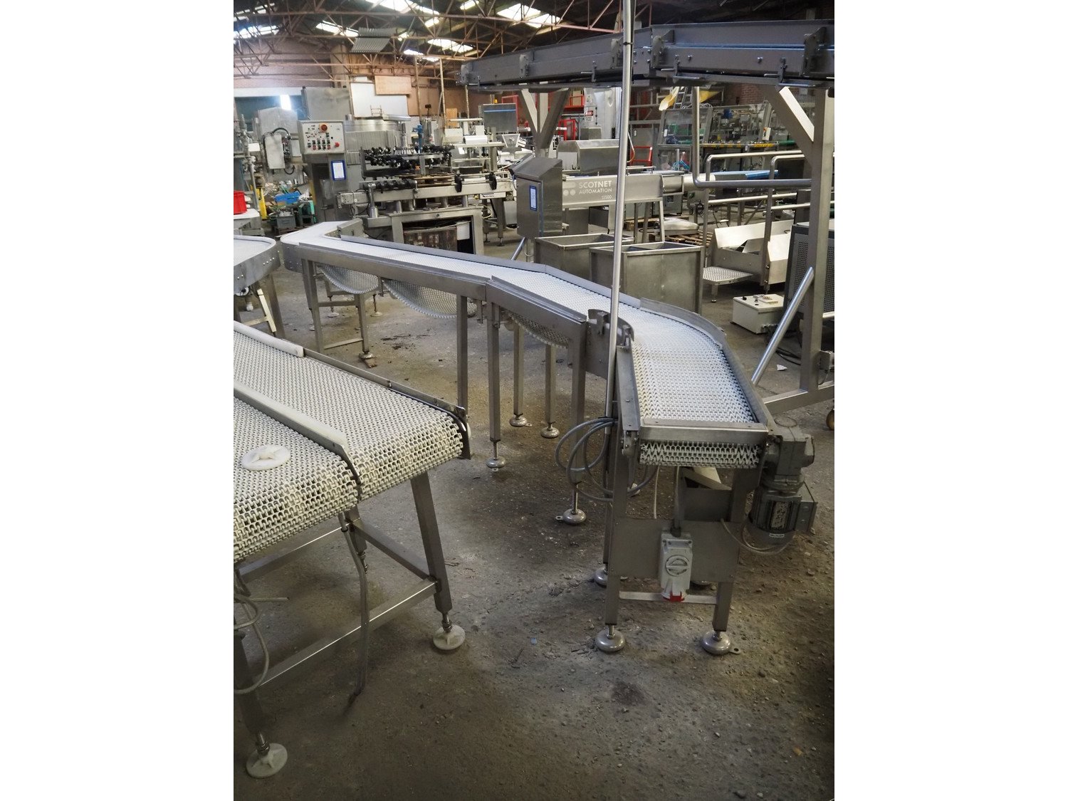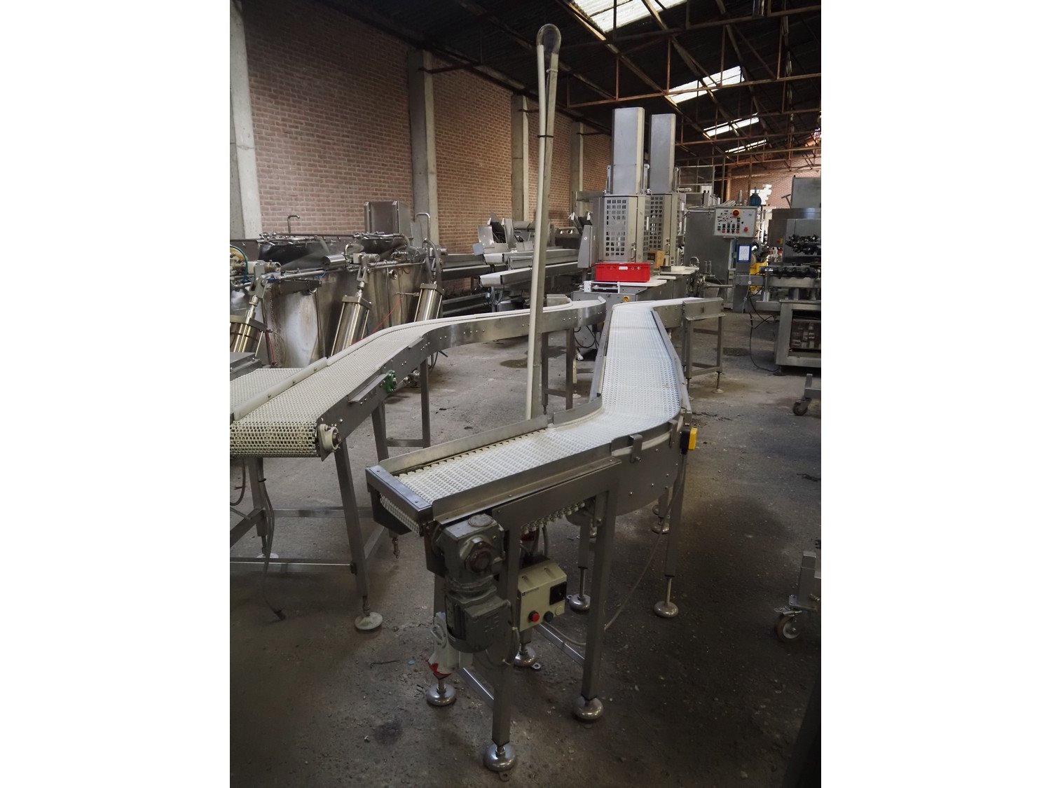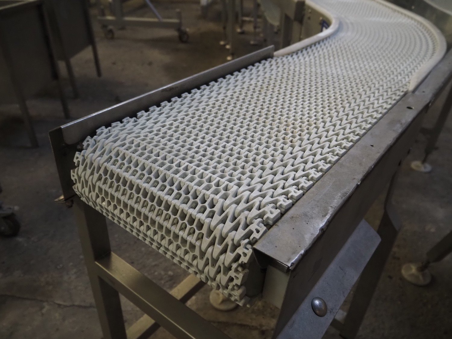 Curve conveyor, plastic mesh belt, belt width: 305 mm, total dimensions: 5500 mm x 1150 mm x 2150 mm.