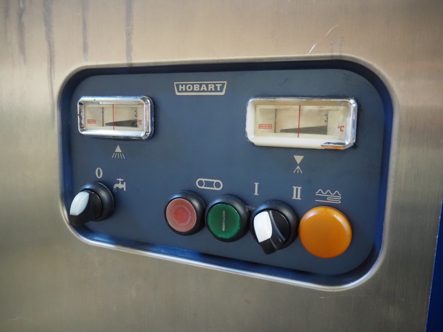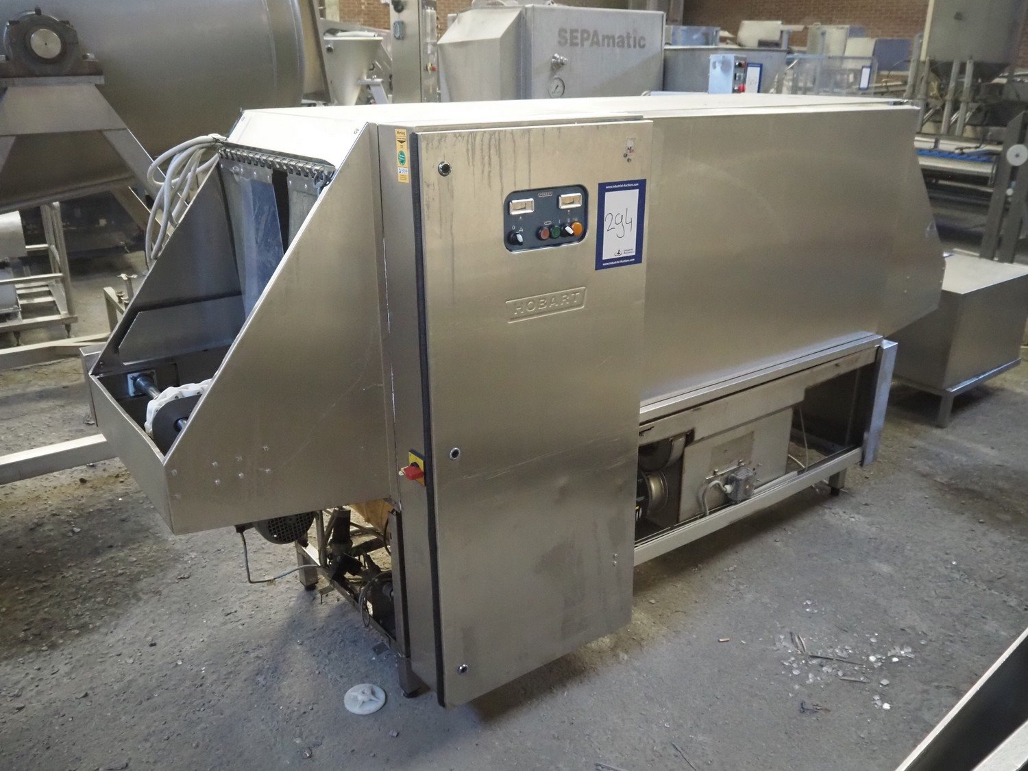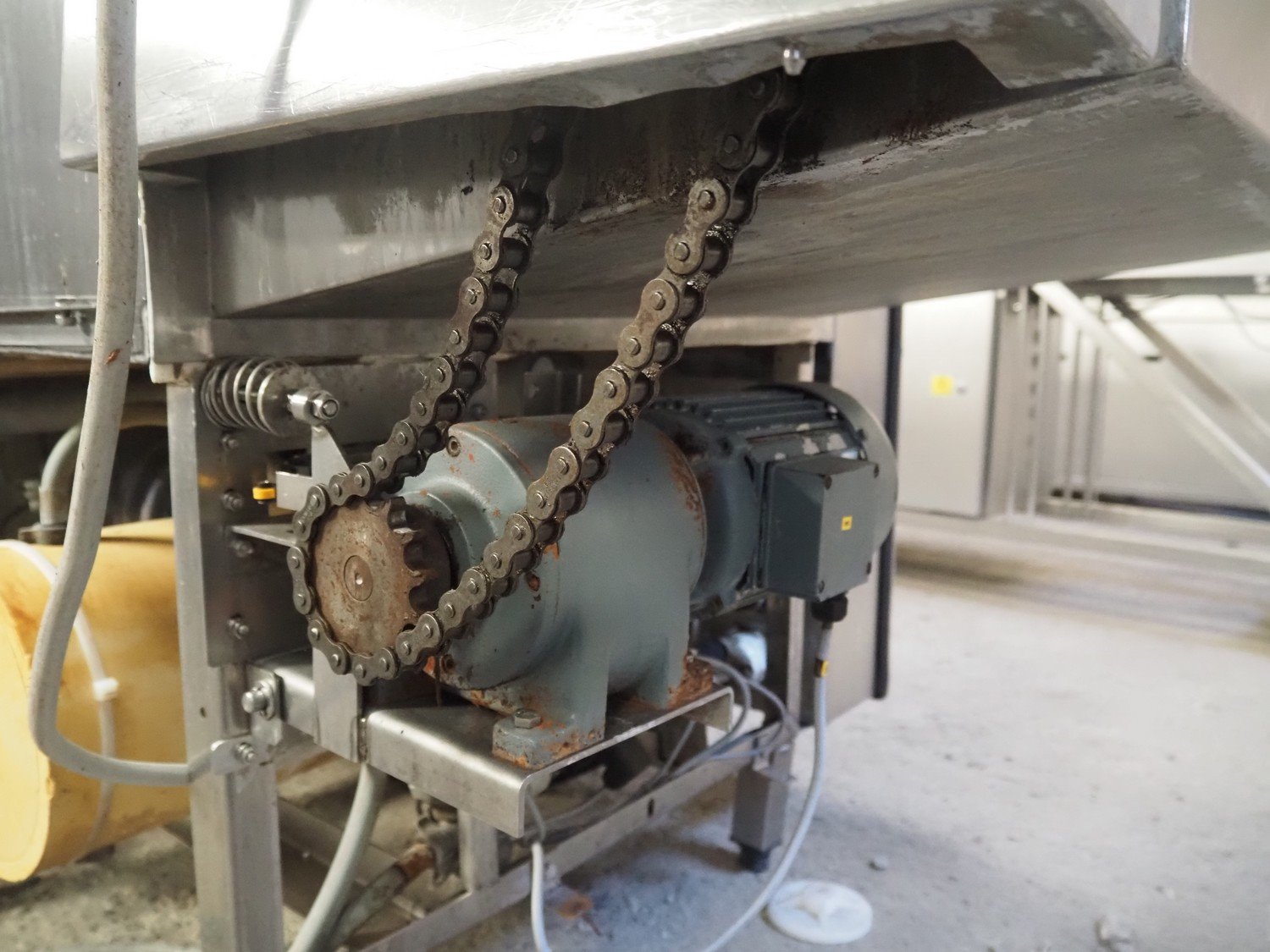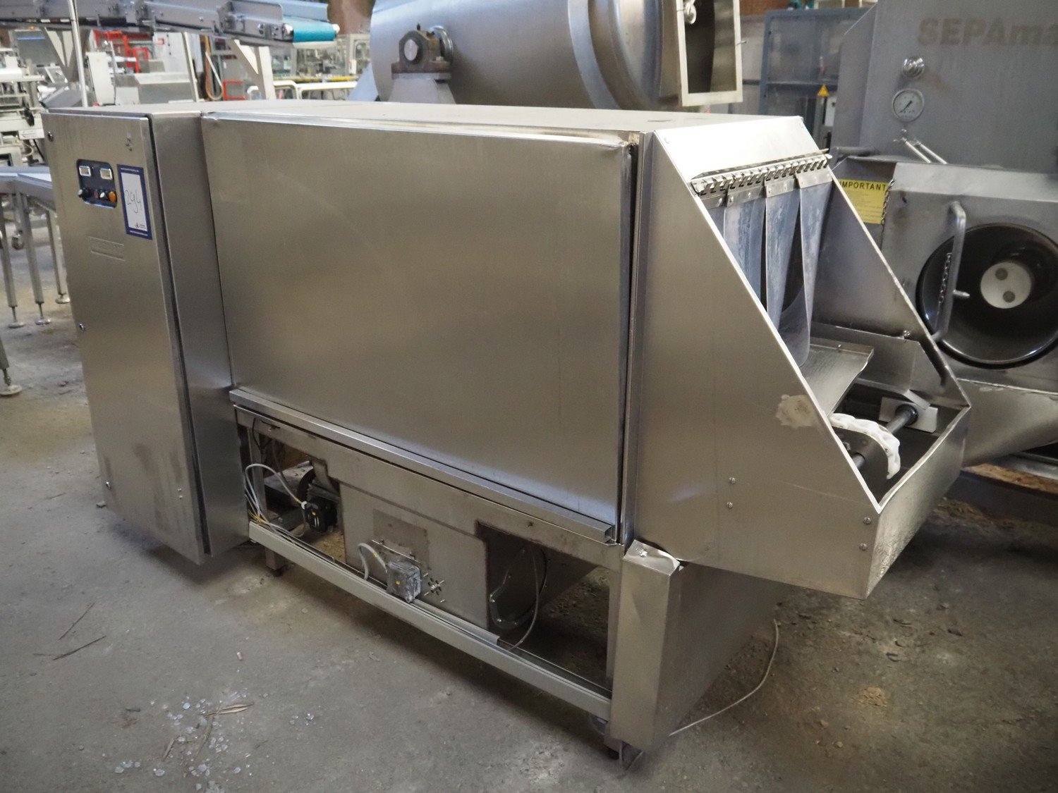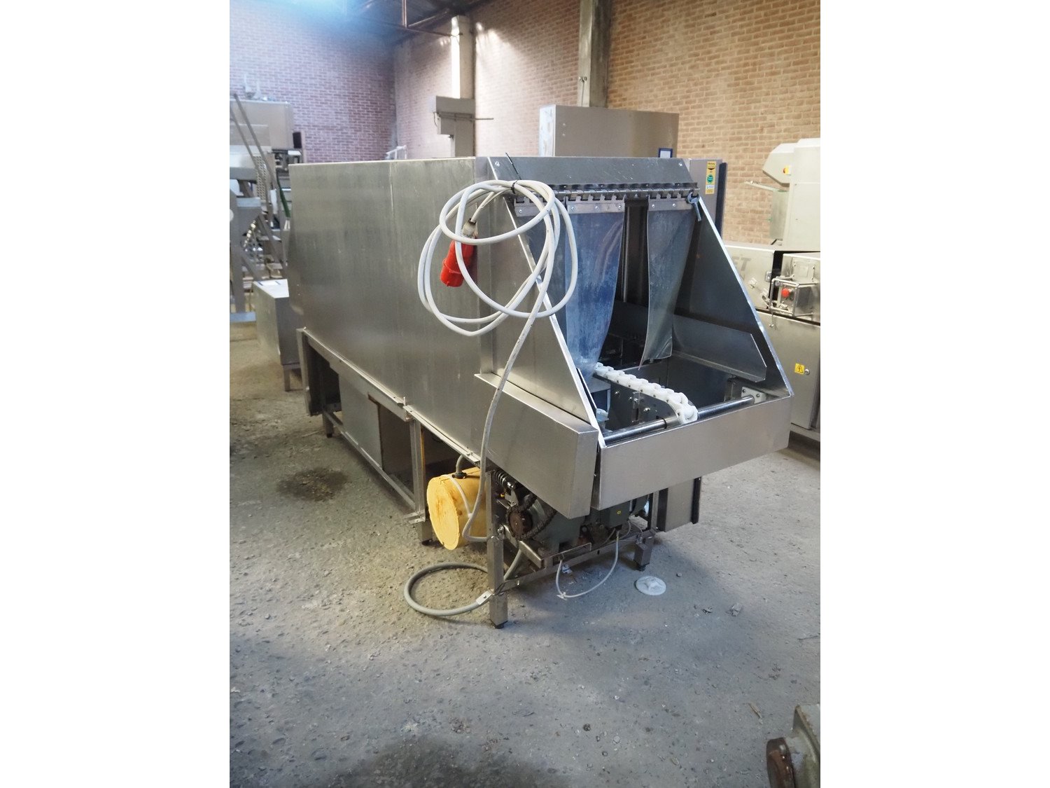 Hobart crate washer, clearance: 600 mm x 450 mm, belt width: 55 mm, divider height: 17 mm, distance between dividers: 340 mm, total dimensions: 3100 mm x 1000 mm x 1490 mm.