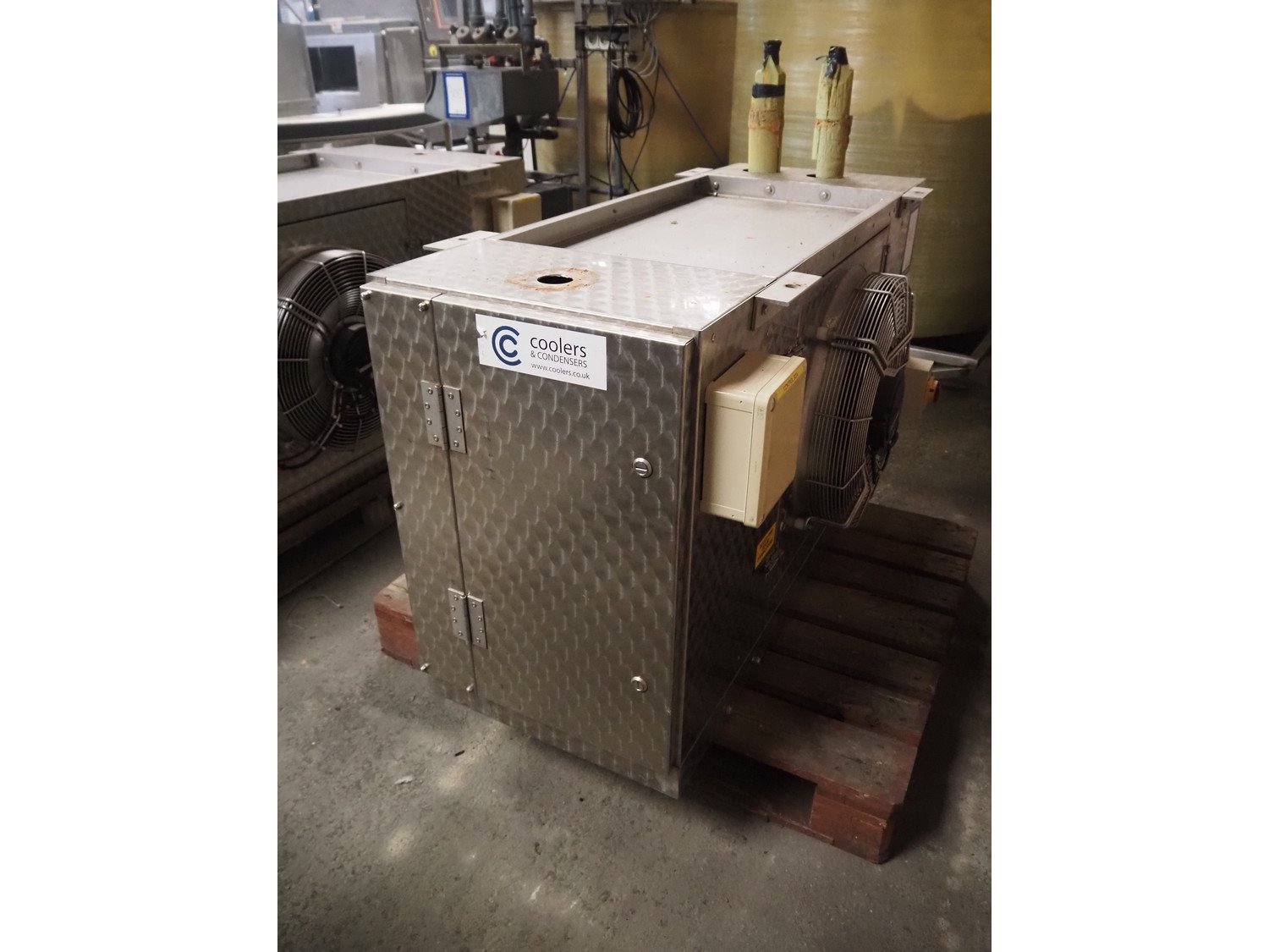Coolers & condensers s/s evaporator, model: CF 6/13-4R6mm, serial number: SOP0035179, 415 V, 3 Ph, 50 Hz, maximum temperature: 100°C, minimum temperature: -50°C, 1 fan, total dimensions: 1850 mm x 900 mm x 1350 mm.