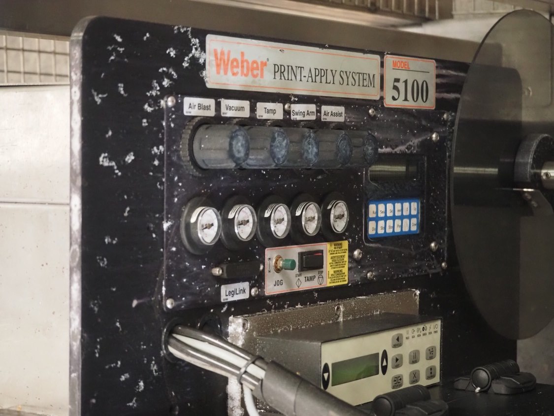 Weber labelling machine, model: W5100-TT-LH-U-S, serial number: WUK060910178B, plastic belt, belt width: 240 mm, total dimensions: 2000 mm x 1200 mm x 1620 mm.
