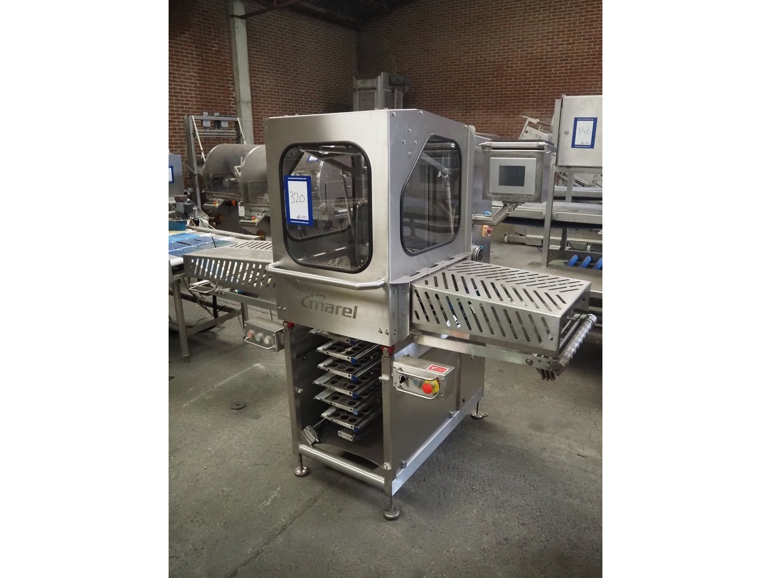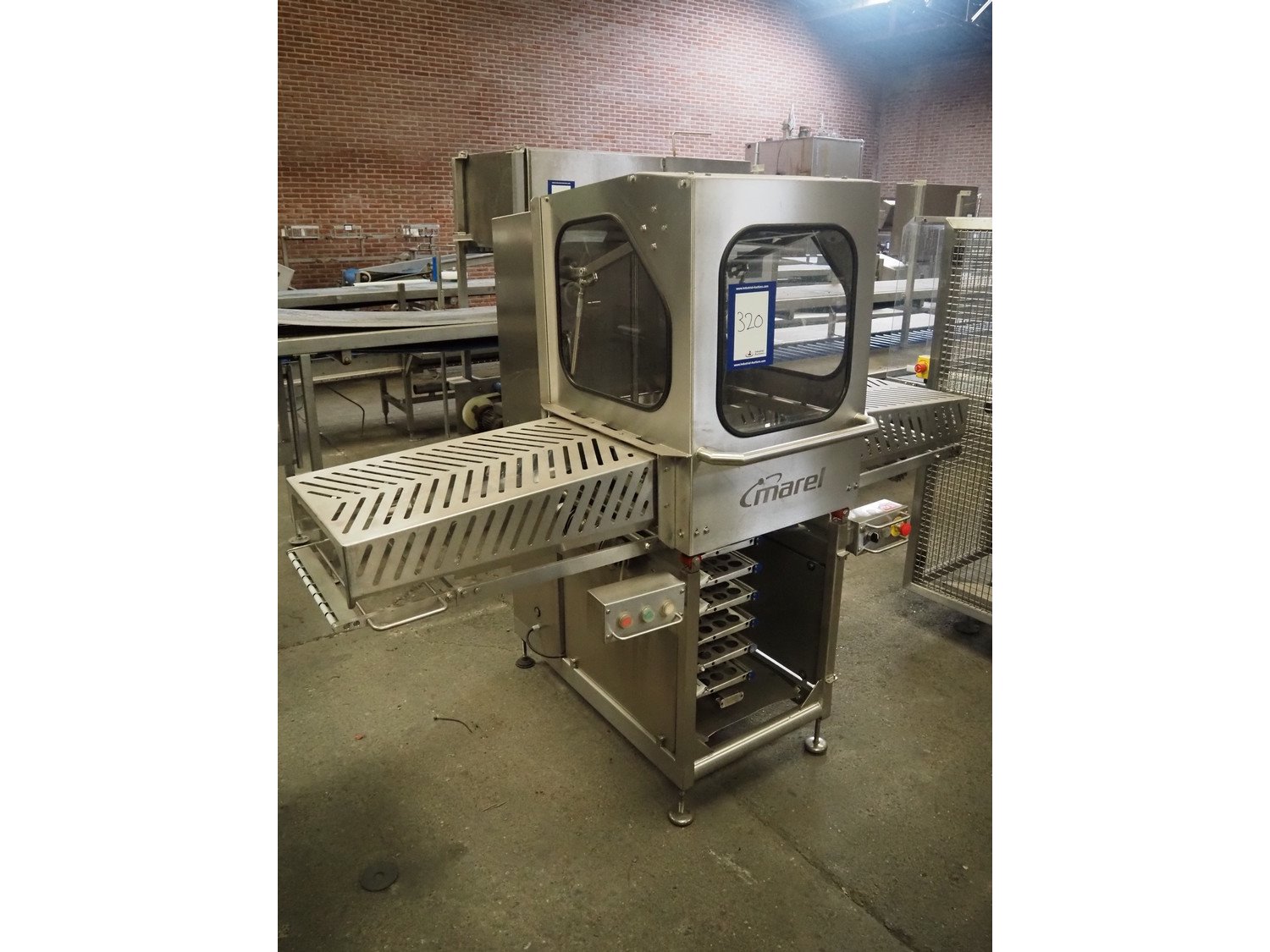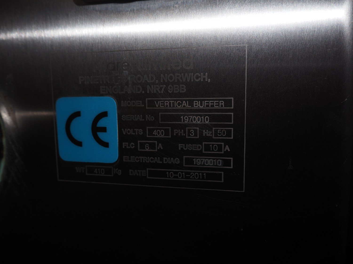 Marel Limited vertical buffer, model: vertical buffer, serial number: 1970010, year of construction: 10-01-2011, 400 V, 3 Ph, 50 Hz, 6/10 A, weight: 410 Kg, belt width: 400 mm, 7 floors, dye: (24x each floor) Ø 40 mm, total dimensions: 2050 mm x 1200 mm x 1900 mm. Incomplete.