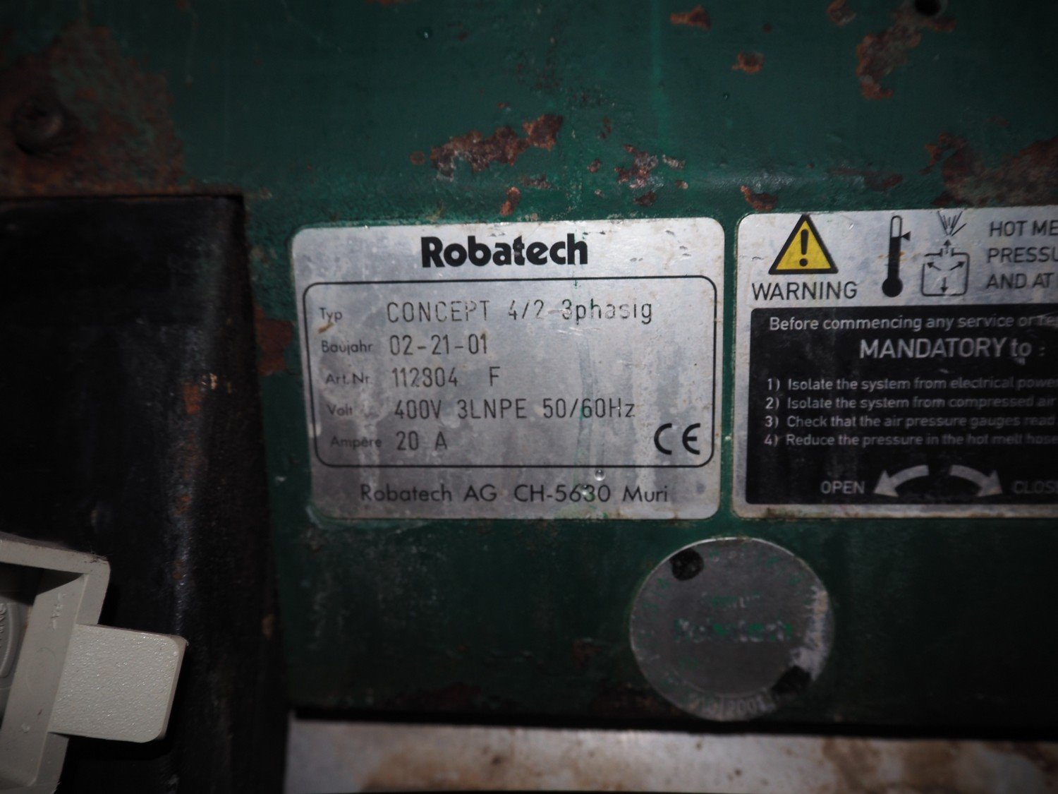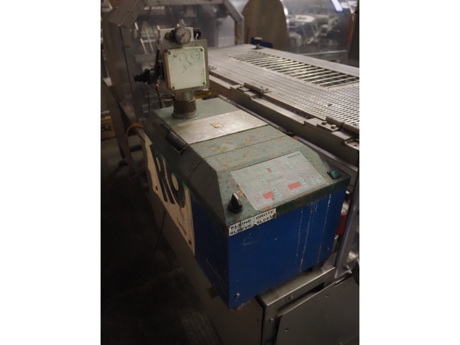 Robatech sleever, plastic infeed belt, belt width: 170 mm, Robatech glue unit, type: Concept 4/2 3 phasig, total dimensions: 2800 mm x 950 mm x 1550 mm. Technical condition unknown.