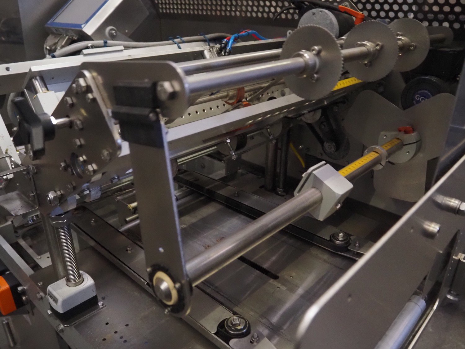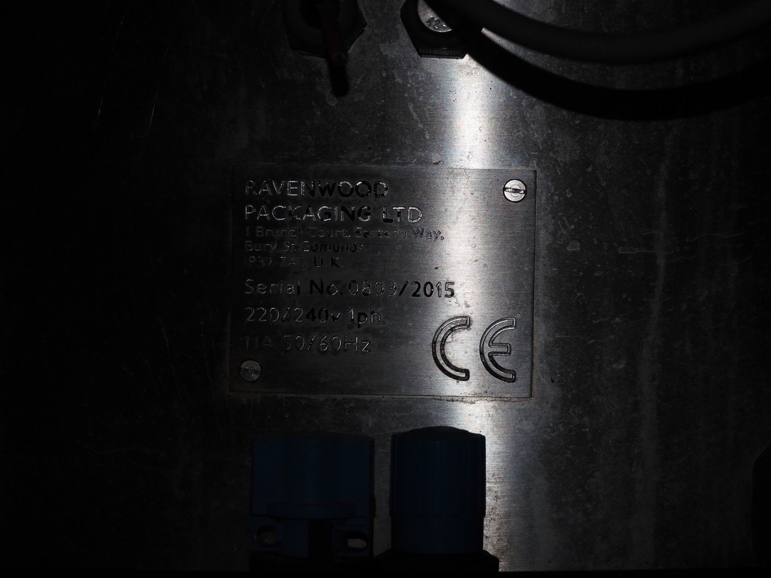 Ravenwood Packaging LTD linerless label applicator with ZodiacHS inkjet printer, serial number: 0803/2015, 220/240 V, 1 Ph, 50/60 Hz, 11 A, total dimensions: 1300 mm x 800 mm x 1600 mm. Missing belts.