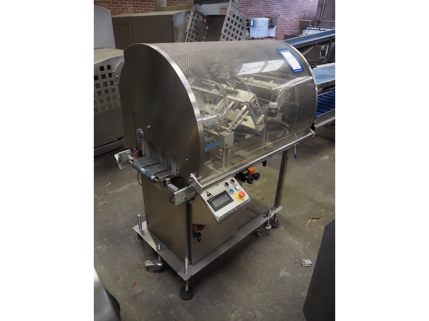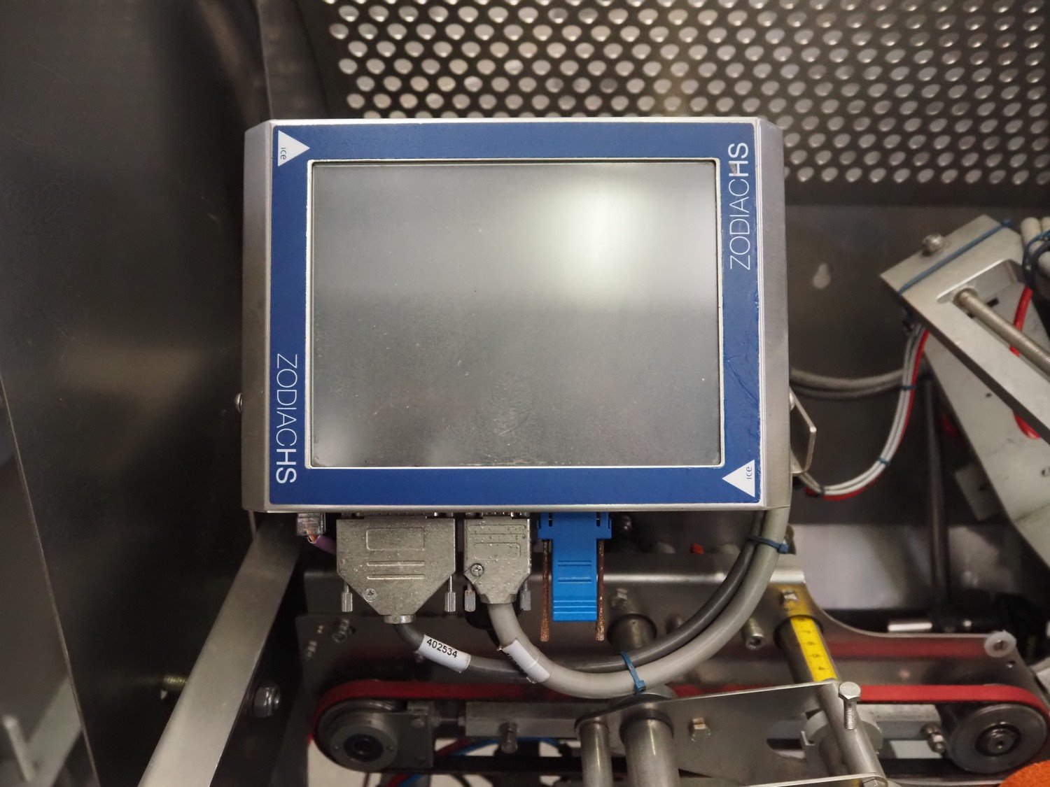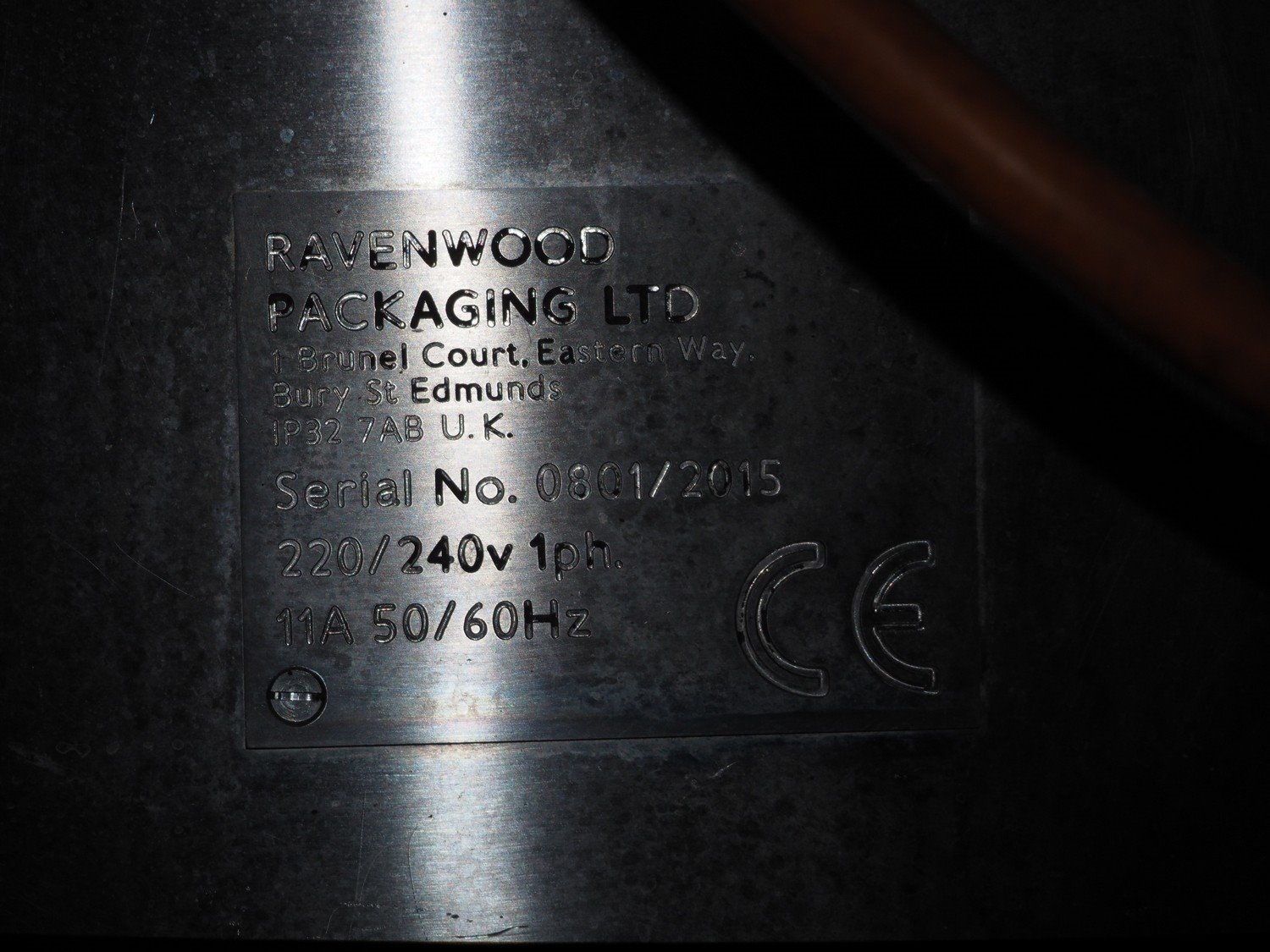Ravenwood Packaging LTD linerless label applicator with ZodiacHS inkjet printer, serial number: 0801/2015, 220/240 V, 1 Ph, 50/60 Hz, 11 A, total dimensions: 1300 mm x 800 mm x 1600 mm. Missing belts.