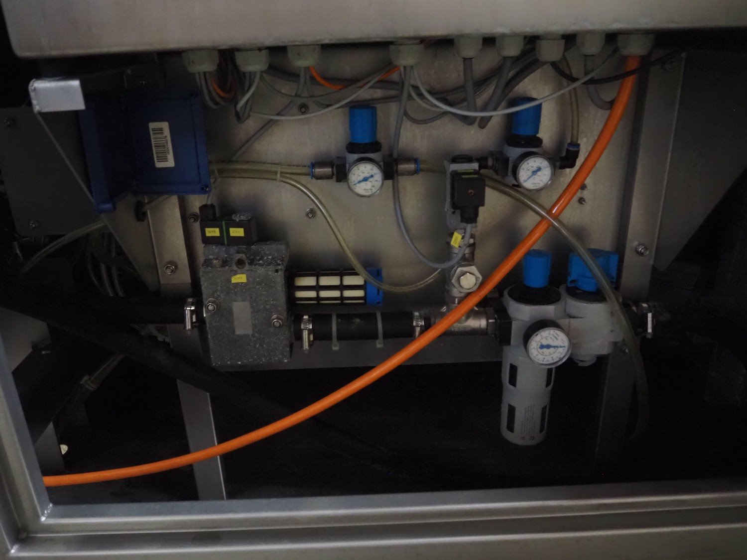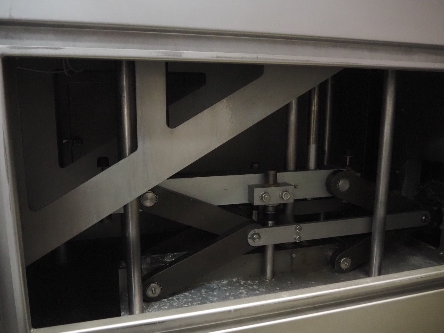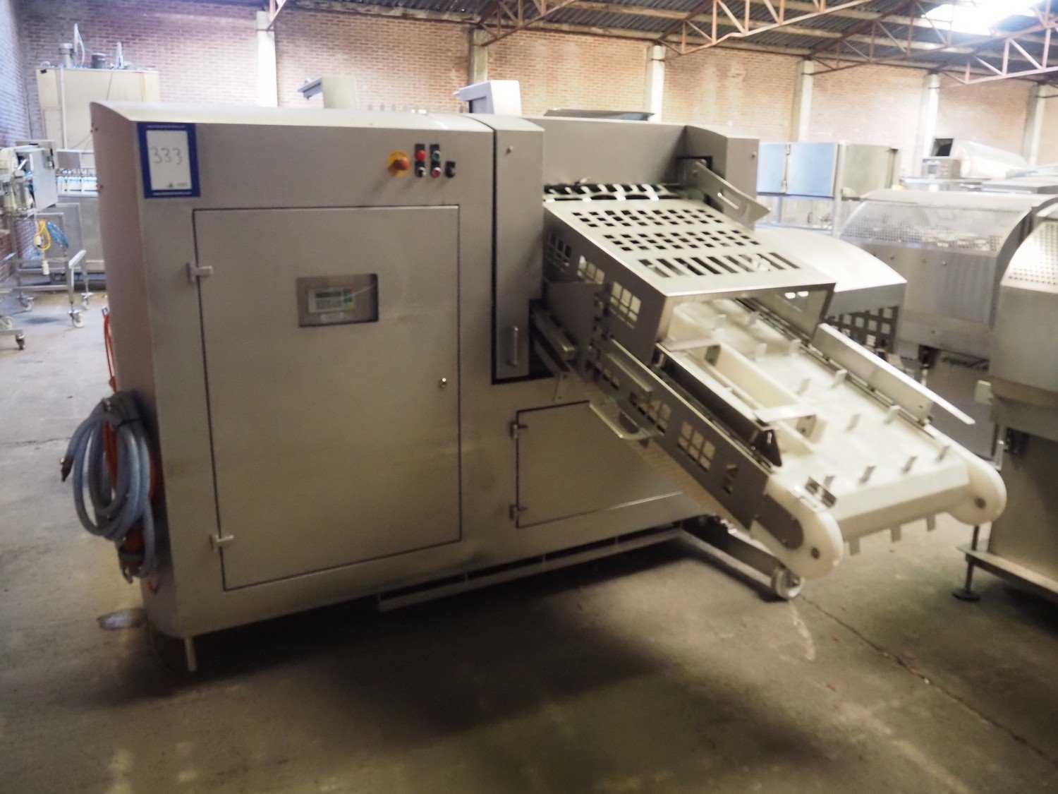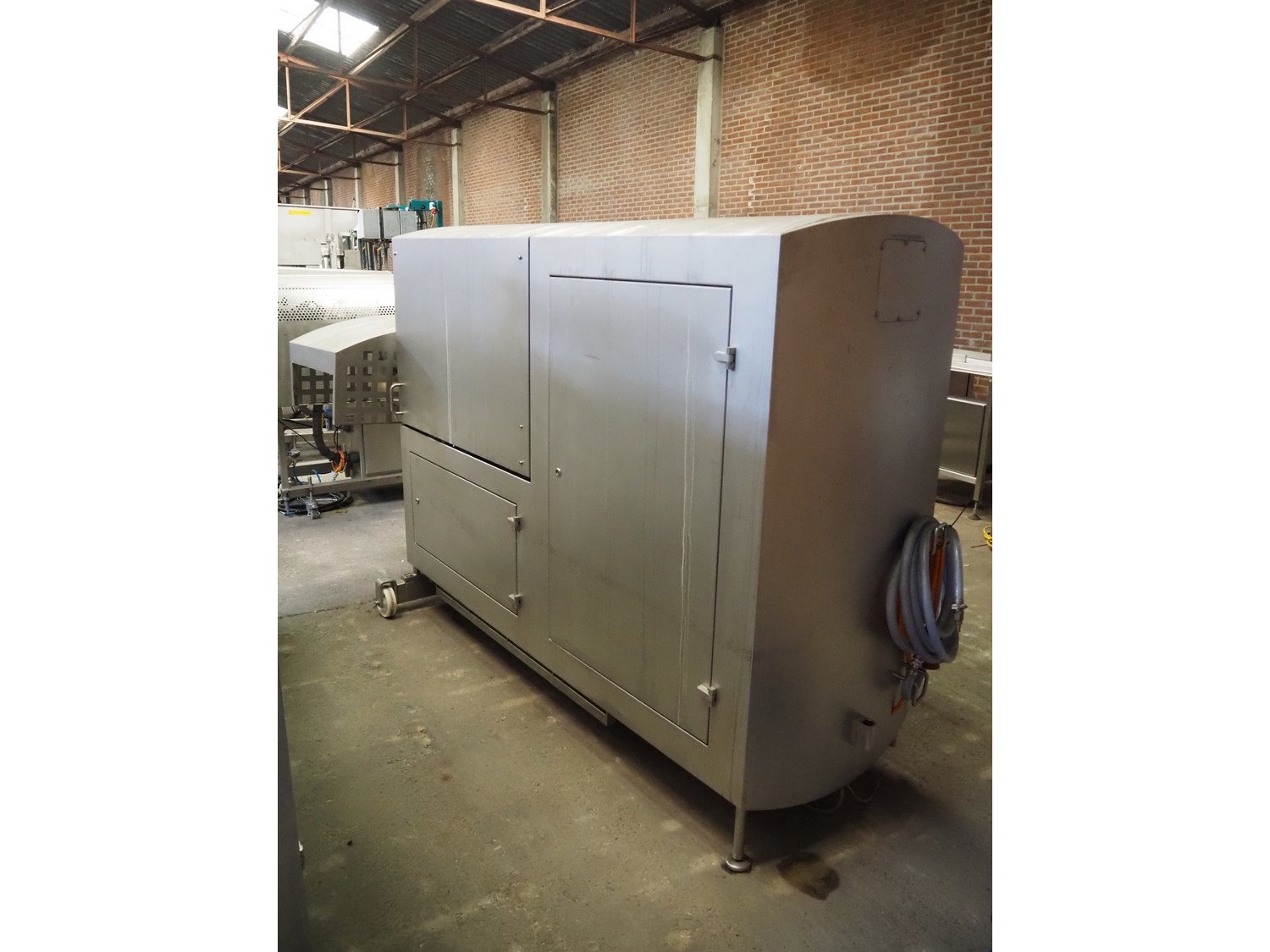 Marel meat press, type: Presso-Automat V4.2, number: 123107, diameter form: 170 mm, plastic belt, belt width: 600 mm, total dimensions: 3050 mm x 2400 mm x 1800 mm.