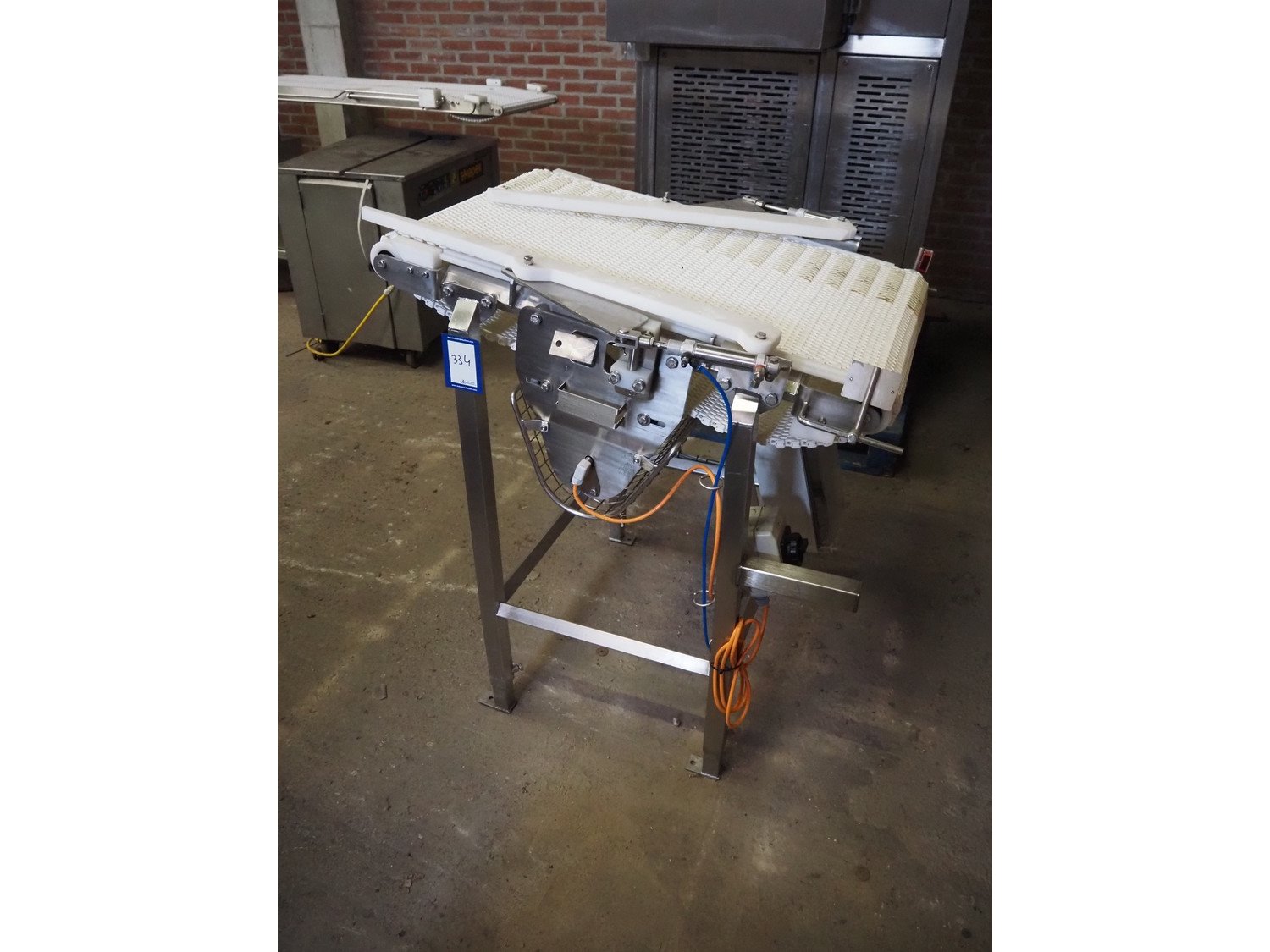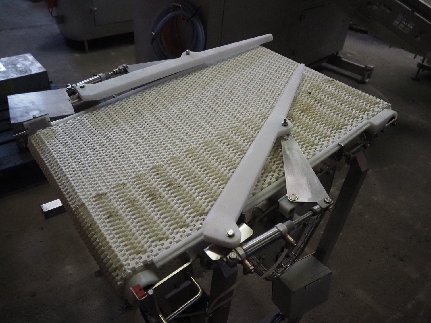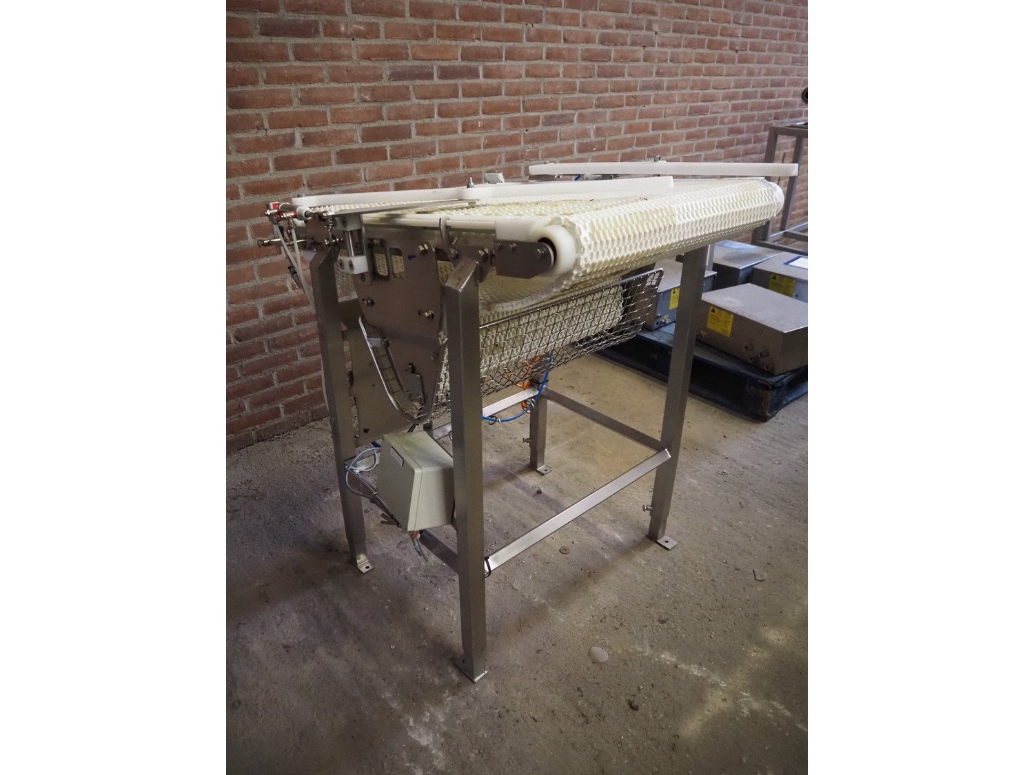 Carnitech elevating belt, type: PM45, year of construction: 2005, 4.12 A, plastic mesh belt, belt width: 570 mm, elevating height: 1050 mm, total dimensions: 1000 mm x 900 mm x 1100 mm.