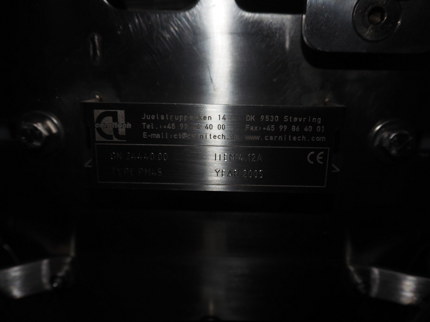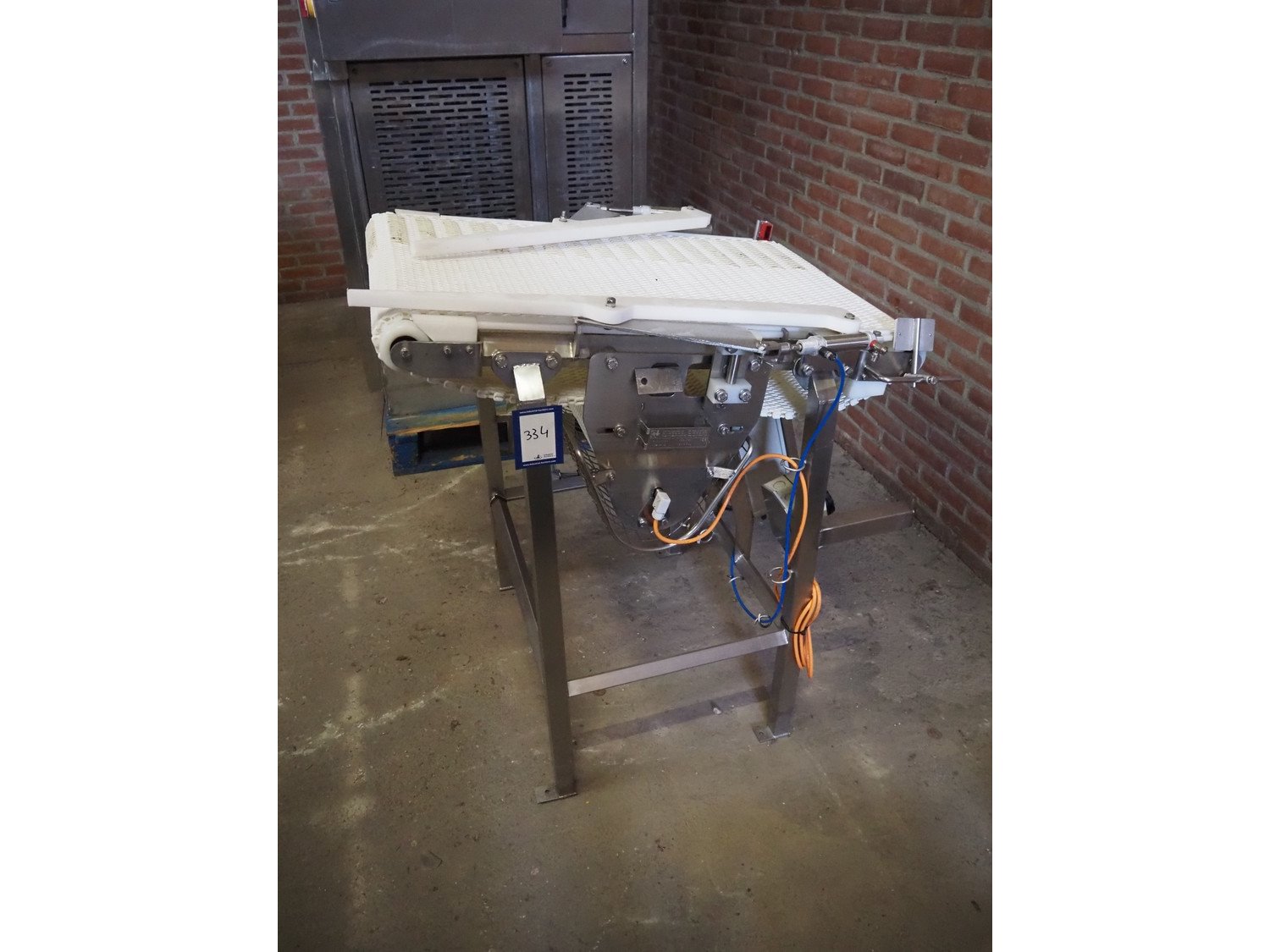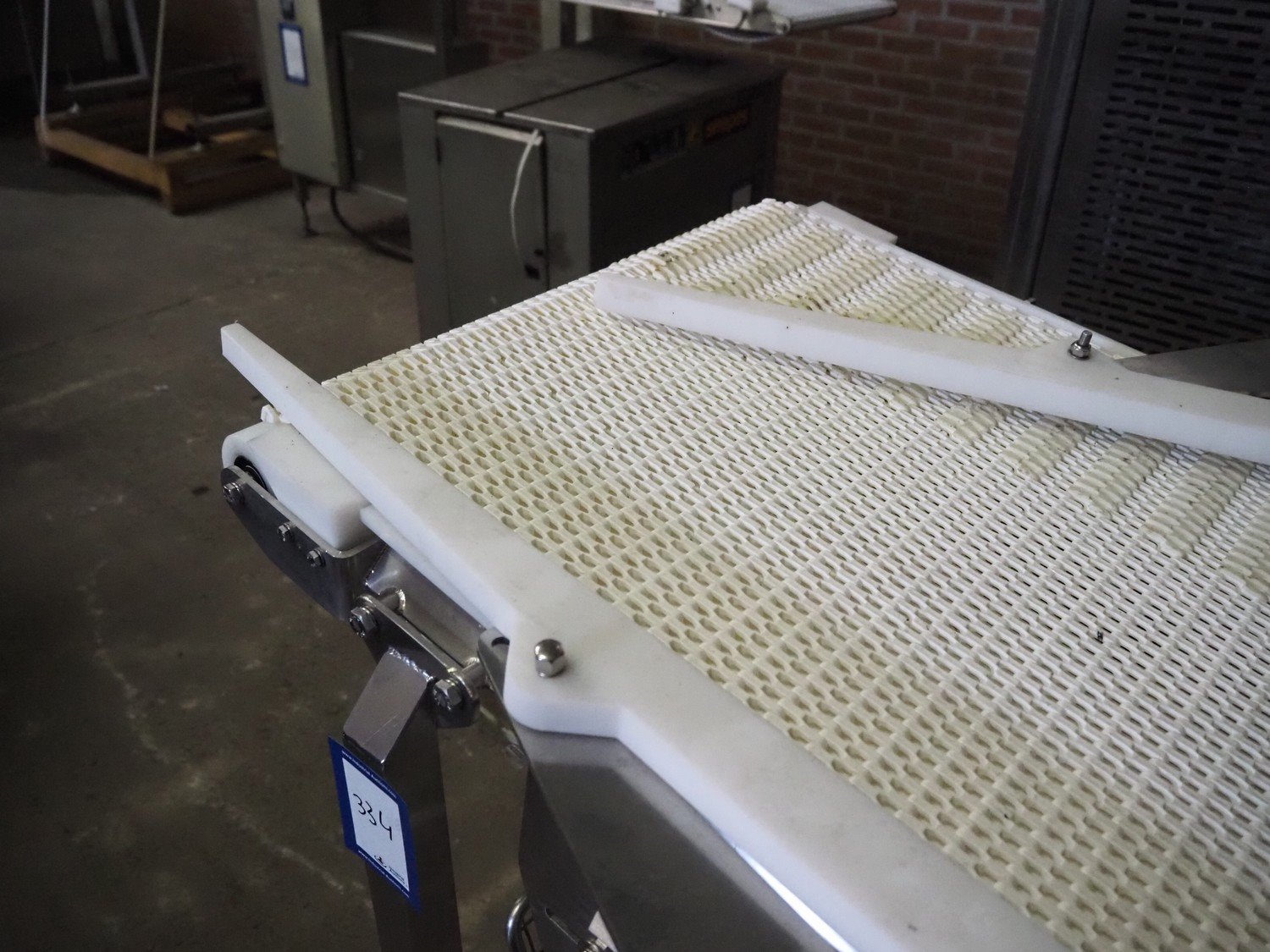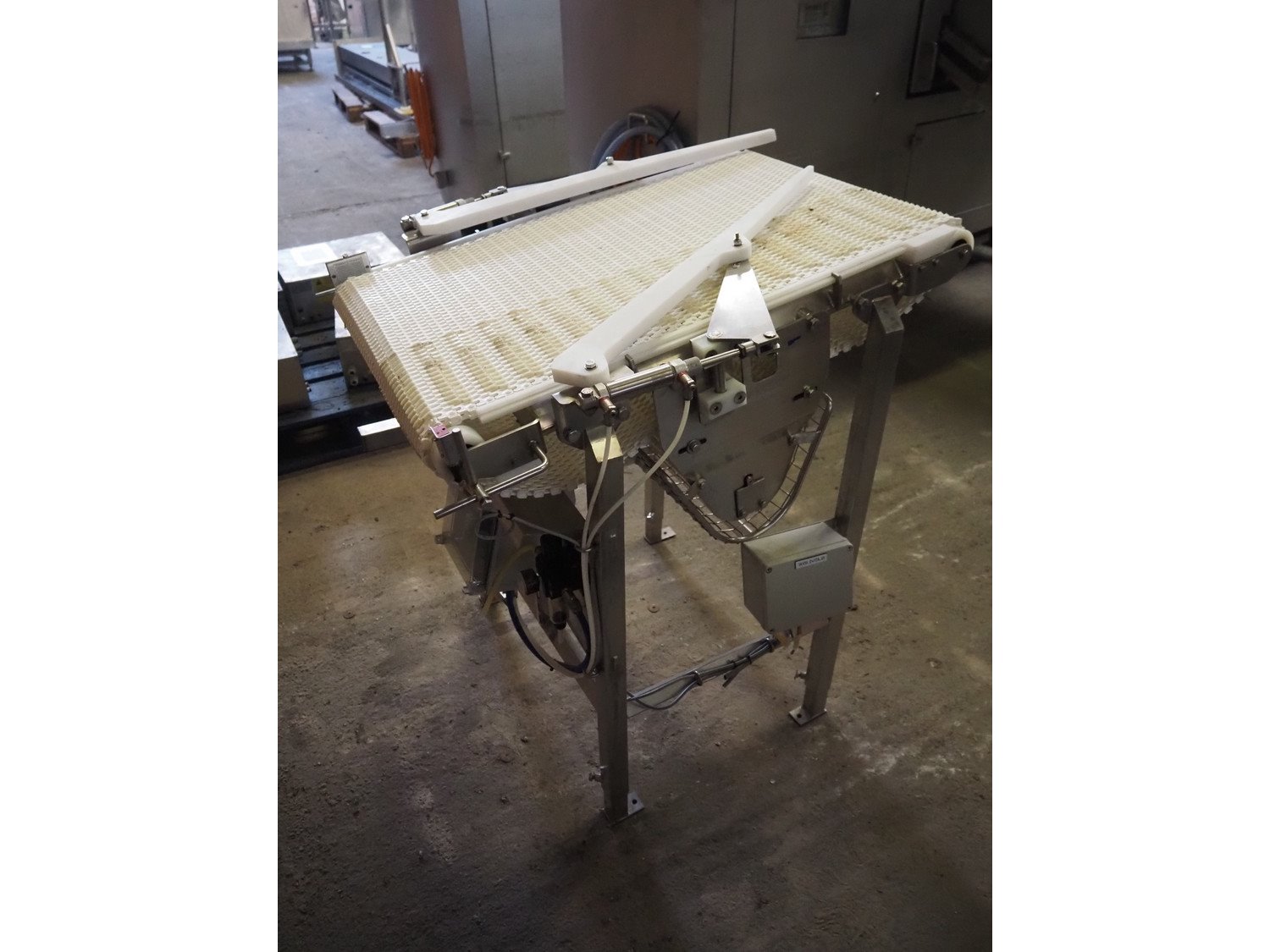 Carnitech elevating belt, type: PM45, year of construction: 2005, 4.12 A, plastic mesh belt, belt width: 570 mm, elevating height: 1050 mm, total dimensions: 1000 mm x 900 mm x 1100 mm.