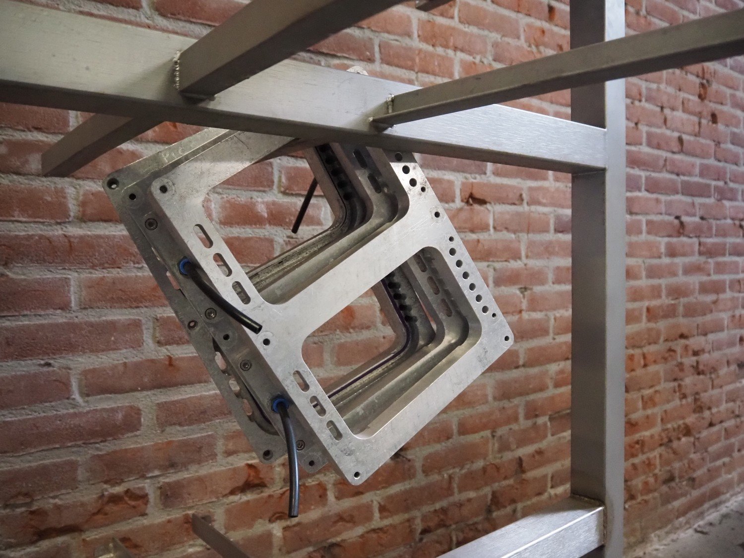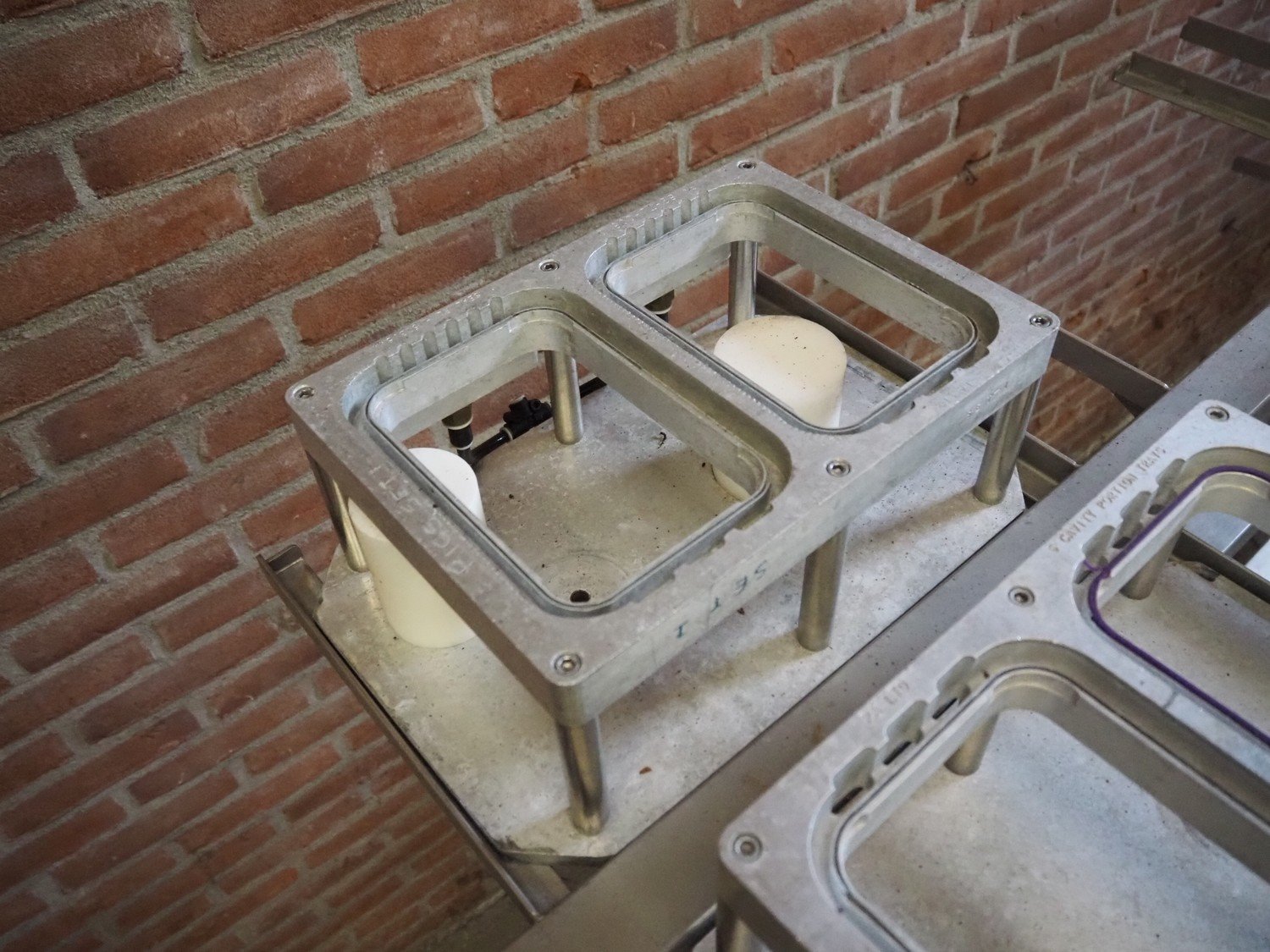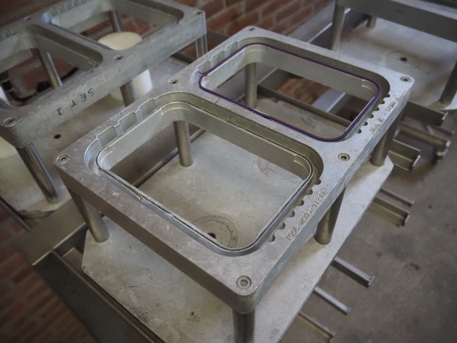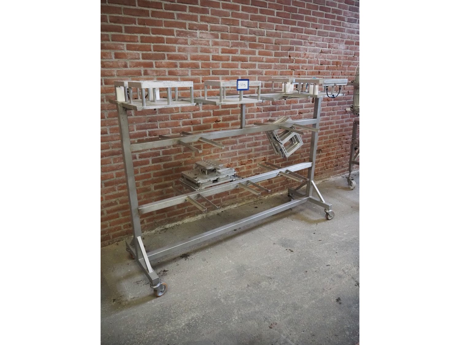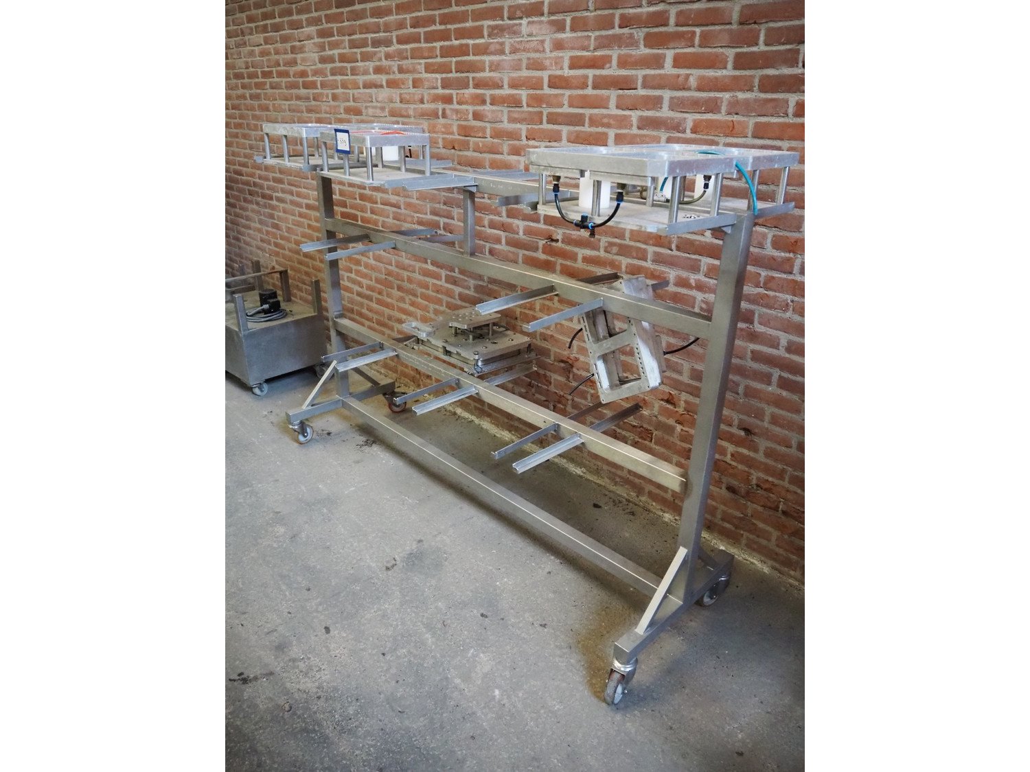 Trolley with dyes for traysealer, dyes dimensions: 145 mm x 205 mm & 280 mm x 175 mm, total dimensions: 2050 mm x 600 mm x 1500 mm.