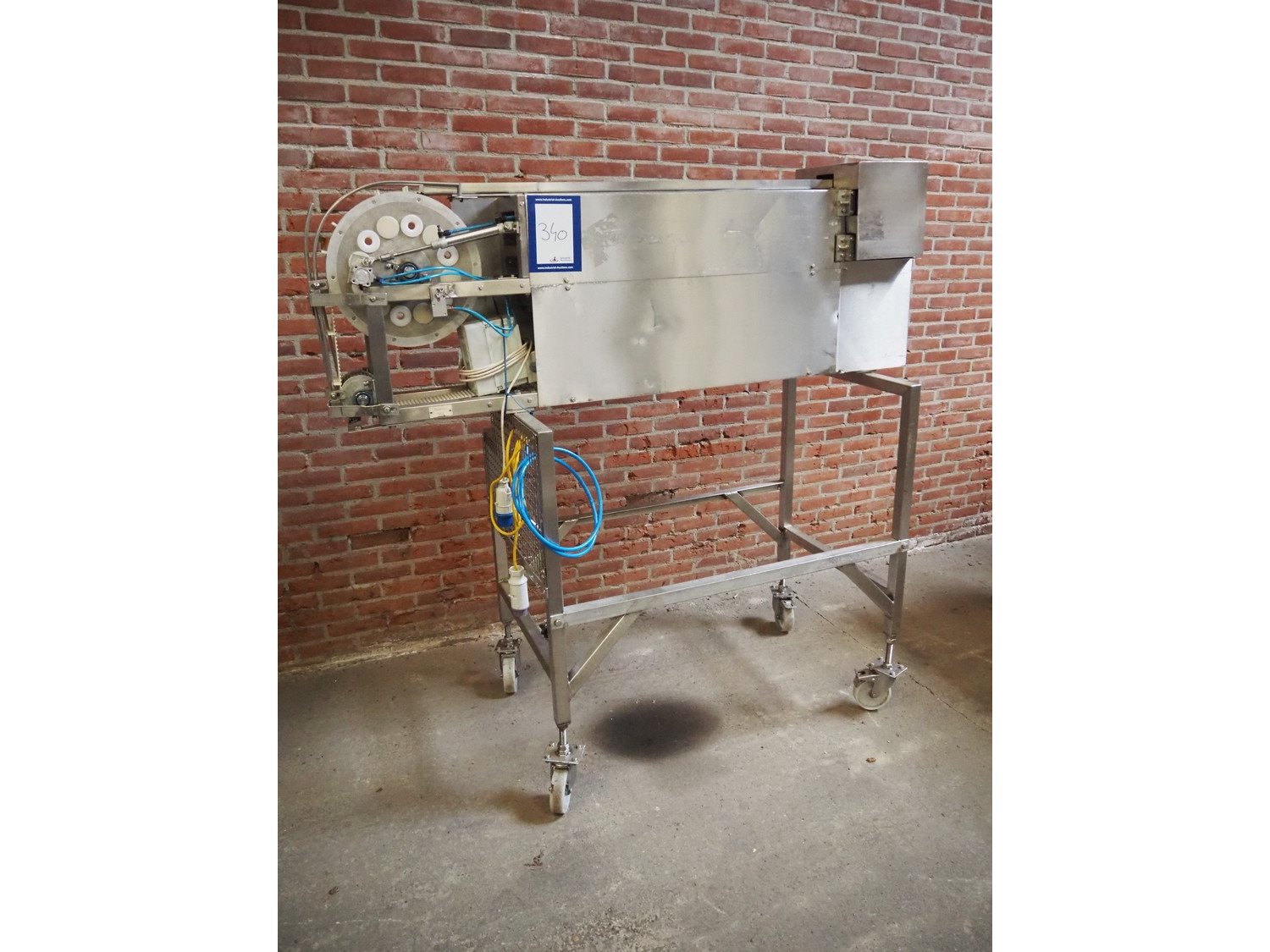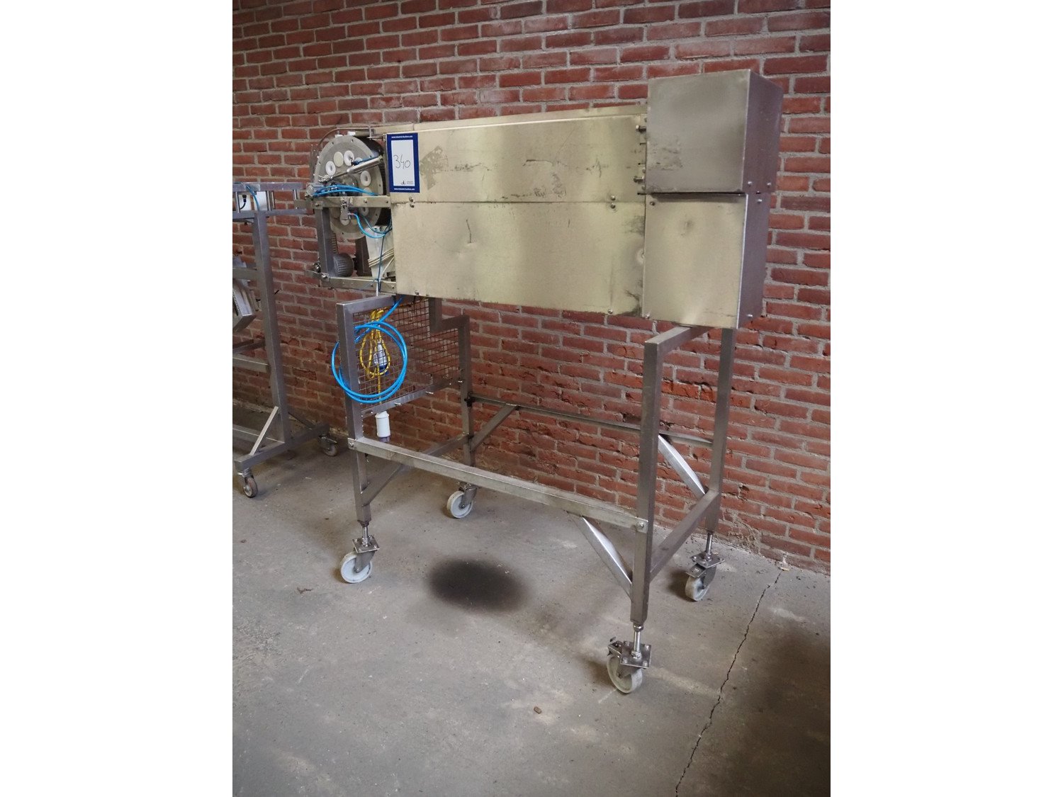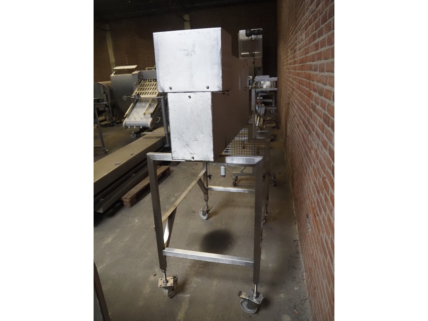 Mobile de-boning conveyor, plastic belt, belt width: 80 mm, divider height: 15 mm, total dimensions: 1900 mm x 800 mm x 1800 mm.