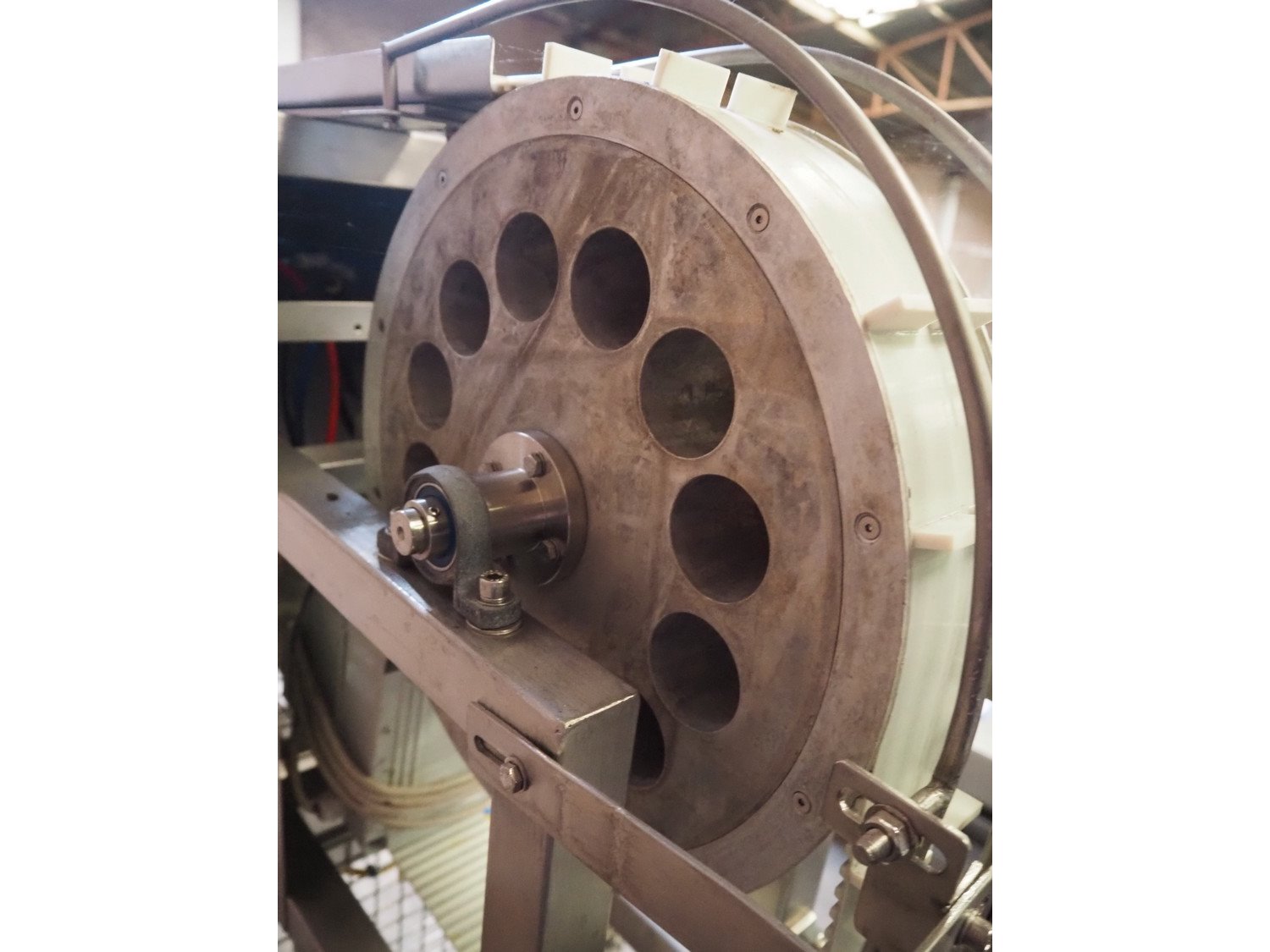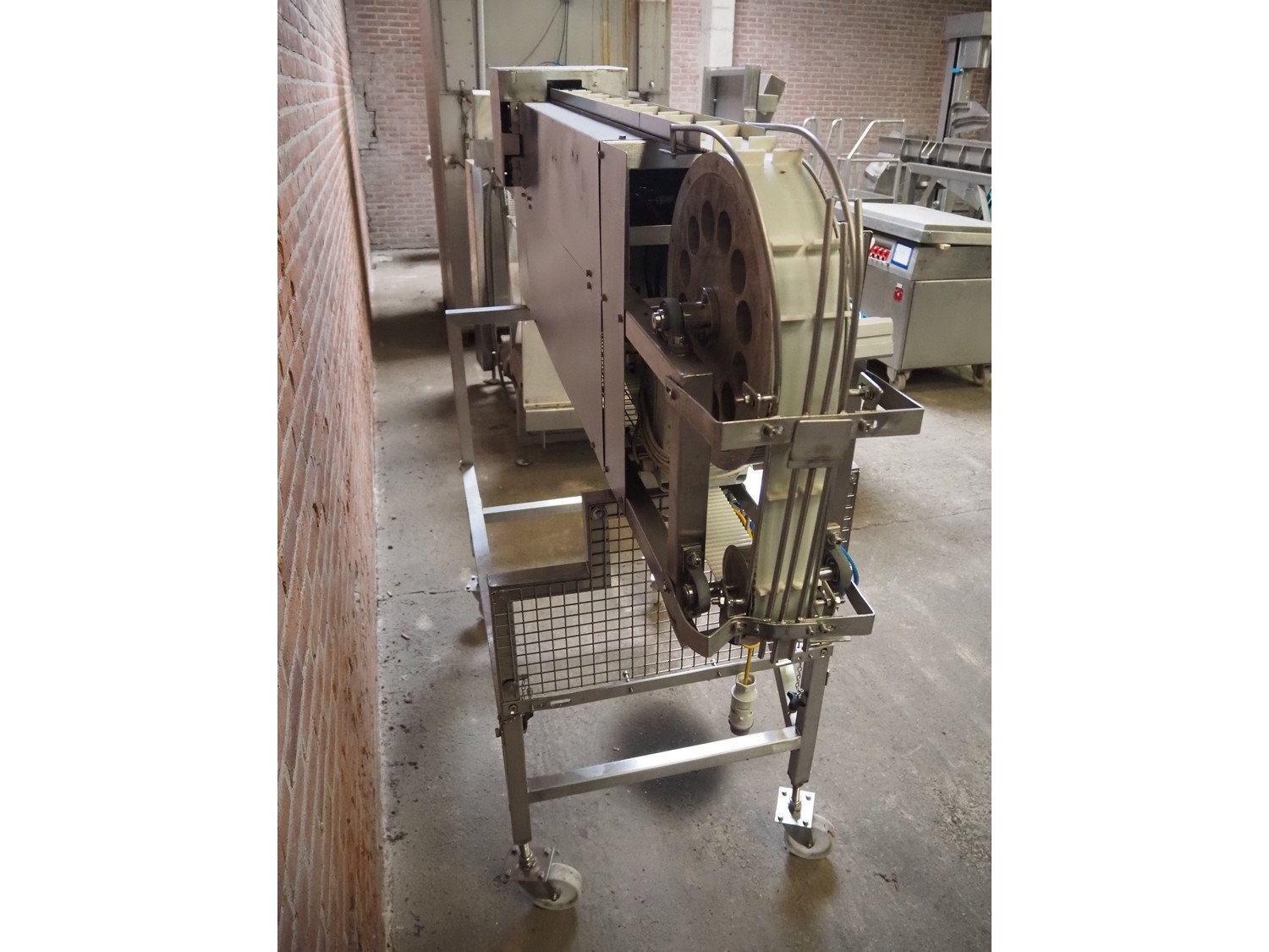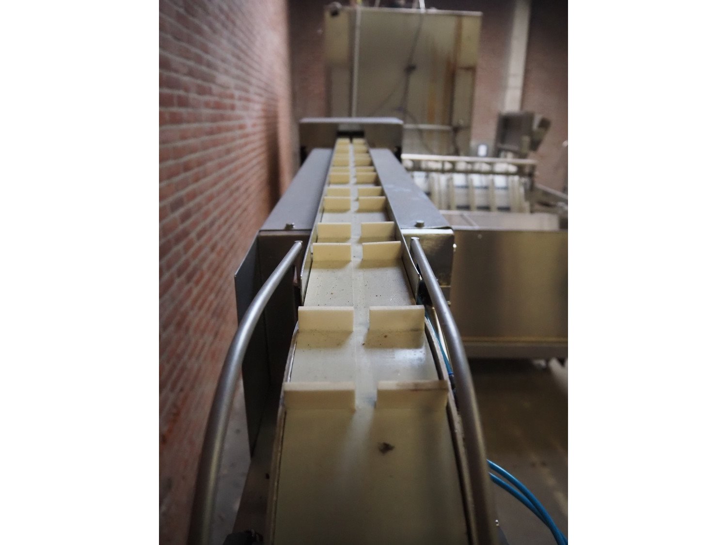 Mobile de-boning conveyor, plastic belt, belt width: 80 mm, divider height: 15 mm, total dimensions: 1900 mm x 800 mm x 1800 mm.