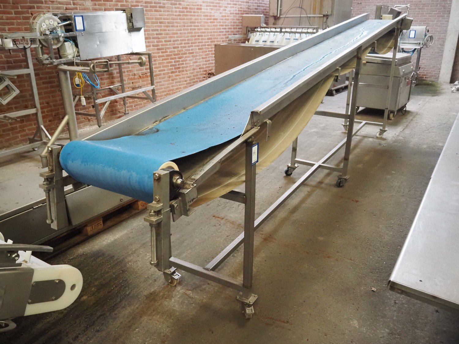 Mobile elevating belt, plastic belt, belt width: 490 mm, elevating height: 1620 mm, total dimensions: 5600 mm x 600 mm x 1700 mm.