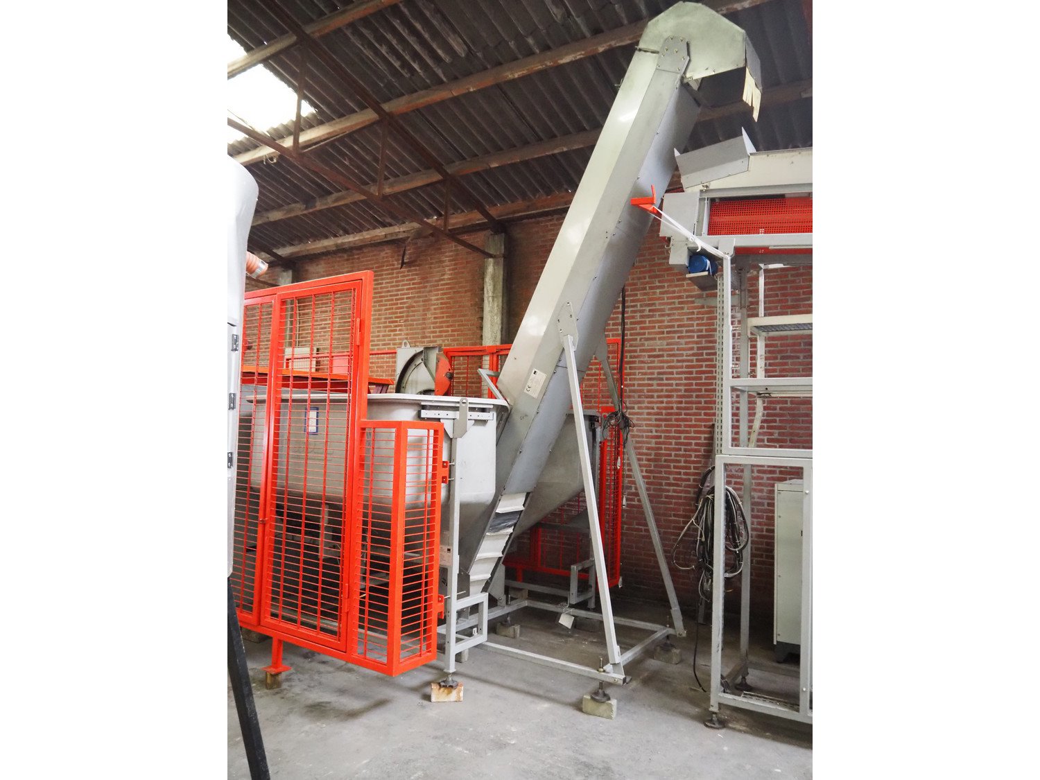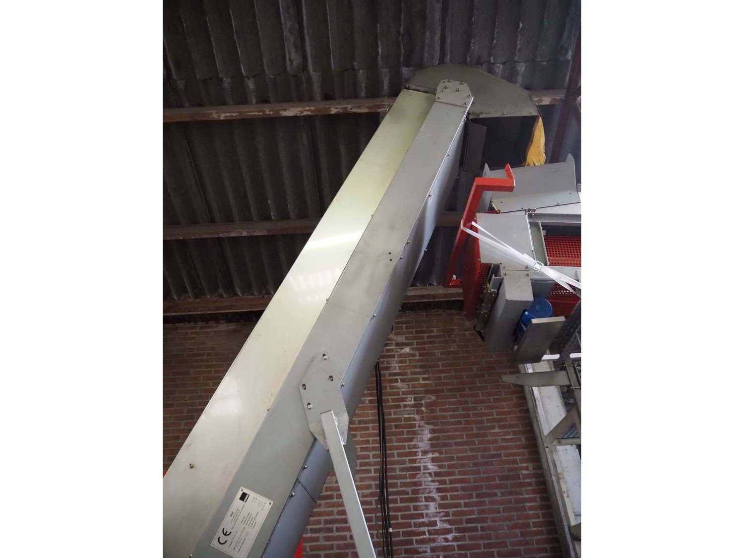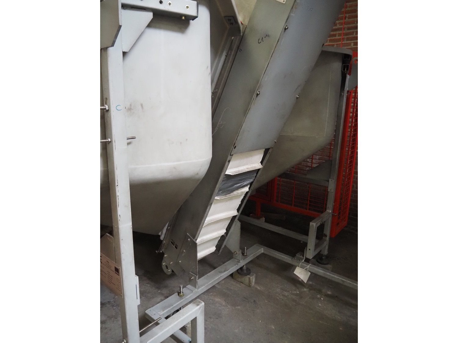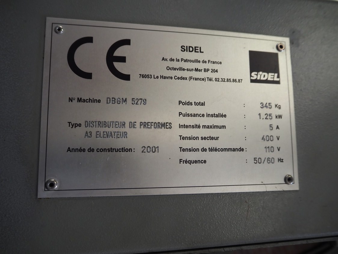 Sidel infeed bunker with elevating belt, type: Distributeur de Preformes A3 Elevateur, year of construction: 2001, 400 V, 50/60 Hz, 1.25 kW, 5 A, 345 kg, inside dimensions hopper: 2600 mm x 2000 mm x 1300 mm, elevating belt width divider, plastic belt, belt width: 400 mm, distance between dividers: 200 mm, divider height: 40 mm, elevating height: 4250 mm, total dimensions: 3900 mm x 3400 mm x 4950 mm.