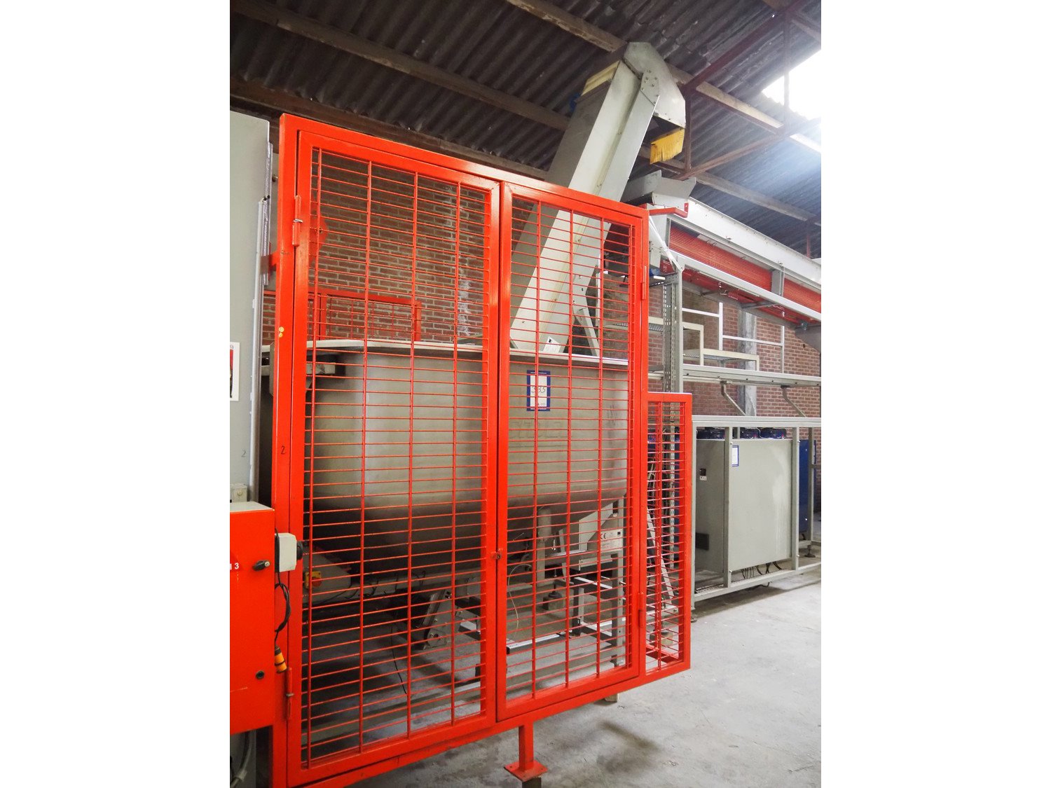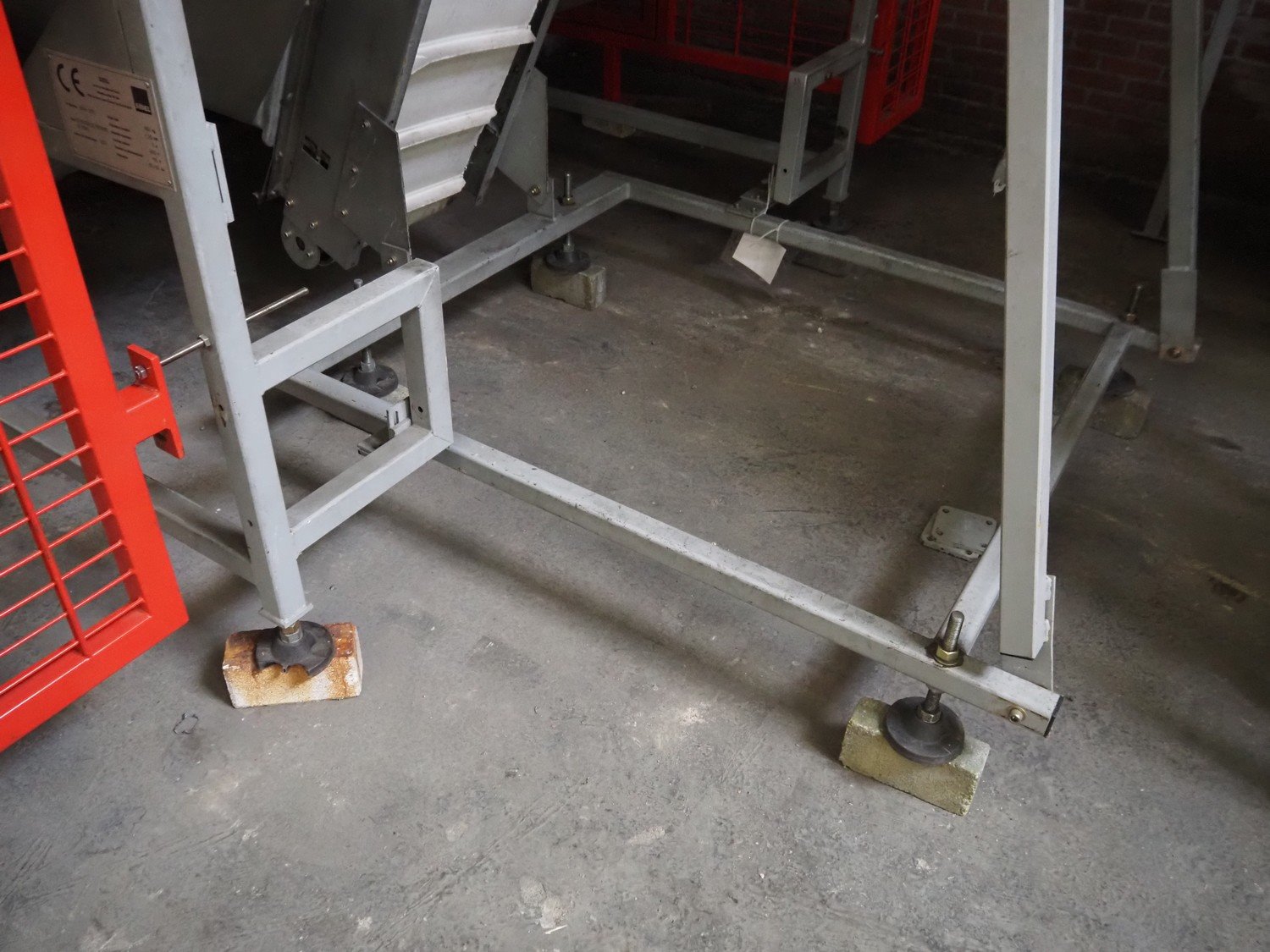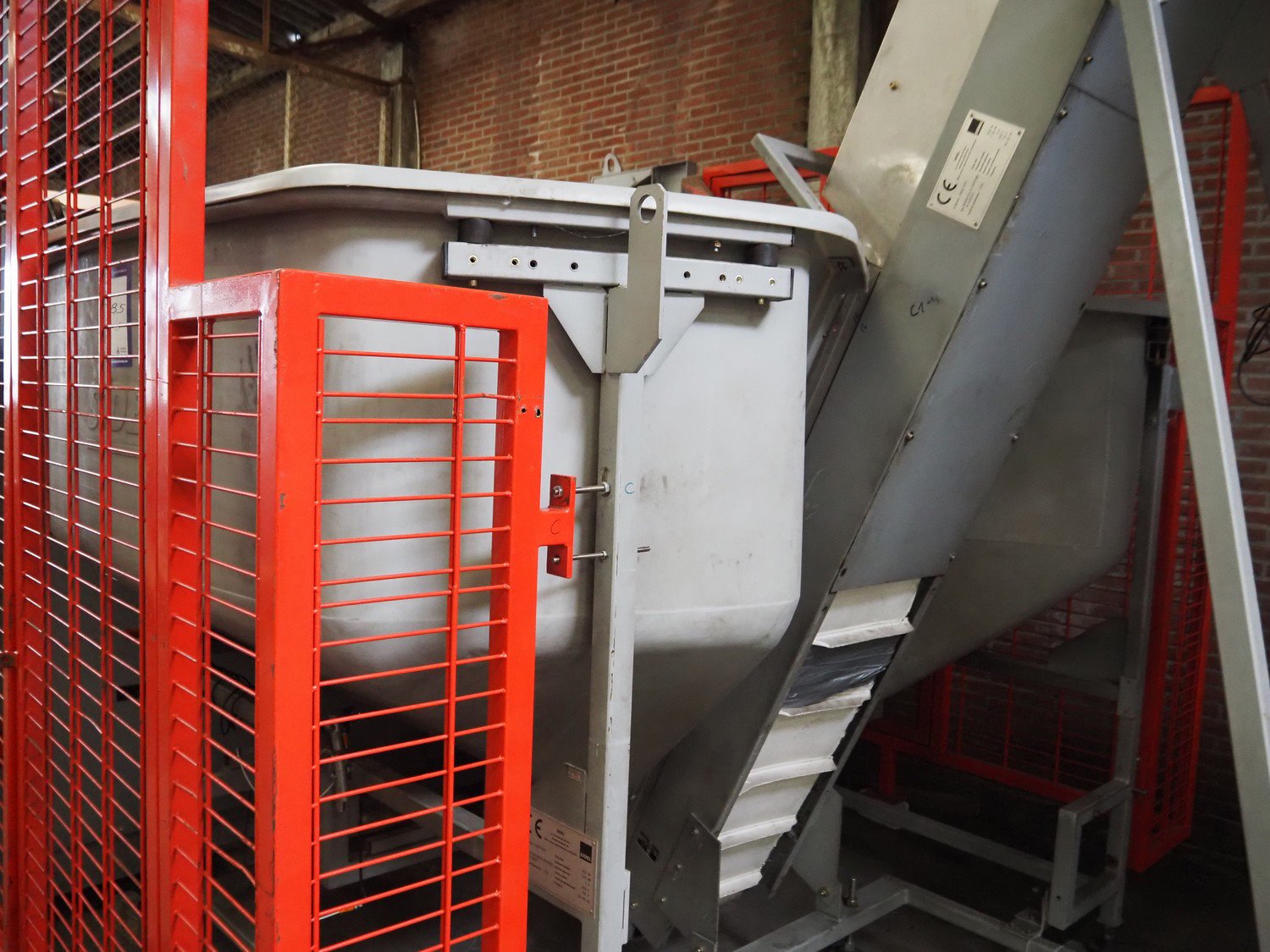 Sidel infeed bunker with elevating belt, type: Distributeur de Preformes A3 Elevateur, year of construction: 2001, 400 V, 50/60 Hz, 1.25 kW, 5 A, 345 kg, inside dimensions hopper: 2600 mm x 2000 mm x 1300 mm, elevating belt width divider, plastic belt, belt width: 400 mm, distance between dividers: 200 mm, divider height: 40 mm, elevating height: 4250 mm, total dimensions: 3900 mm x 3400 mm x 4950 mm.