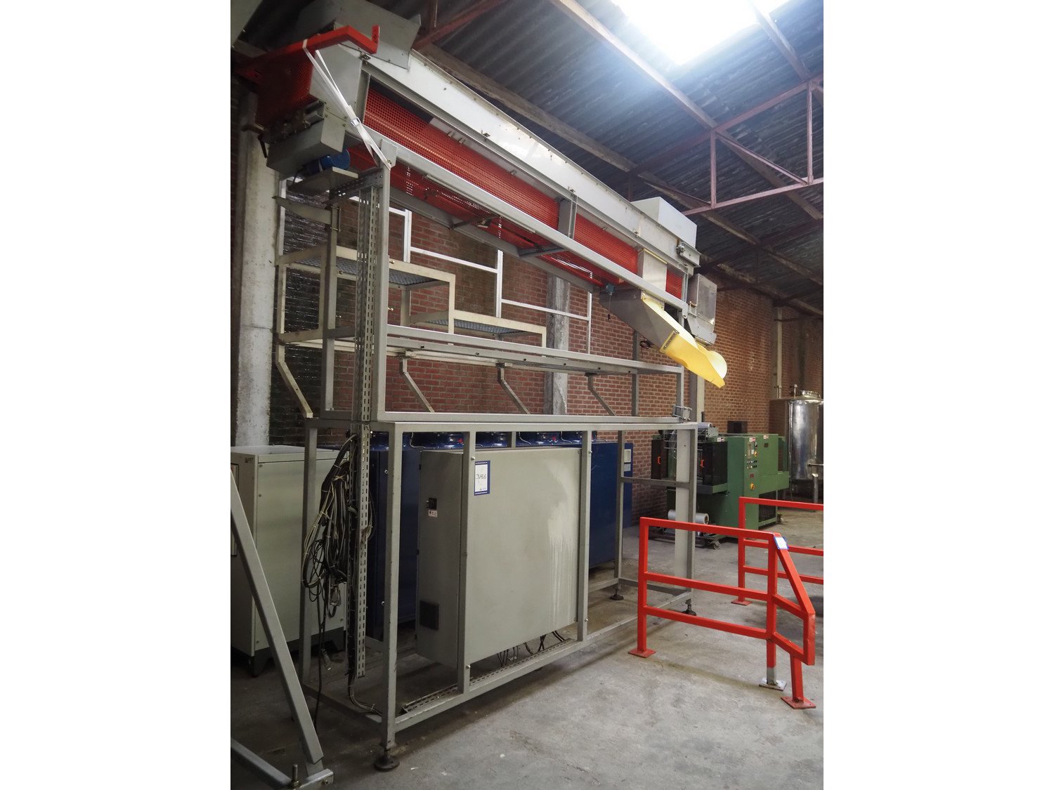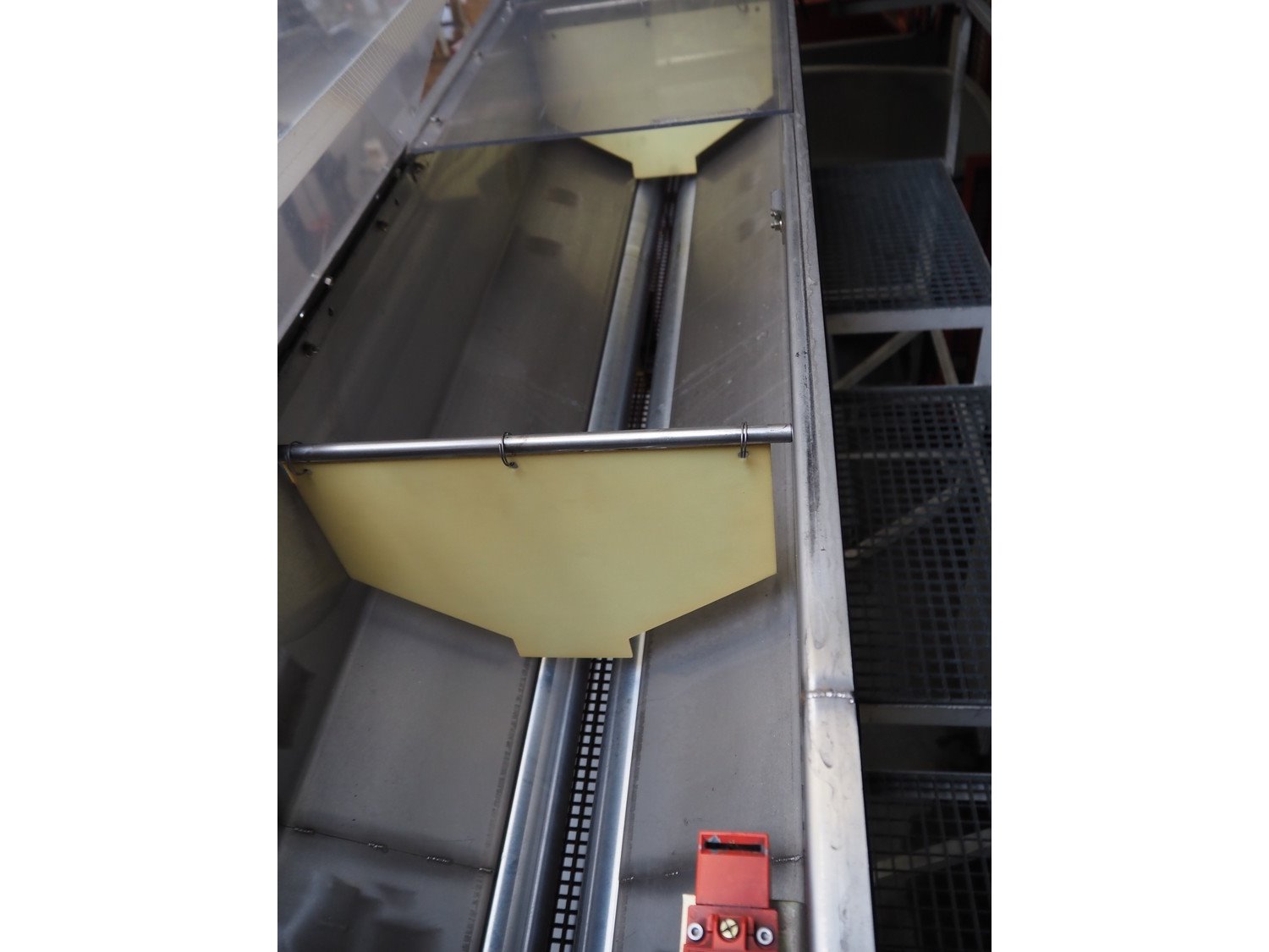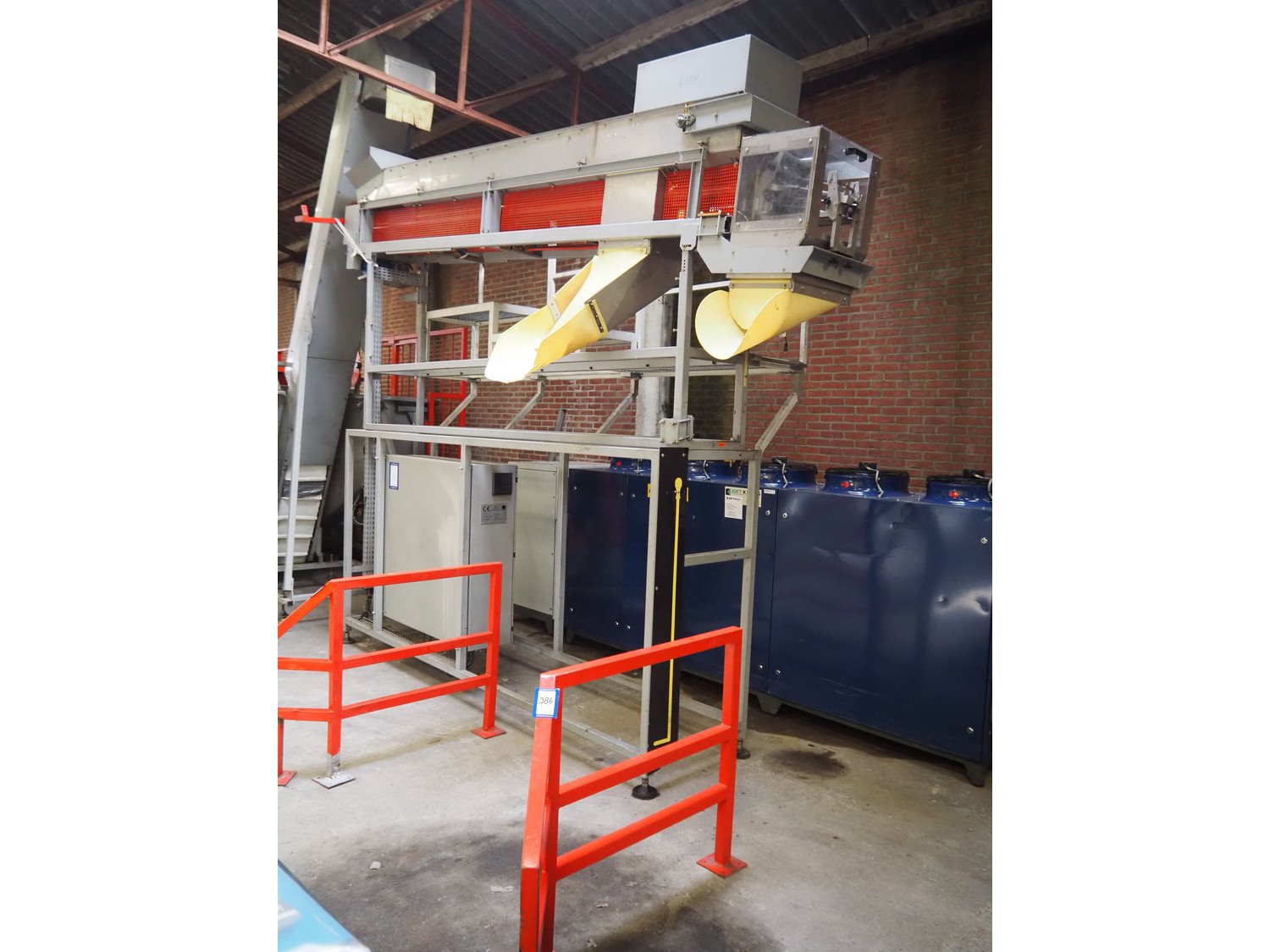 Sidel sorting conveyor, type: Distributeur De Preformes A3 Chassis + Coffret, machine number: DBGM 5279, year of construction: 2001, 400 V, 50/60 Hz, 5 A, 1.25 kW, 200 kg, infeed height: 3800 mm, outfeed height: 2800 mm, total dimensions: 4350 mm x 1800 mm x 3800 mm. Including 2 steel protection frames.