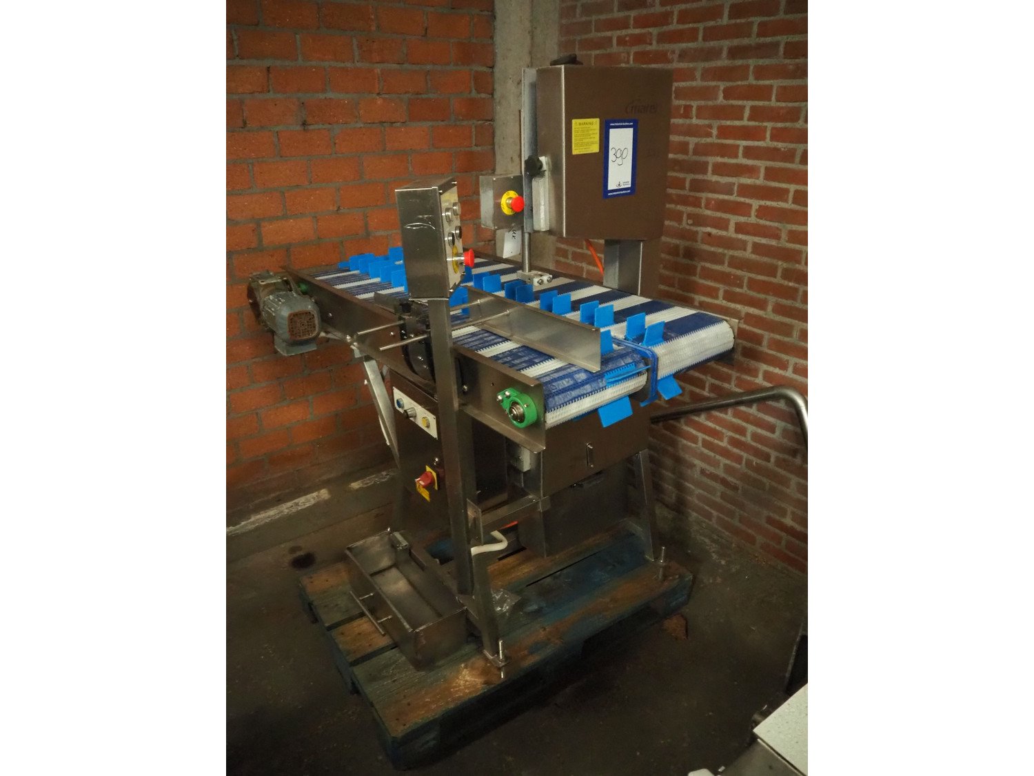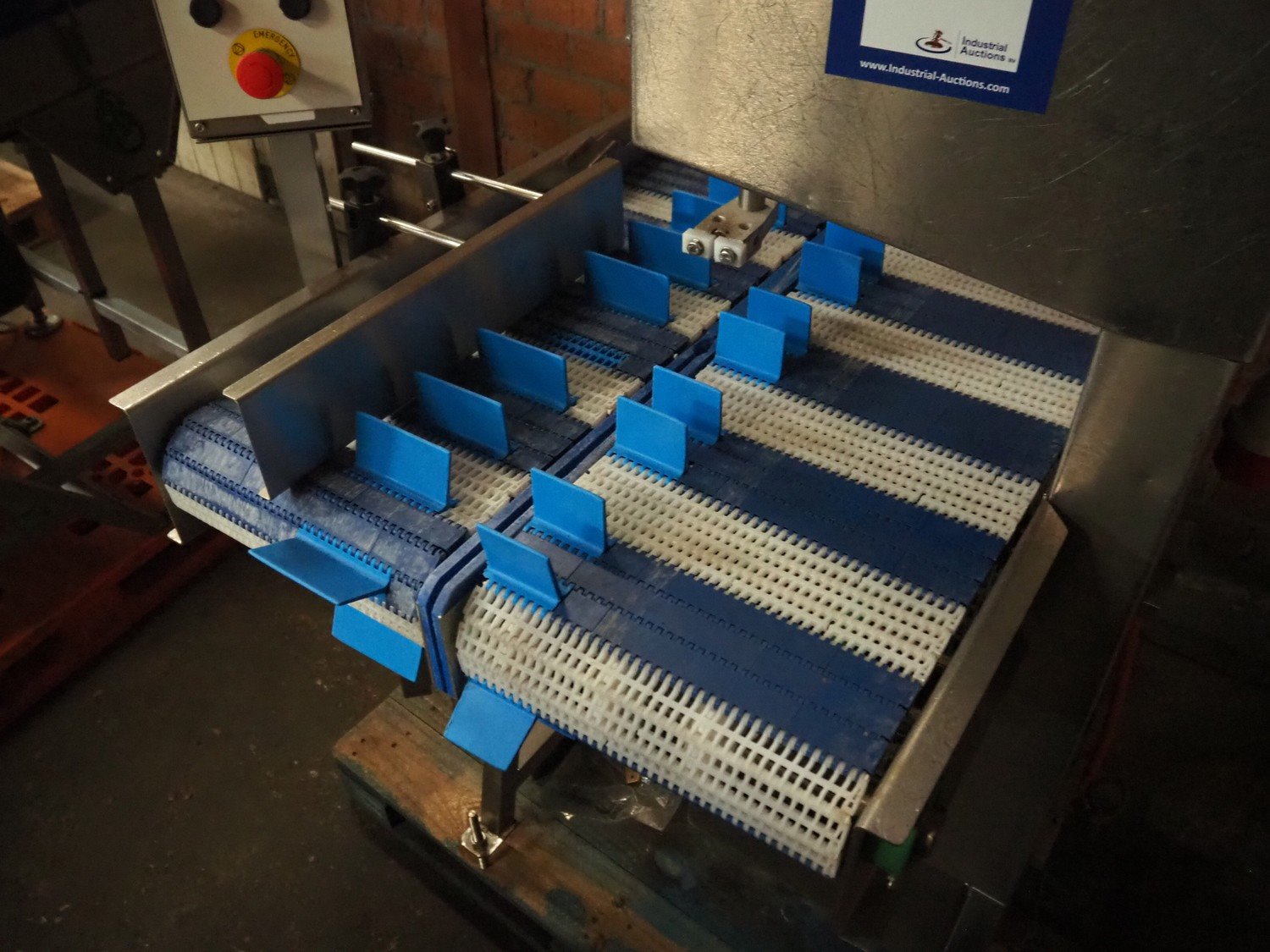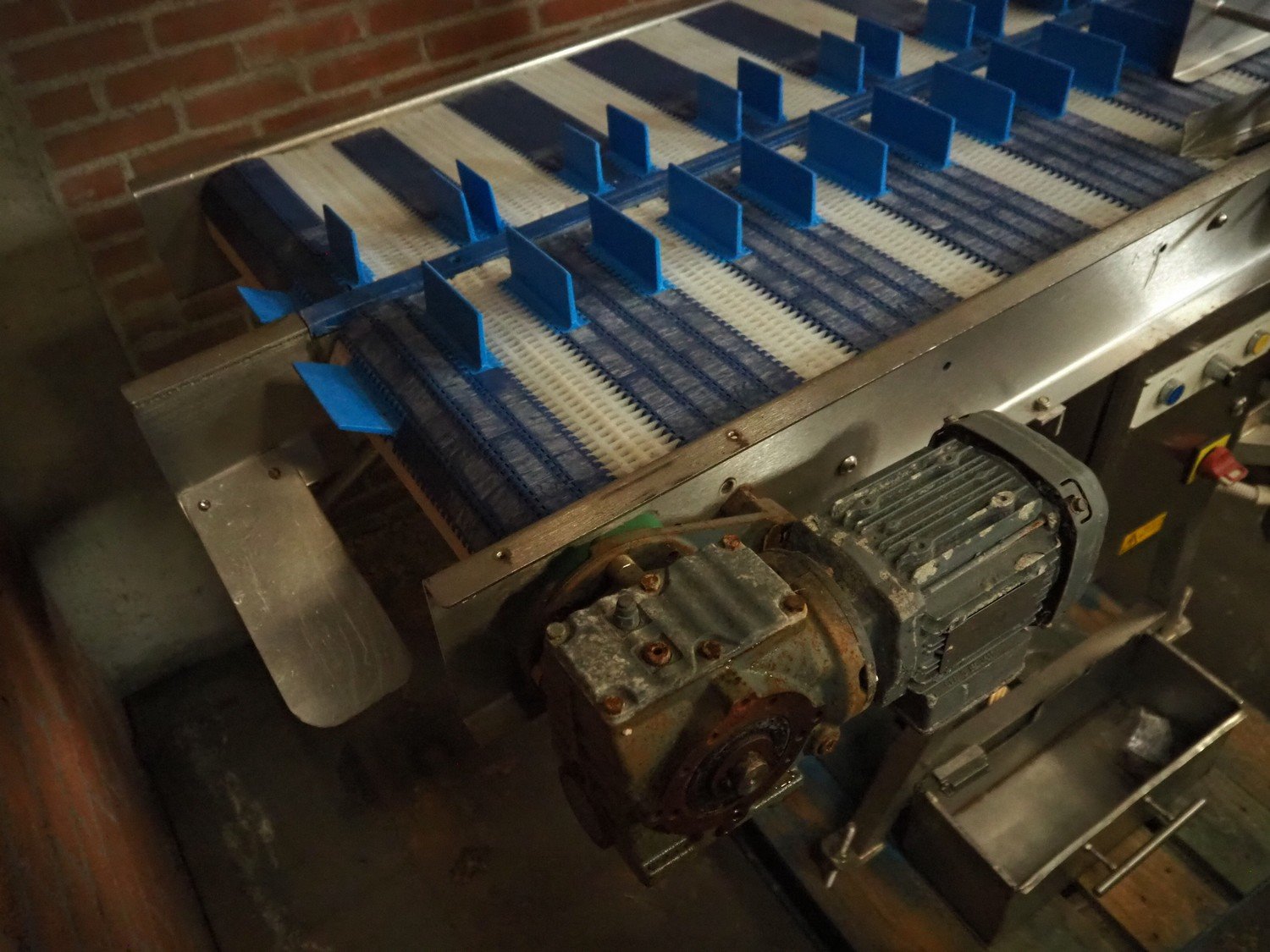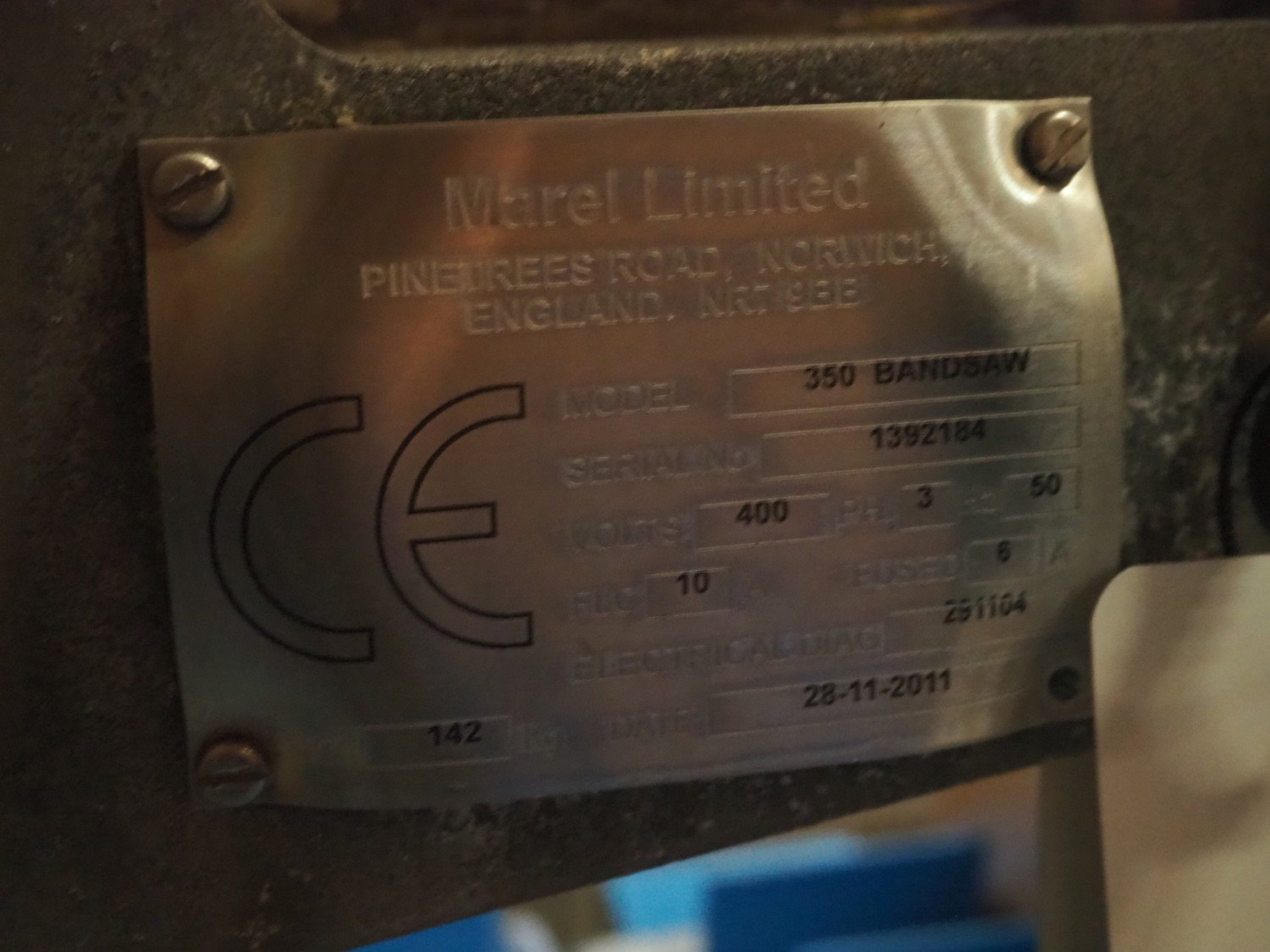 Marel bandsaw, model: 350 bandsaw, serial number: 1392184, year of construction: 2011, 400 V, 3 Ph, 50 Hz, 10 A, plastic belt with dividers, belt width: 310 mm, total dimensions: 1550 mm x 1000 mm x 1670 mm. Incomplete.