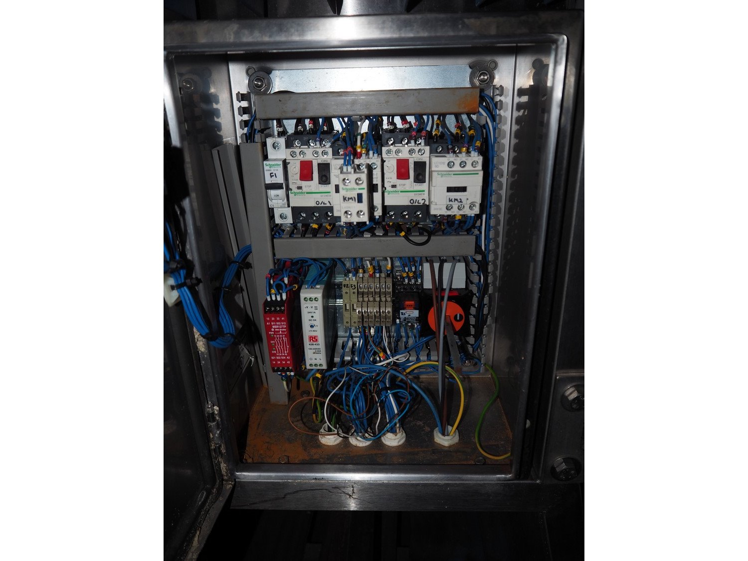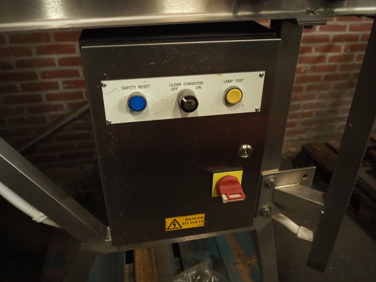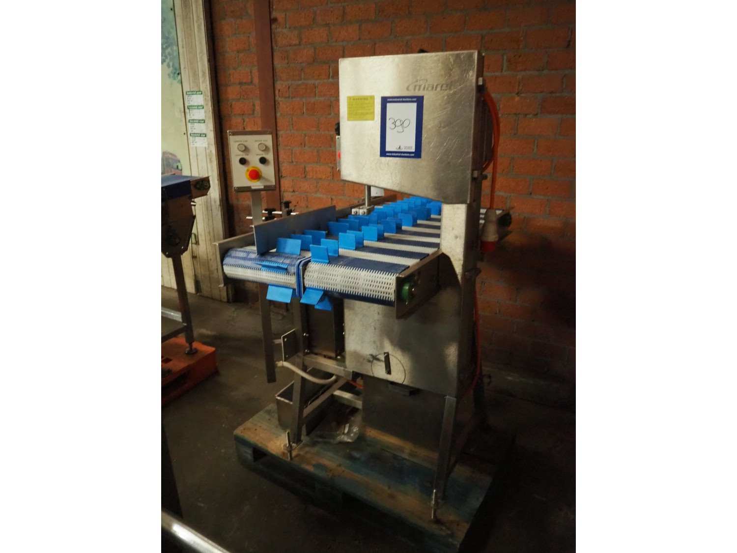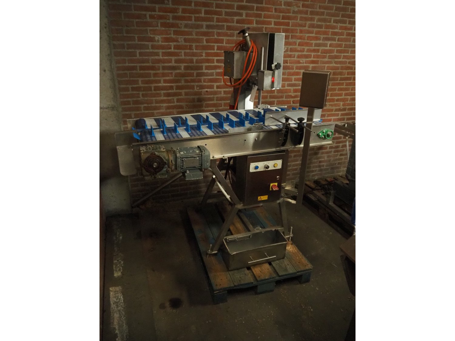 Marel bandsaw, model: 350 bandsaw, serial number: 1392184, year of construction: 2011, 400 V, 3 Ph, 50 Hz, 10 A, plastic belt with dividers, belt width: 310 mm, total dimensions: 1550 mm x 1000 mm x 1670 mm. Incomplete.