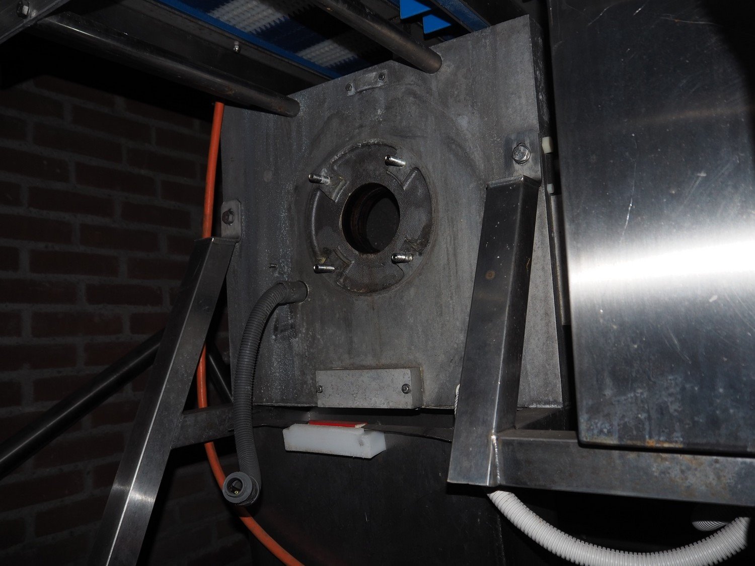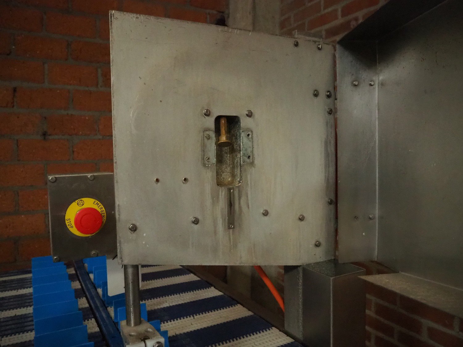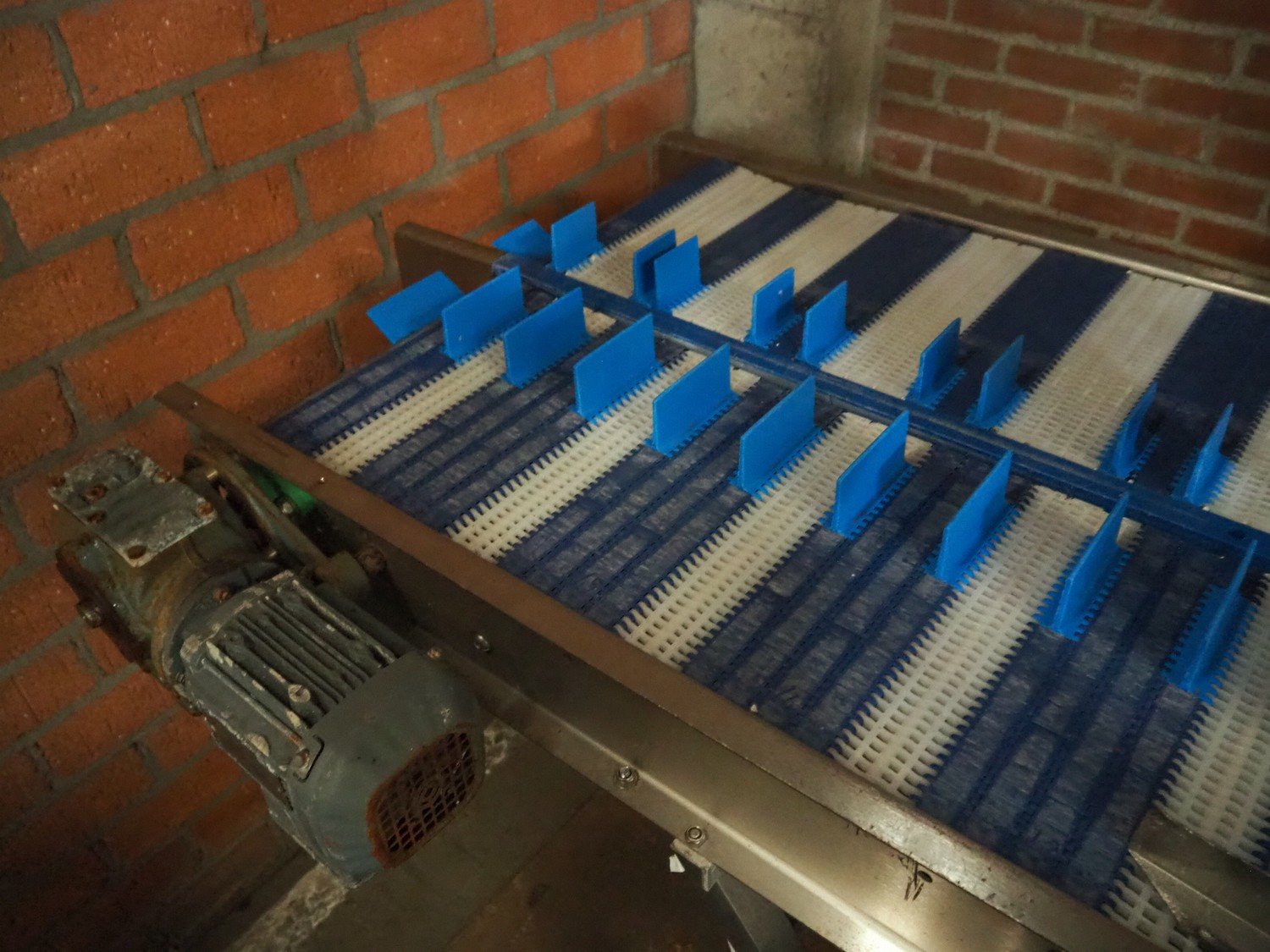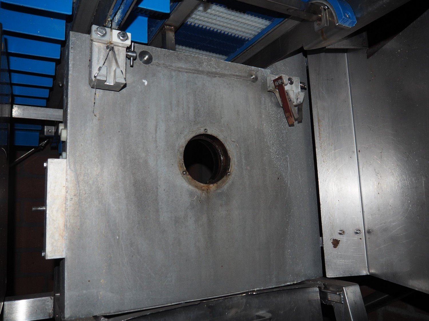 Marel bandsaw, model: 350 bandsaw, serial number: 1392184, year of construction: 2011, 400 V, 3 Ph, 50 Hz, 10 A, plastic belt with dividers, belt width: 310 mm, total dimensions: 1550 mm x 1000 mm x 1670 mm. Incomplete.
