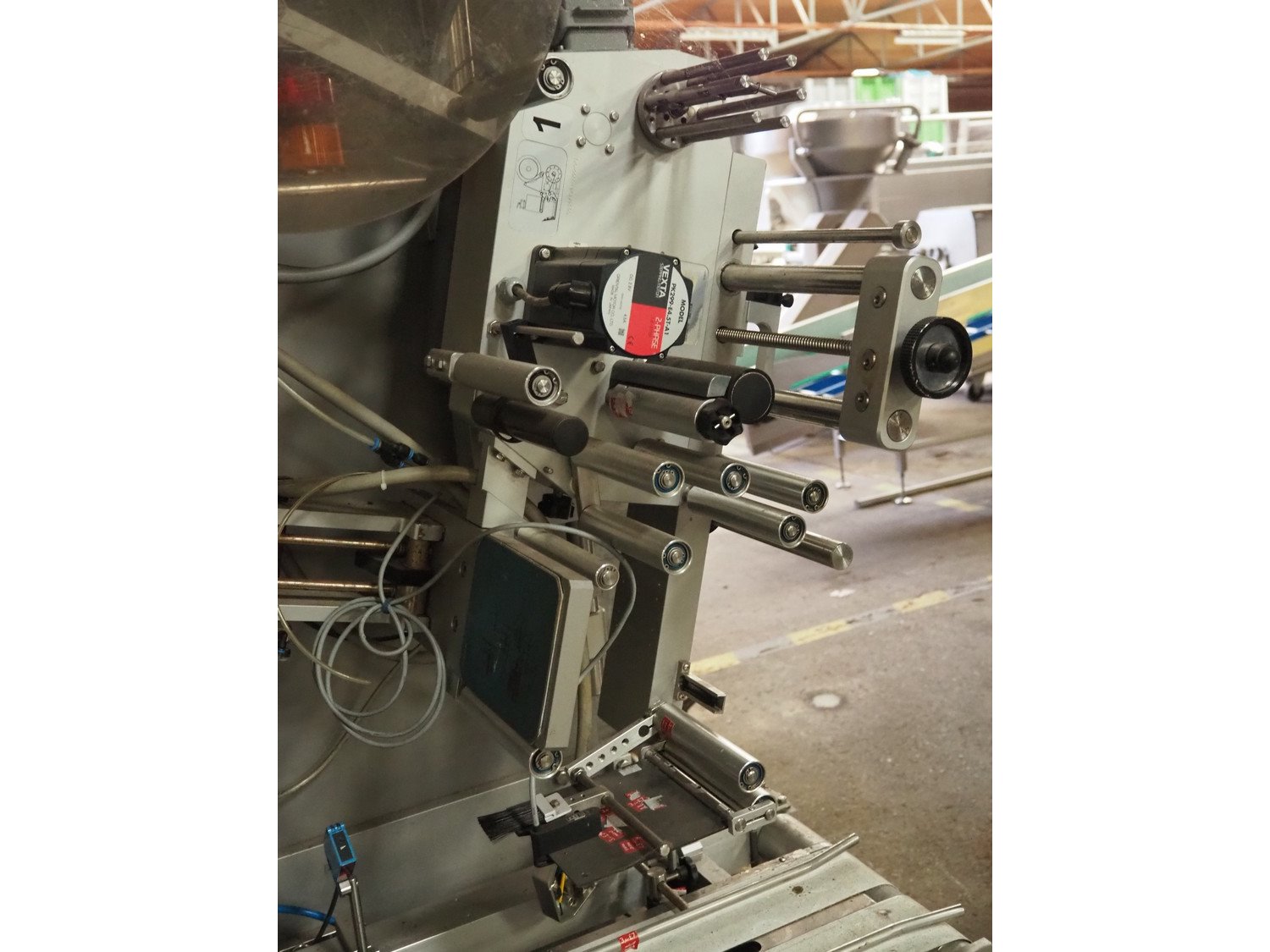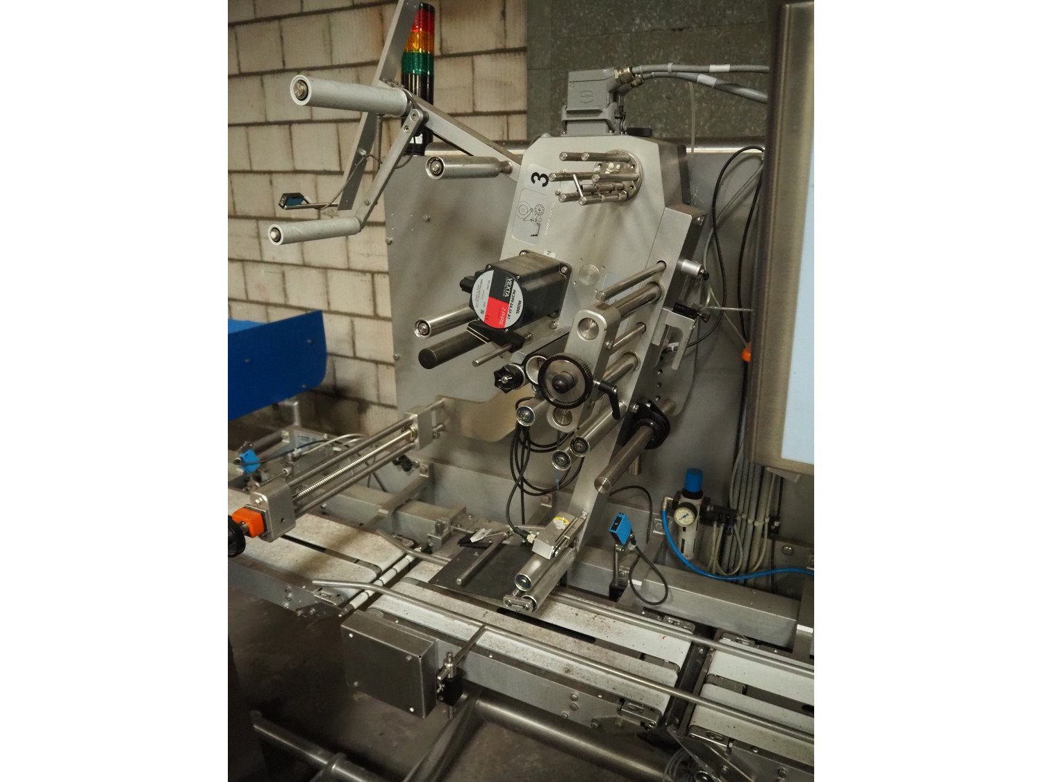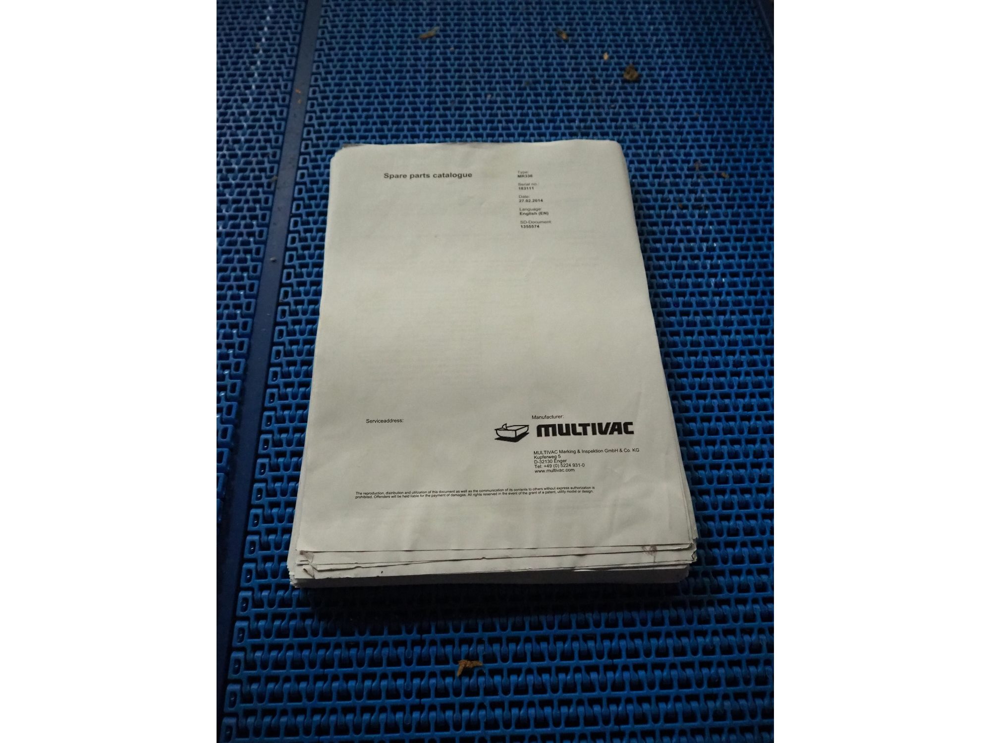 Multivac labelling machine with 2 top and 1 bottom labeller, type: MR336, machine number: 183111, year of construction: 2014, 230 V, 50/60 Hz, plastic belts, belt width: (2x) 85 mm, total dimensions: 2080 mm x 1280 mm x 2060 mm. Missing inkjet printer.