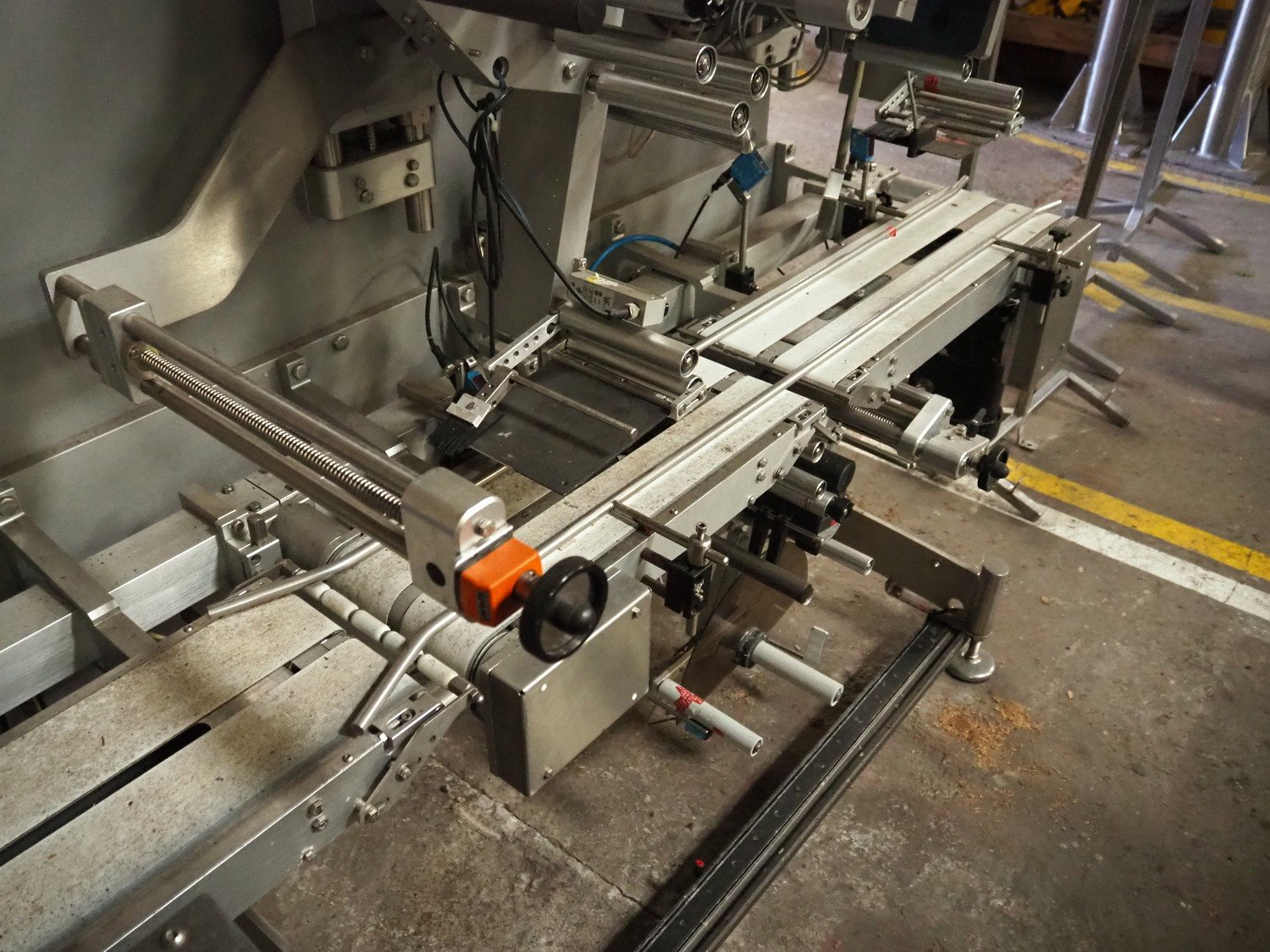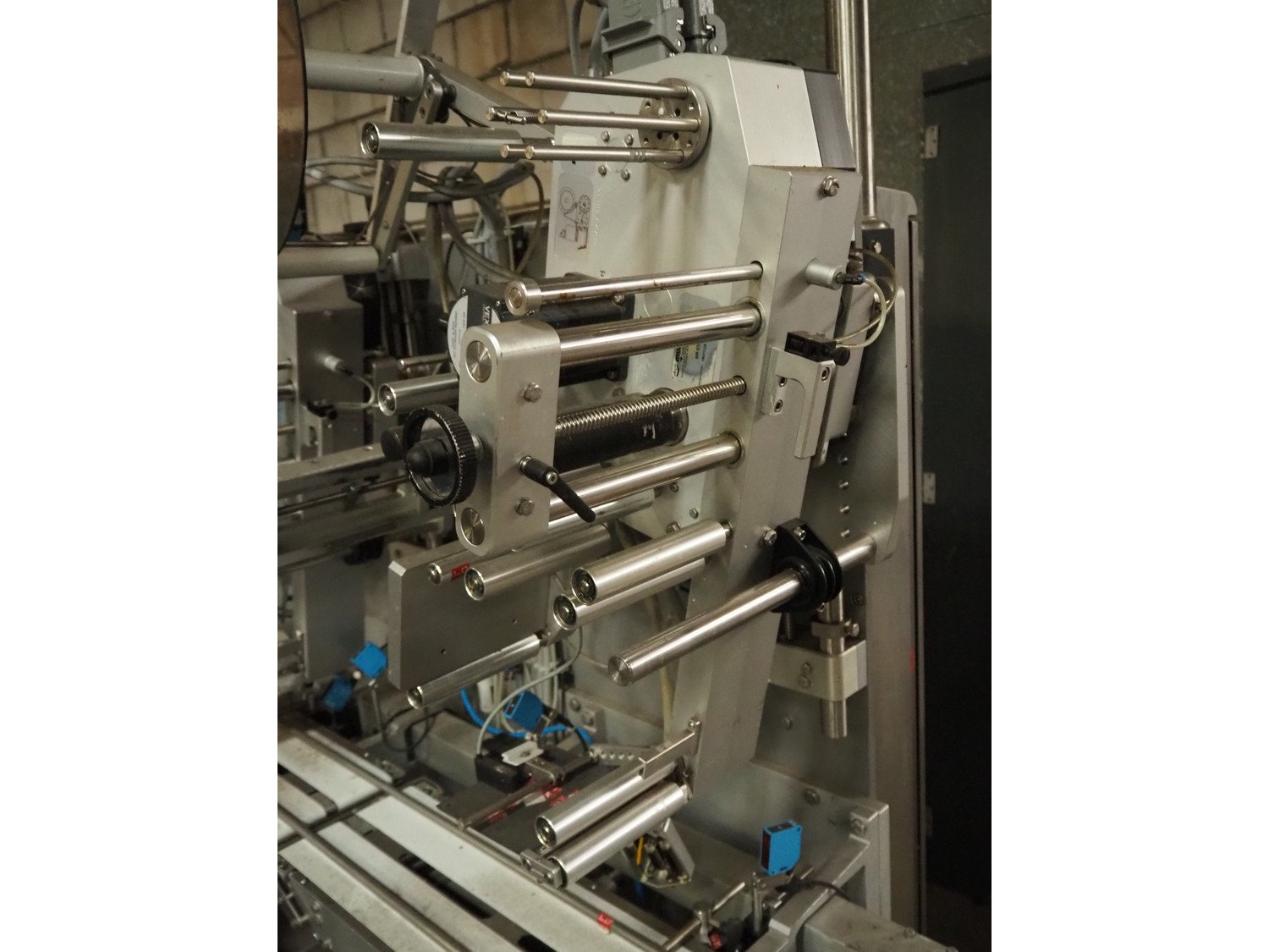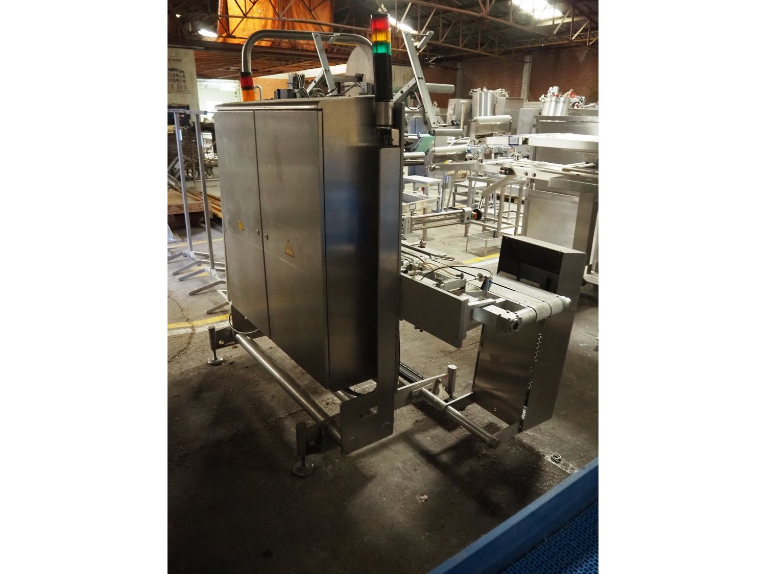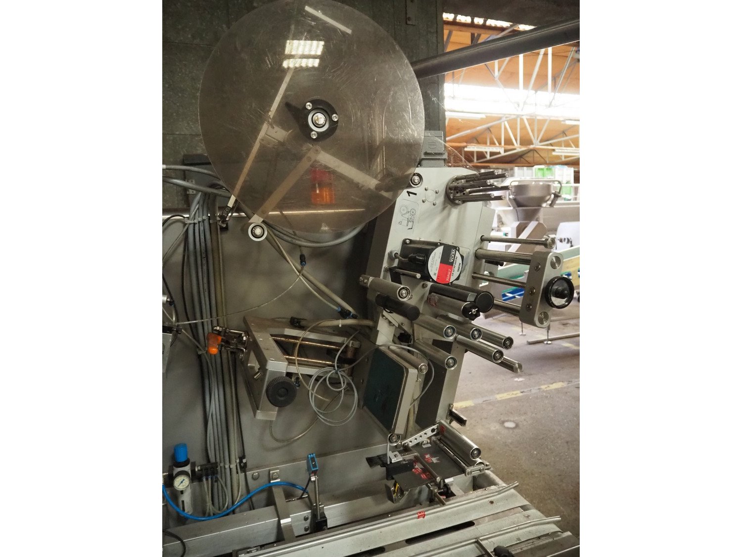 Multivac labelling machine with 2 top and 1 bottom labeller, type: MR336, machine number: 183111, year of construction: 2014, 230 V, 50/60 Hz, plastic belts, belt width: (2x) 85 mm, total dimensions: 2080 mm x 1280 mm x 2060 mm. Missing inkjet printer.