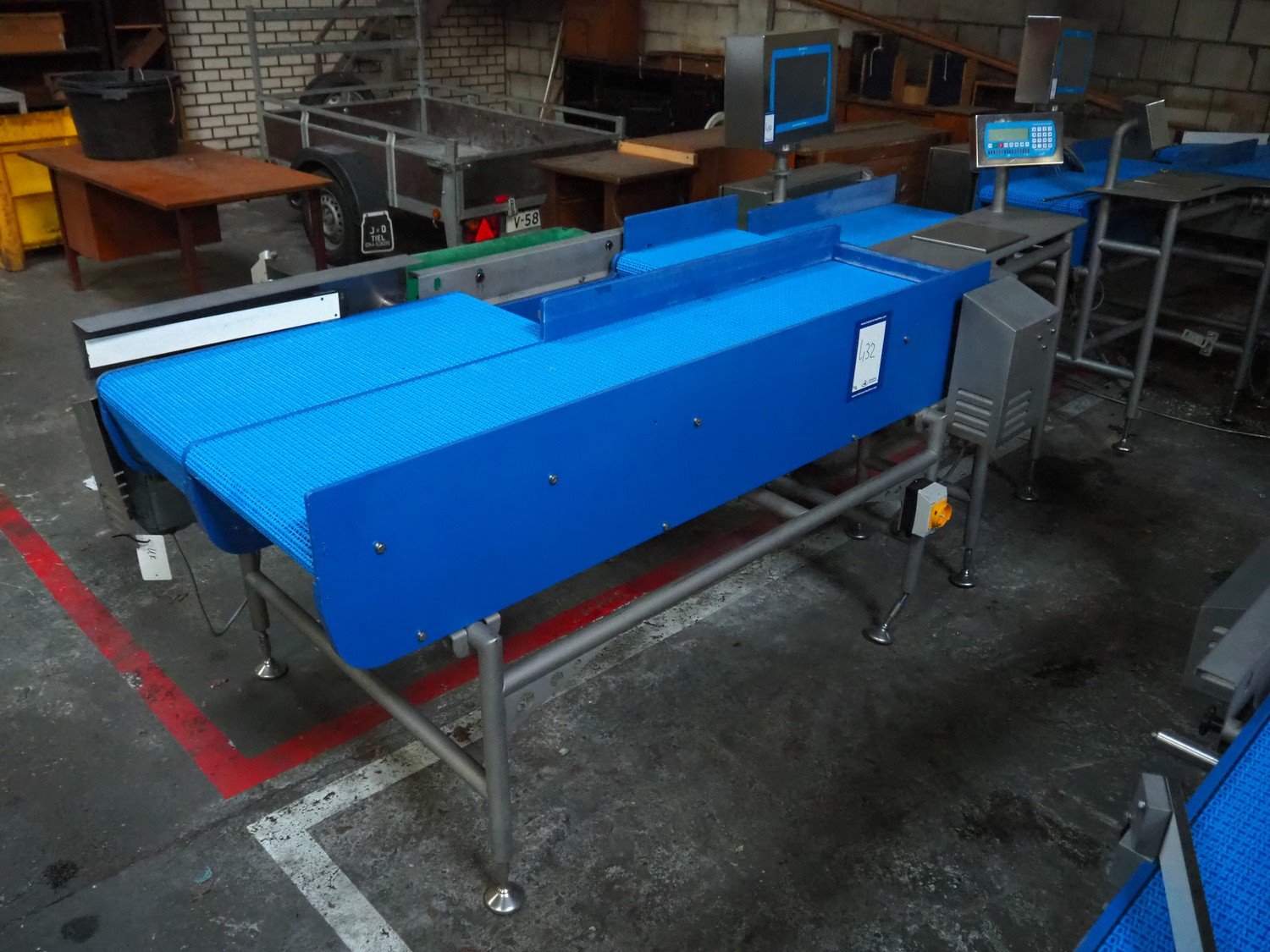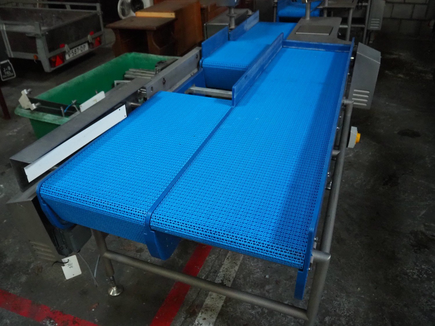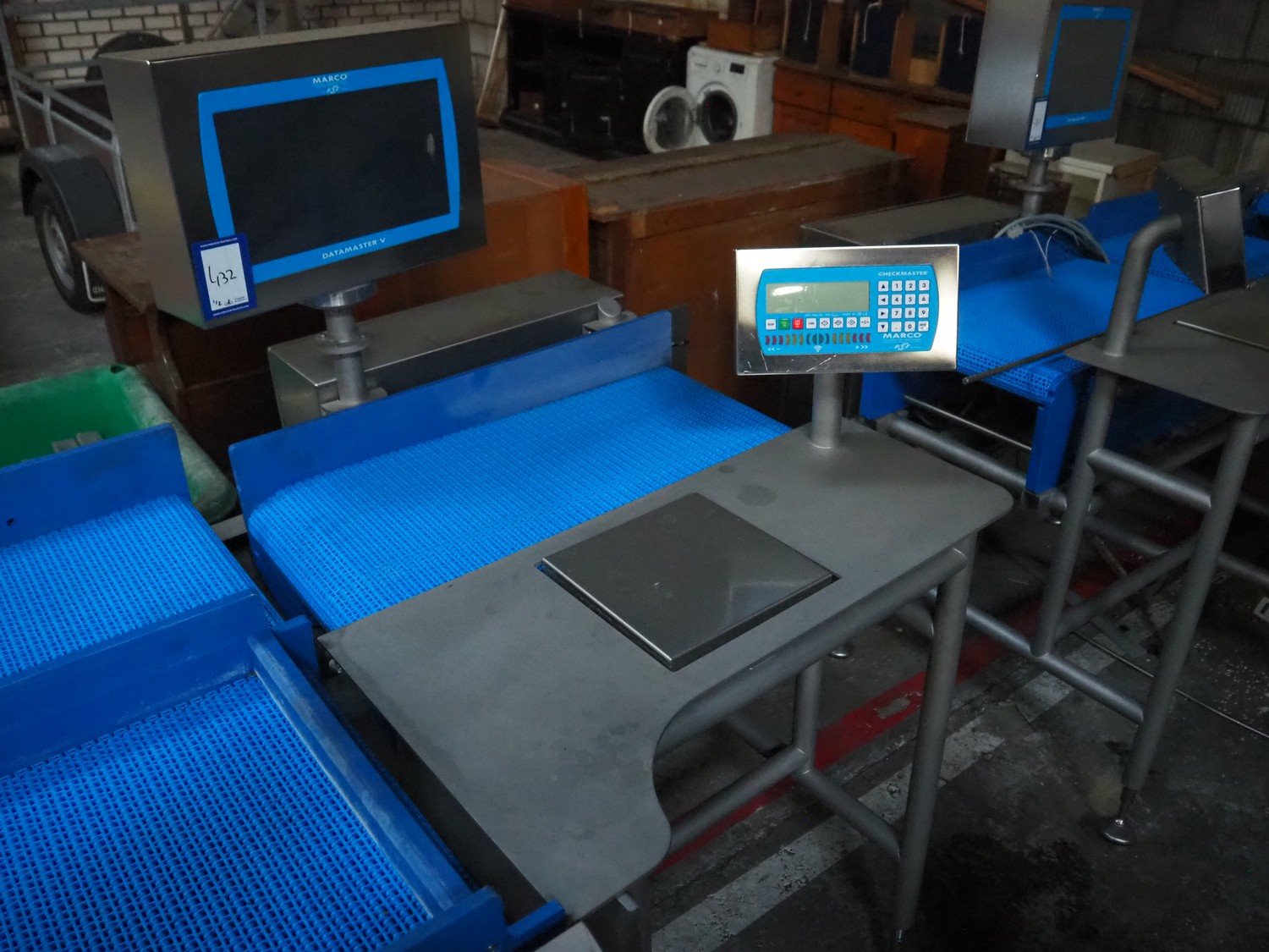 Marco checkweigher and grader, model: D135812, serial number: 10217877, year of construction: 2021, 400 V, 3 Ph, 50 Hz, plastic mesh belt, belt width: 405 mm and 455 mm, total dimensions: 2000 mm x 1200 mm x 1050 mm and 900 mm x 1200 mm x 1600 mm. Incomplete.