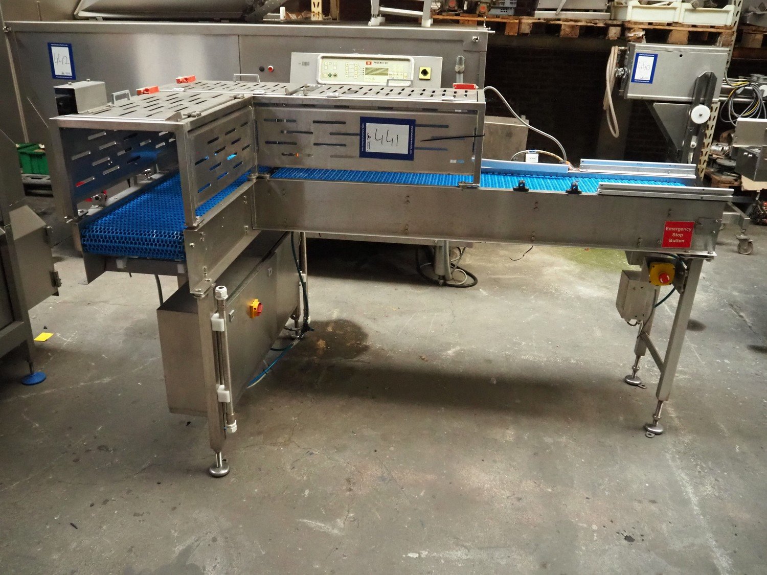 Protech 90° curve conveyor, type: 17787, serial number: 17781-0200-A, year of construction: 23-09-2011, 1.0 kW, weight: 310 kg, plastic mesh belt, belt width: 315 mm, total dimensions: 1200 mm x 2150 mm x 1300 mm.