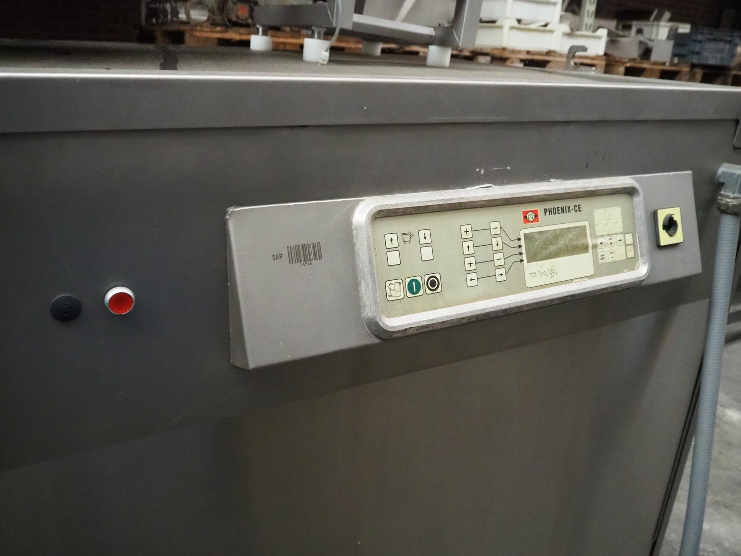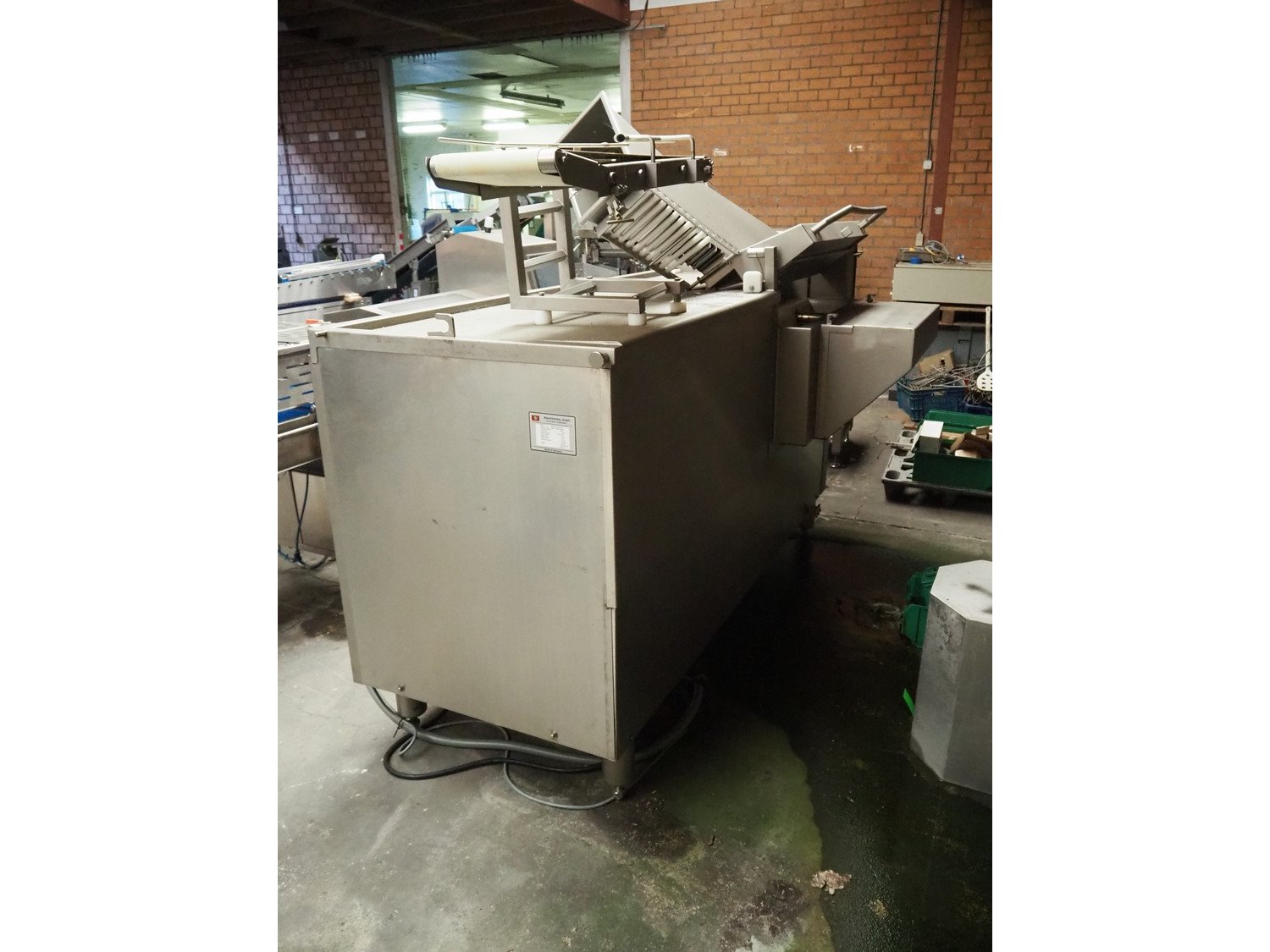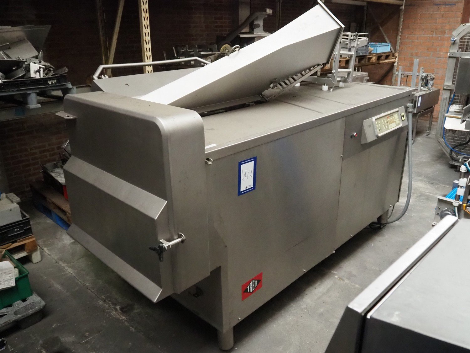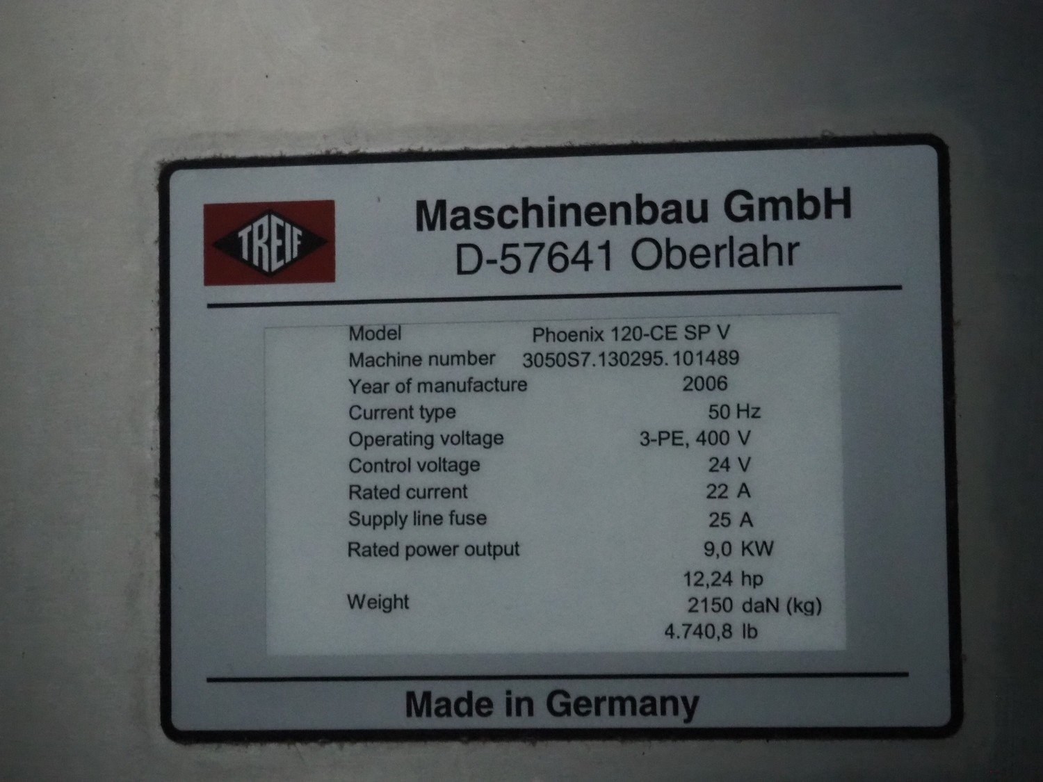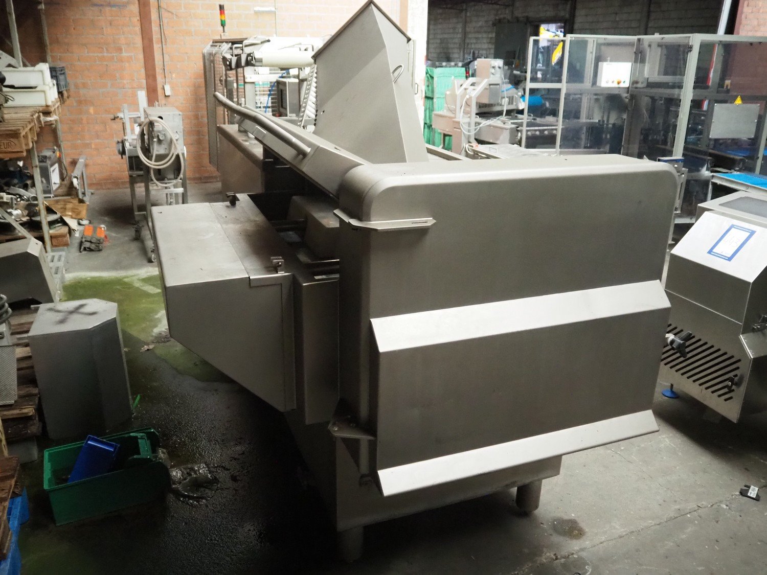 Treif dicer, model: Phoenix 120-CE SP V, number: 3050S7.130295.101489, year of construction: 2006, 400 V, 3 Ph, 50 Hz, 25 A, 9 kW, weight: 2150 KG, dimensions chamber: 120 mm x 120 mm, plastic belt, belt width: 270 mm, total dimensions: 3050 mm x 1500 mm x 2200 mm. Incomplete.