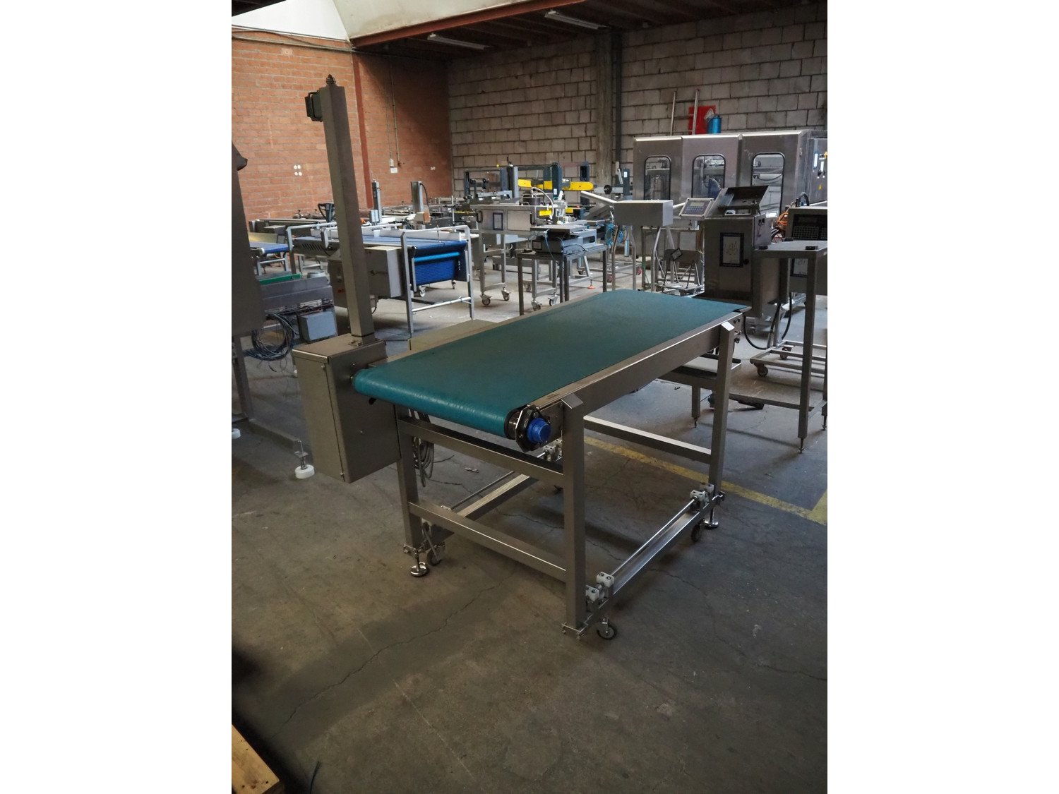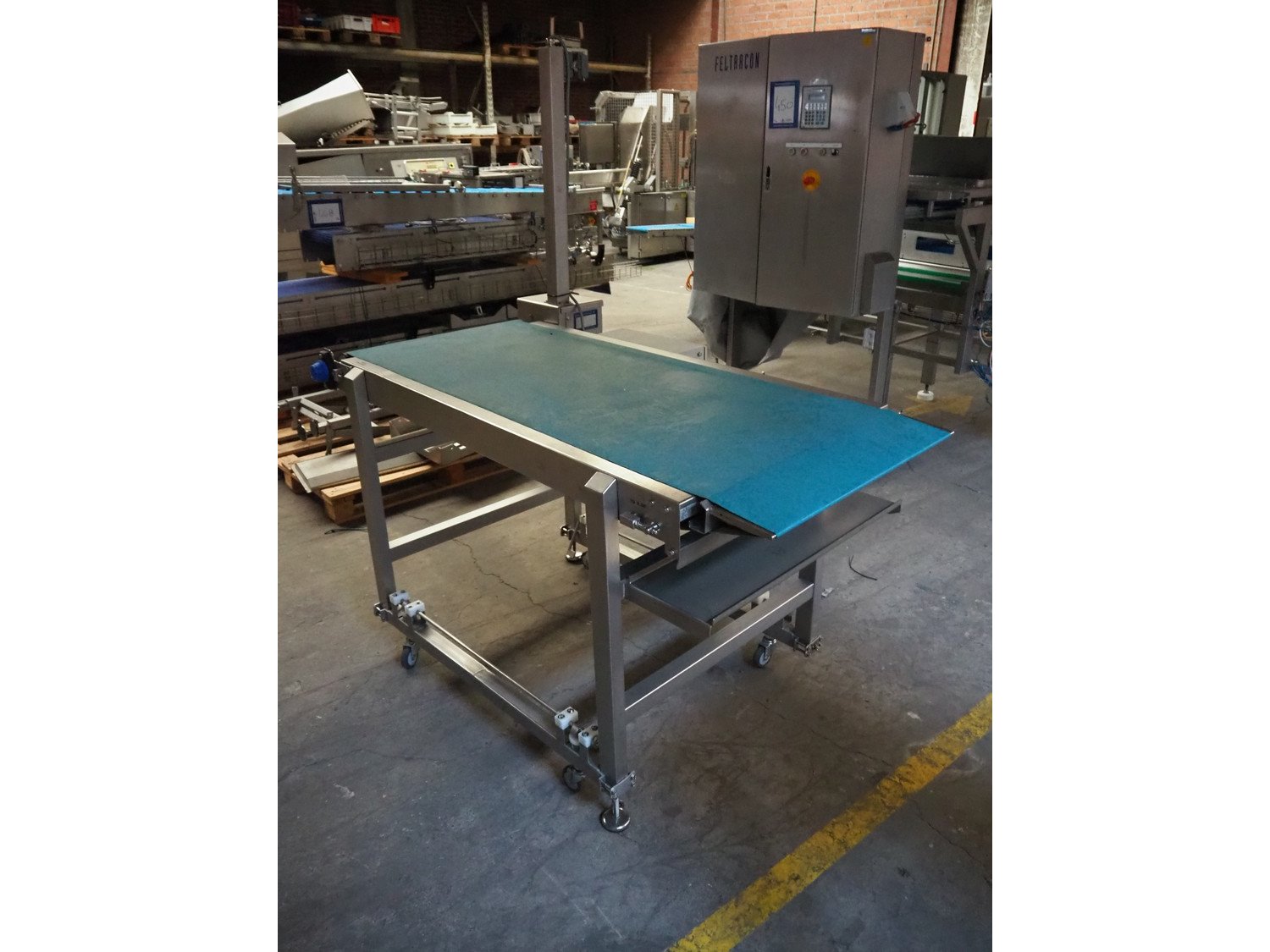 Rademaker mobile transport belt, s/s frame, plastic belt, type: VRIEZERINVOERBAAN, serial number: 6655-702, year of construction; 2004, weight: 350 KG, belt width: 670 mm, total dimensions: 1750 mm x 1080 mm x 1890 mm.