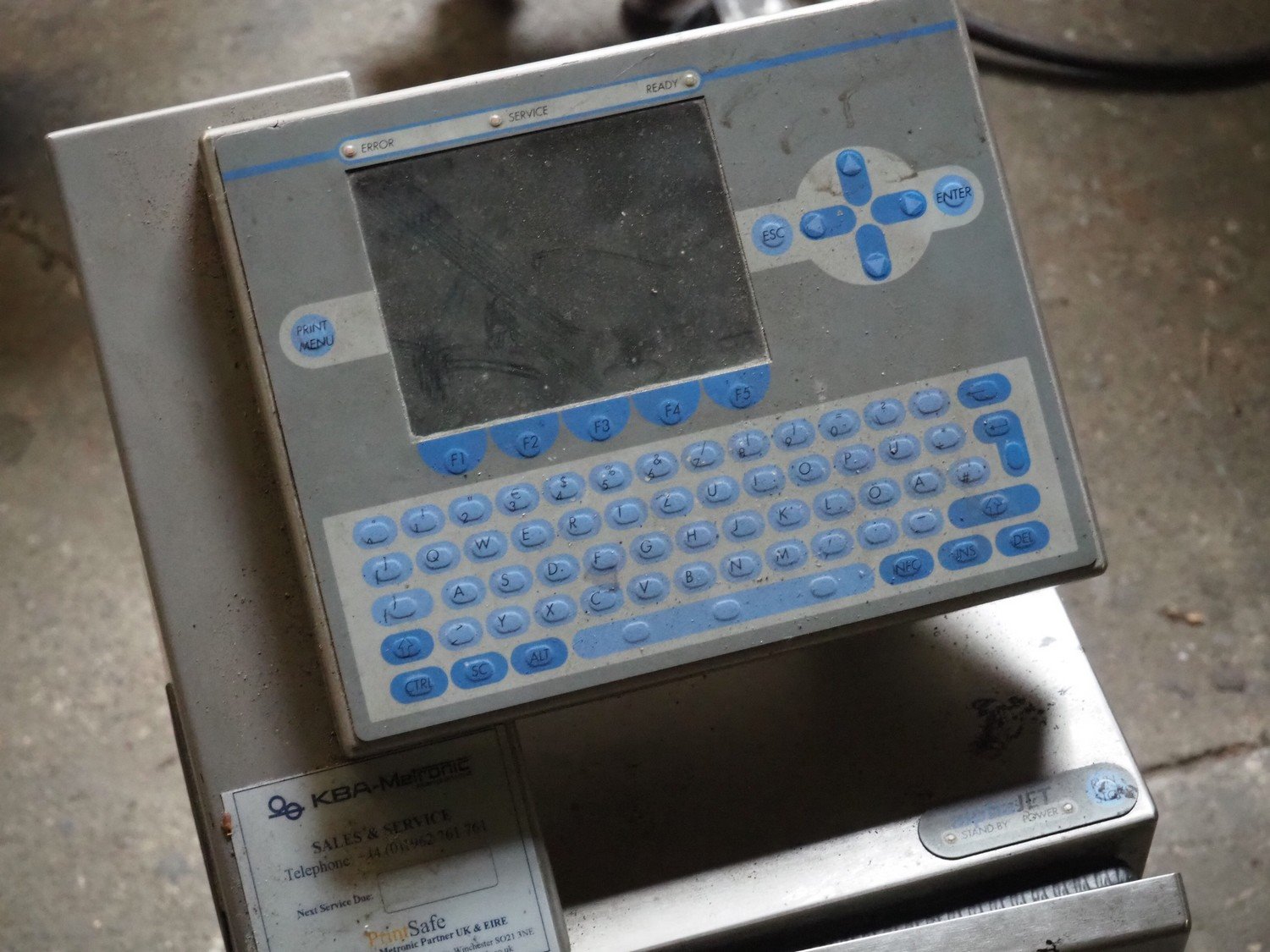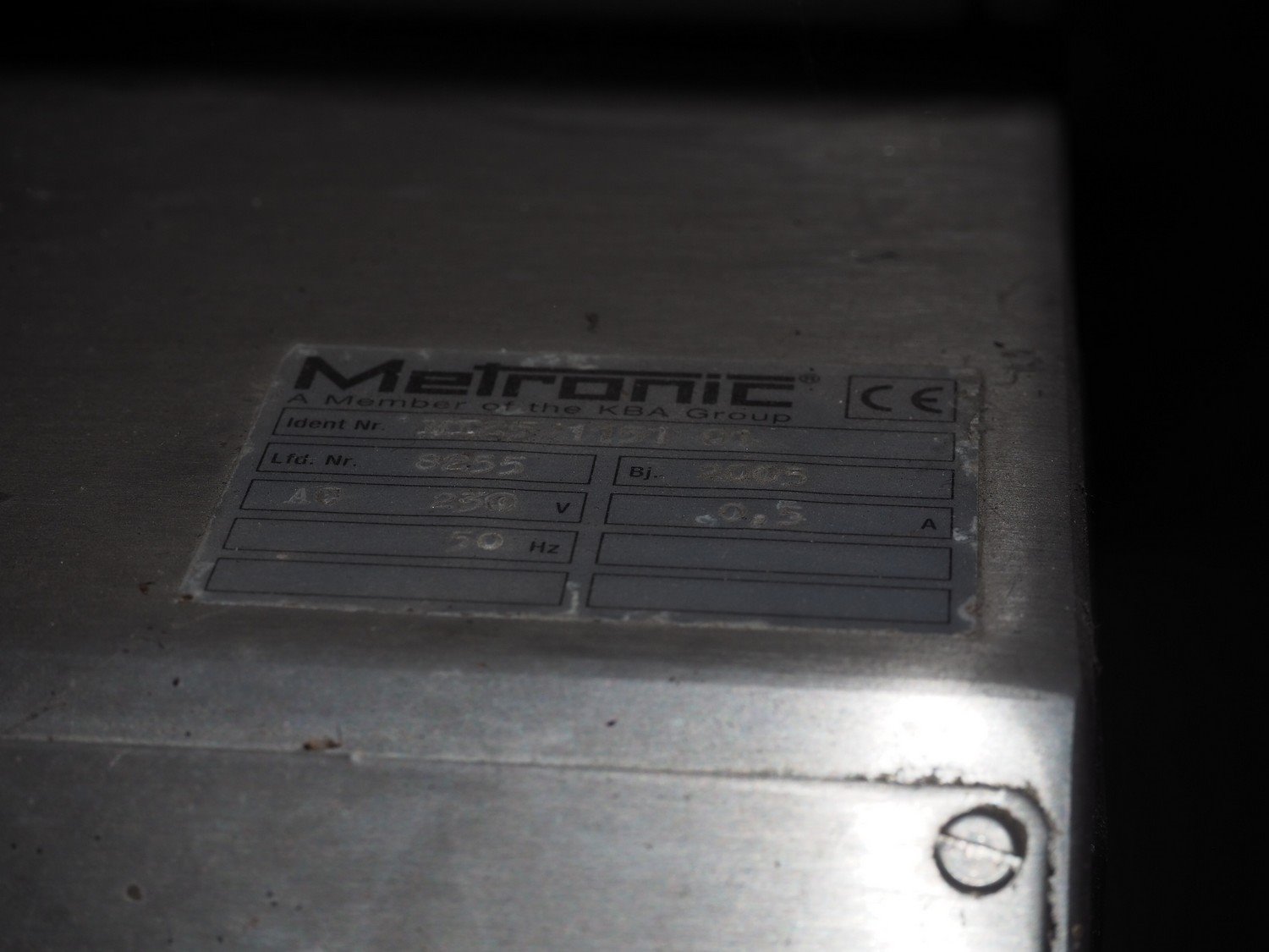 KBA Metronic GmbH inkjet printer, number: MI2500-151 01, year of construction: 2005, 230 V, 50 Hz, 0.5 A, dimensions: 300 mm x 330 mm x 660 mm.