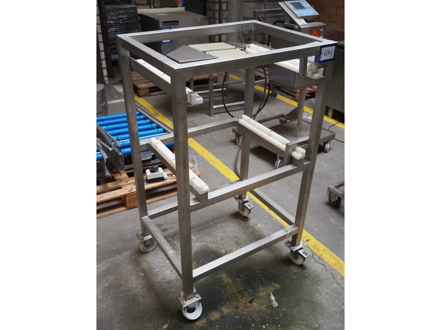 S/s trolley for traysealer dyes, dimensions: 760 mm x 580 mm x 1300 mm.