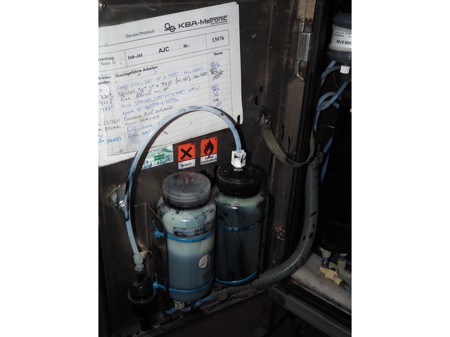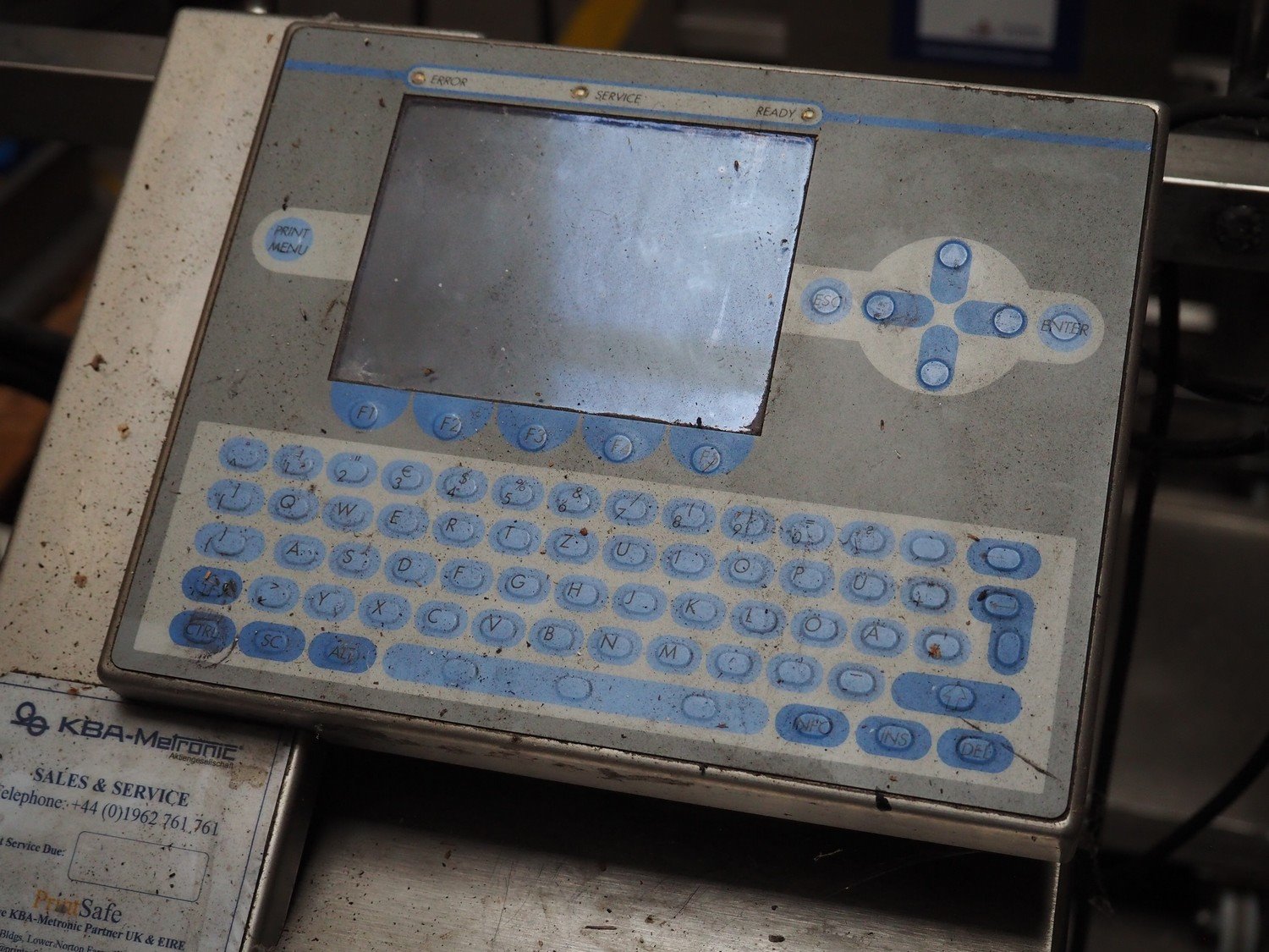 KBA Metronic GmbH inkjet printer on mobile s/s frame, number: MI2500-013076, year of construction: 2009, 230 V, 50 Hz, 0.5 A, dimensions: 870 mm x 750 mm x 1320 mm.