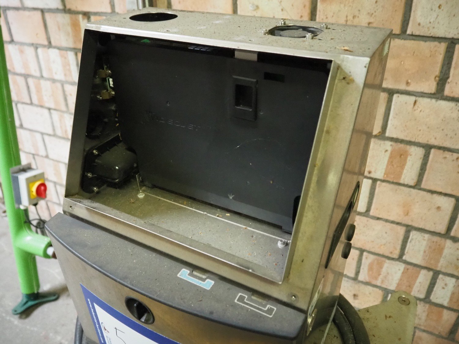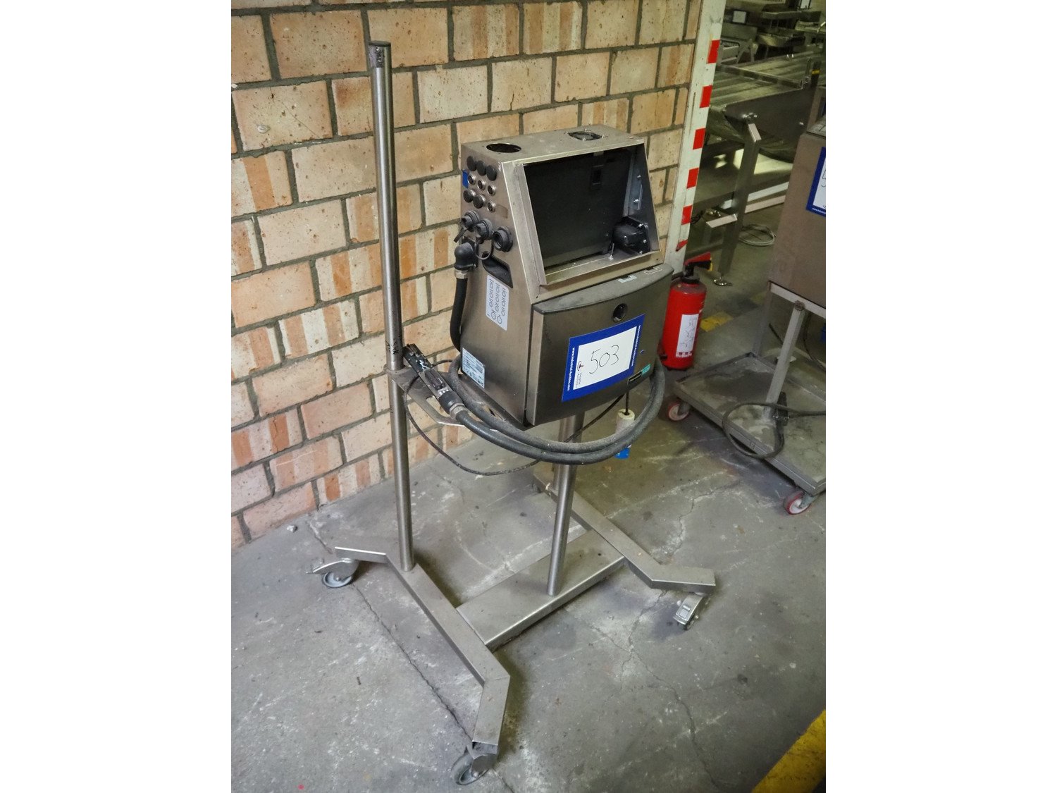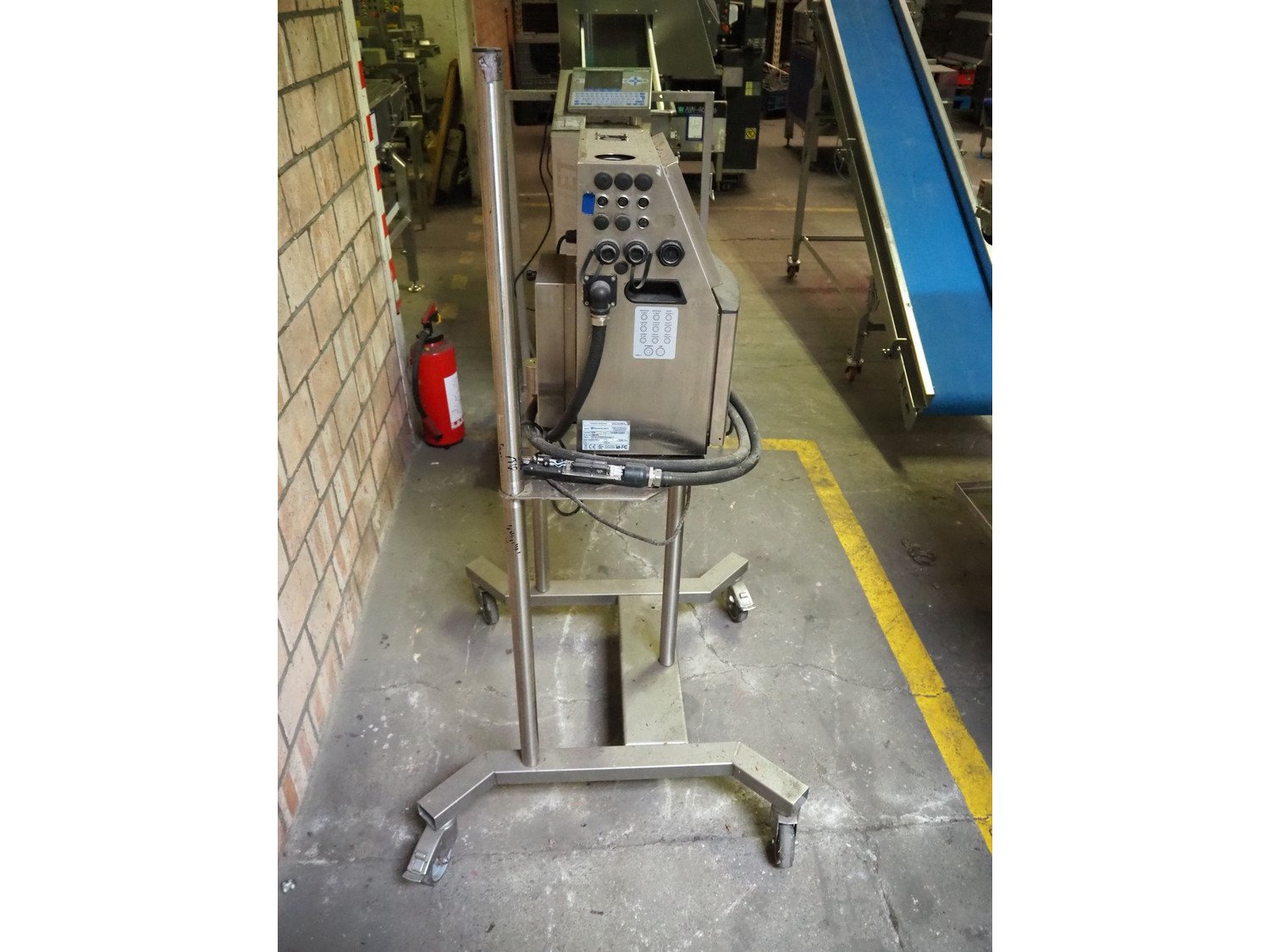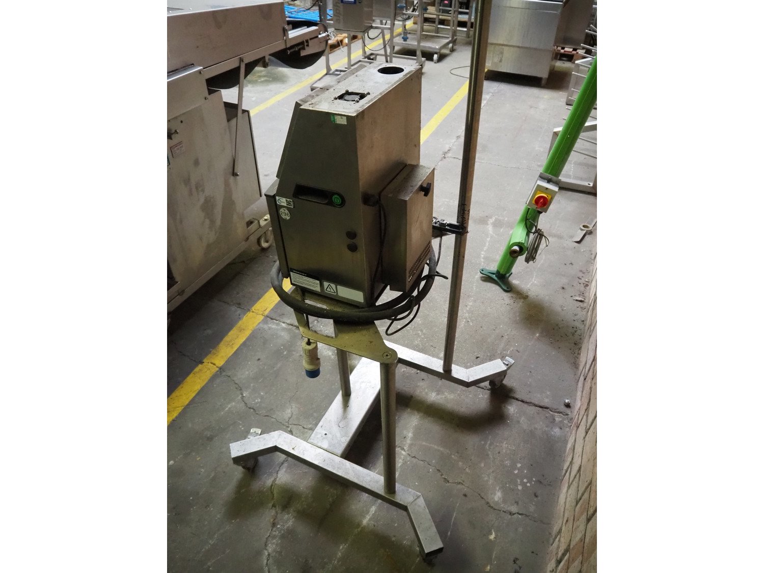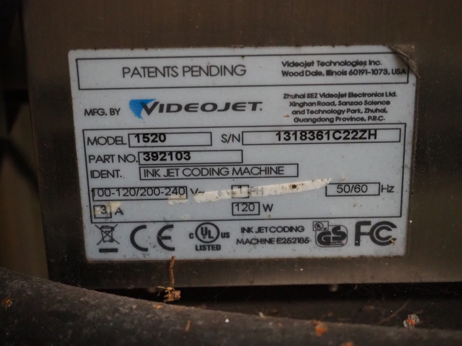 Videojet inkjet printer on mobile s/s frame, model: 1520, serial number: 1318361C22ZH, 100-120/200-240 V, 1 Ph, 50/60 Hz, 3 A, 120 W, dimensions: 830 mm x 800 mm x 1500 mm. Incomplete.