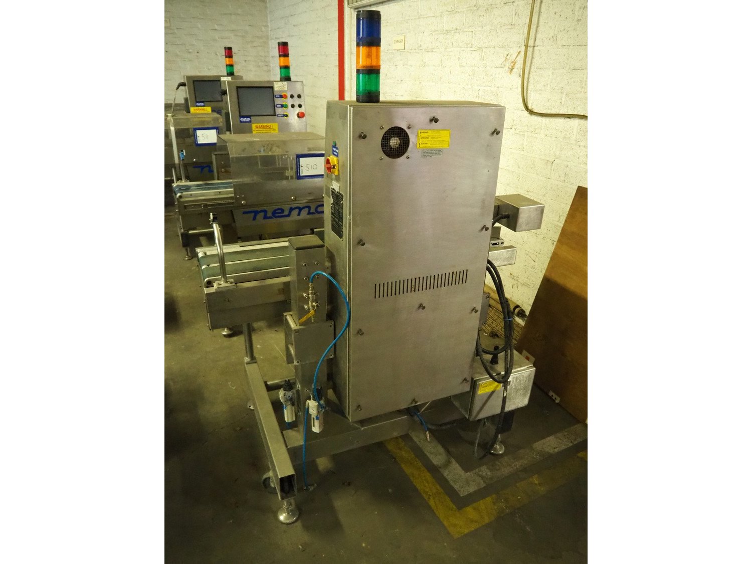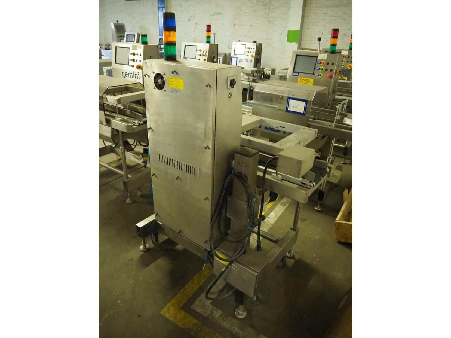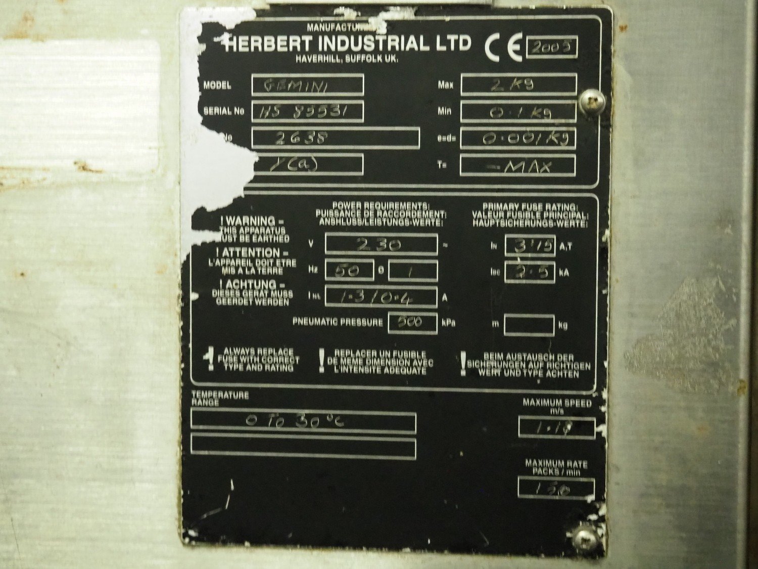 Herbert Industrial Ltd. checkweigher, model: Gemini, serial number: HS 85531, year of construction: 2005, 230 V, 1 Ph, 50 Hz, 1.3/0.4 A, capacity: 150 packages/minute, plastic belt, belt width: (2x) 100 mm, total dimensions: 1330 mm x 820 mm x 1730 mm.